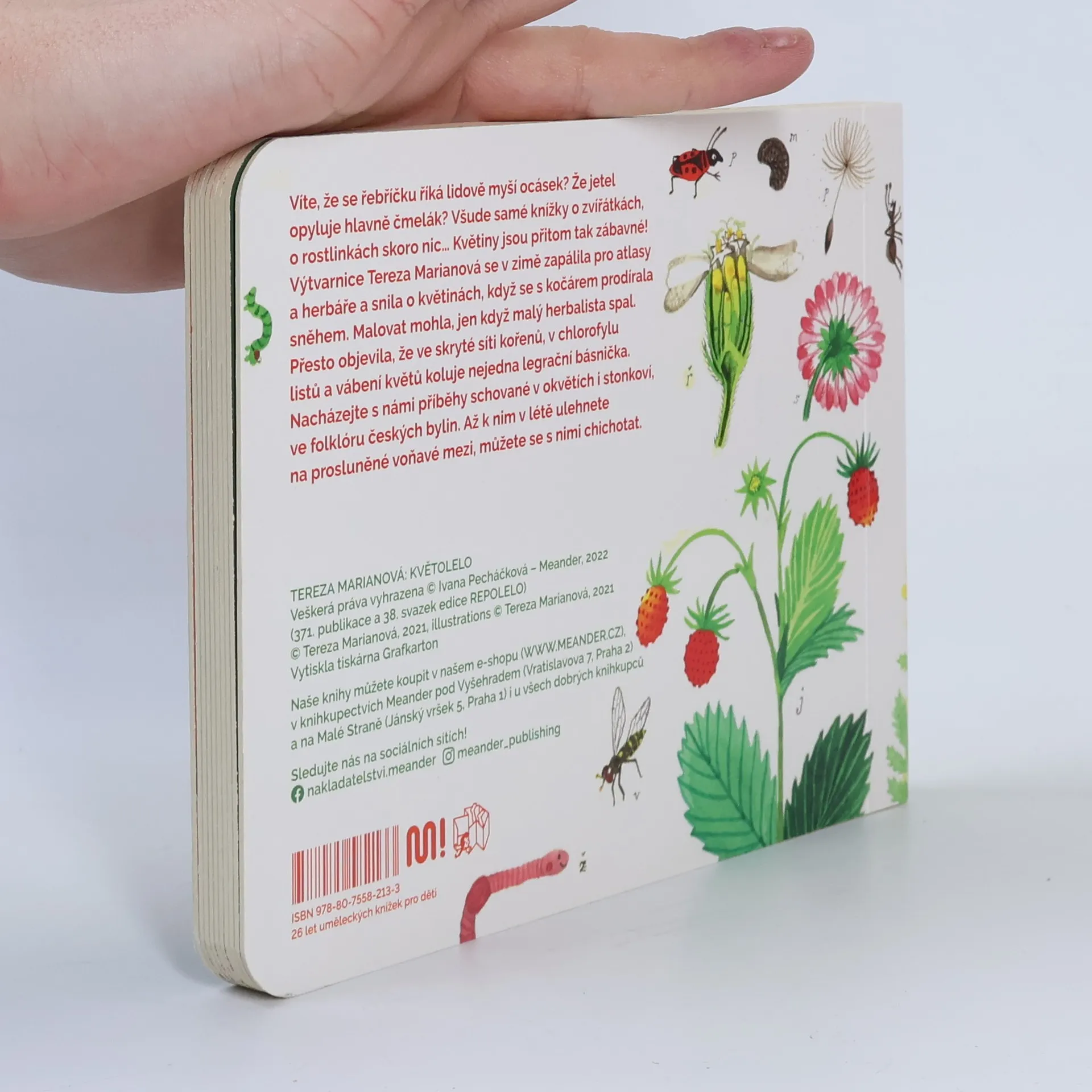 Víte, že se řebříčku říká lidově myší ocásek? Že jetel opyluje hlavně čmelák? Všude samé knížky o zvířátkách, o rostlinkách skoro nic… Květiny jsou přitom tak zábavné! Výtvarnice Tereza Marianová se v zimě zapálila pro atlasy a herbáře a snila o květinách, když se s kočárem prodírala sněhem. Malovat mohla, jen když malý herbalista spal. Přesto objevila, že ve skryté síti kořenů, v chlorofylu listů a vábení květů koluje nejedna legrační básnička. Nacházejte s námi příběhy schované v okvětích i stonkoví, ve folklóru českých bylin. Až k nim v létě ulehnete na prosluněné voňavé mezi, můžete se s nimi chichotat.