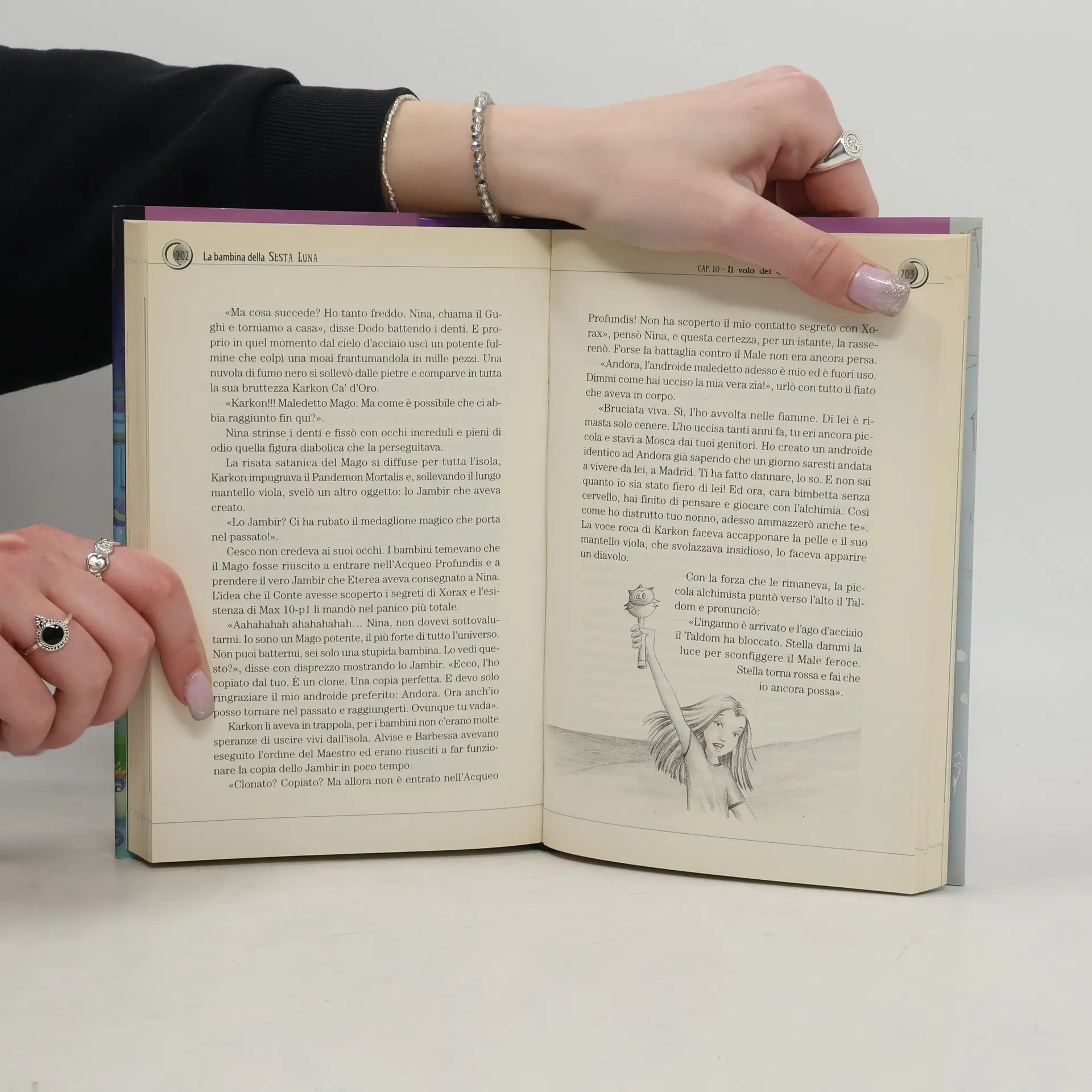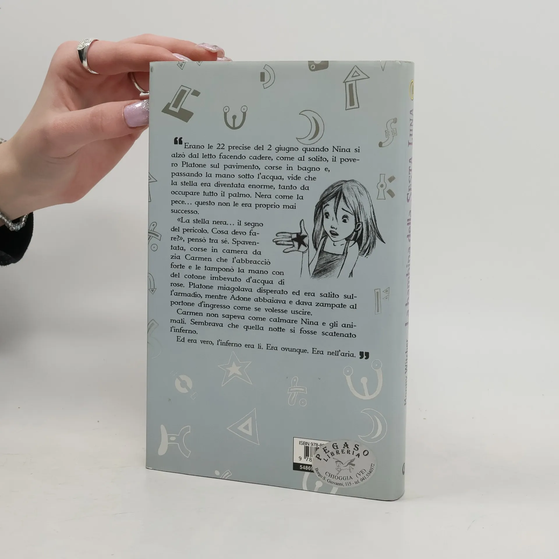 Nina fa la quinta elementare e vive con le zie a Madrid perché i suoi genitori hanno un incarico importante che li porta all'estero di continuo. Tutto appare normalissimo all'inizio, meno quella strana voglia a forma di stella sulla mano destra assolutamente identica a quella del suo amato nonno Misha, un grande alchimista che vive a Venezia. Sarà un segno del destino? Quale futuro aspetta Nina? L'alchimia, lo studio, un mondo sconosciuto...una vita completamente nuova che comincia una notte, all'improvviso, con la morte misteriosa del nonno. Nina raggiunge Venezia, accompagnata dal cane Adone e dal gatto Platone, pronta a capire cosa stia succedendo. E ancora non sa che dovrà salvare la Sesta Luna dal perfido Conte Karkon Ca' d'Oro e dai suoi bambini androidi, aiutata (per fortuna!) da quattro amici di Venezia, un androide di nome Max e uno Sbacchio? Ma che cos'è uno Sbacchio? Basta cominciare a leggere...
