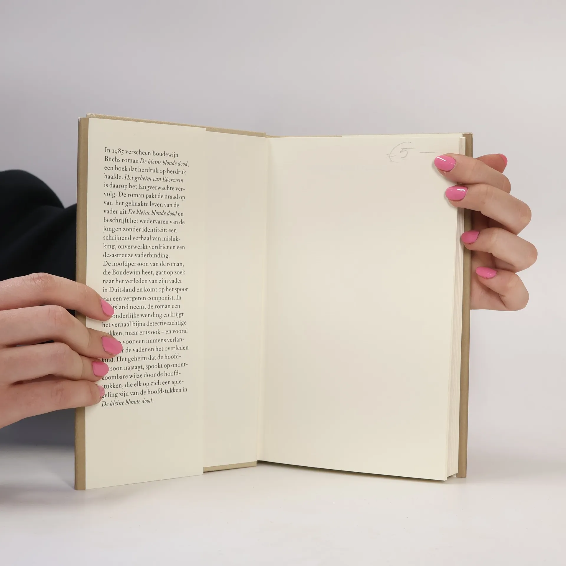 Achttien jaar na de publicatie van Boudewijn Büchs roman, waarin een vader worstelt met zijn leven en een zoon met zijn identiteit, verschijnt het langverwachte vervolg. Dit verhaal volgt de gebroken vader en de jongen zonder identiteit, en verkent thema's van mislukking, onverwerkt verdriet en een problematische vaderbinding. De hoofdpersoon, Boudewijn, gaat op zoek naar het verleden van zijn vader in Duitsland en ontdekt een componist. In Duitsland neemt het verhaal een onverwachte wending, met bijna detectiveachtige elementen, maar blijft het vooral doordrongen van een diep verlangen naar de vader en het overleden kind. Het geheim dat Boudewijn nastreeft, doordrenkt de hoofdstukken, die elk een reflectie zijn van de eerdere roman. Dit postuum verschenen, autobiografische verhaal biedt nieuwe inzichten in het verdriet dat de vorige roman zo aangrijpend maakte. Het onthult een huiveringwekkende geschiedenis die vastzat in een archief in Duitsland. De hoofdpersoon probeert zijn verleden en de complexe relatie met zijn vader te begrijpen. De liefde tussen hen is onvoorwaardelijk, maar de oorlog heeft de vader veranderd in een onbegrijpelijke man. Het verhaal, dat zich richt op de pianobewerking van een muziekstuk van Eberwein, springt tussen heden en verleden, wat soms leidt tot een onduidelijke structuur. Het boek is bijzonder voor lezers van de eerdere roman.