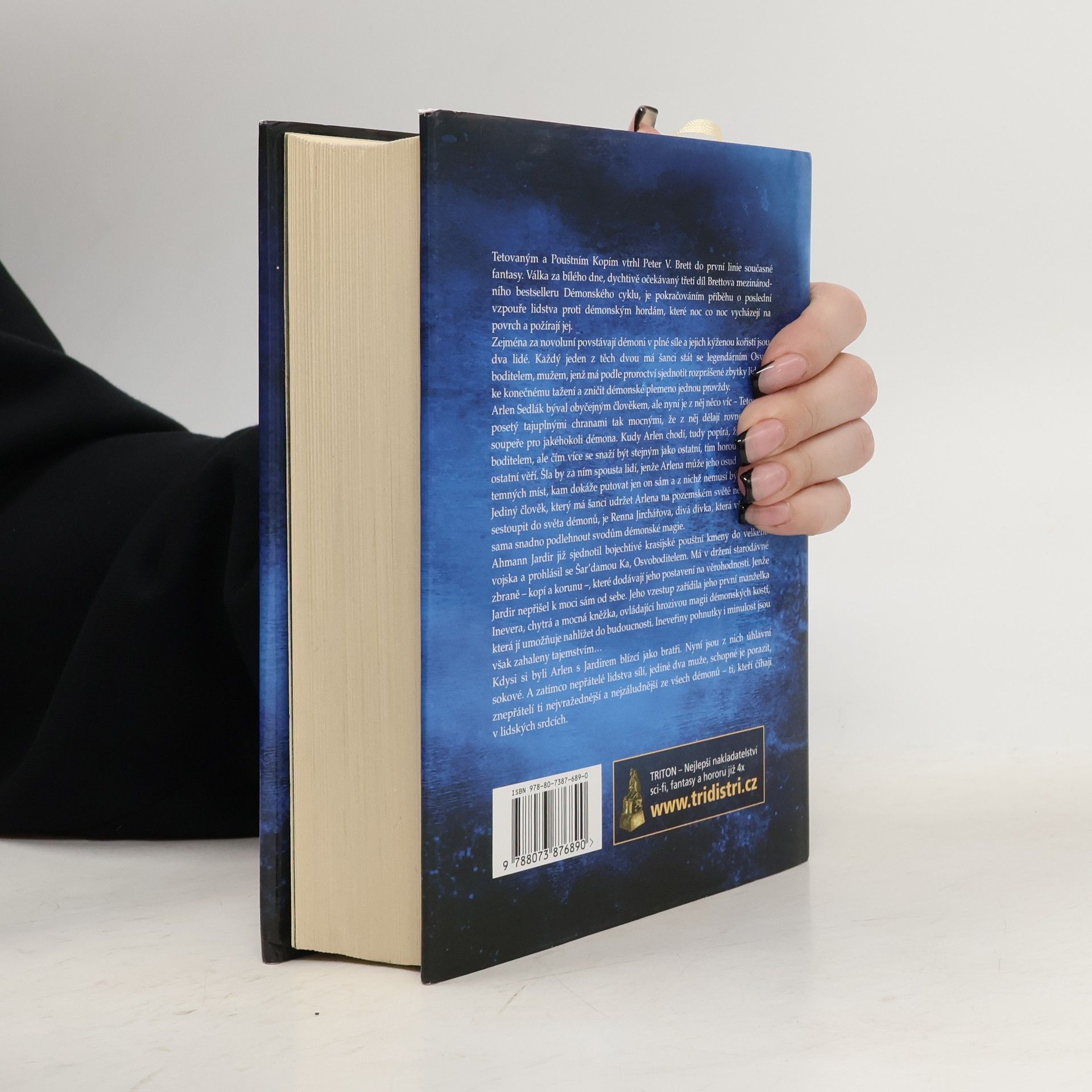 Válka za bílého dne, dychtivě očekávaný třetí díl Brettova mezinárodního bestselleru Démonského cyklu, je pokračováním příběhu o poslední vzpouře lidstva proti démonským hordám, které noc co noc vycházejí na povrch a požírají jej. Zejména za novoluní povstávají démoni v plné síle a jejich kýženou kořistí jsou dva lidé. Každý jeden z těch dvou má šanci stát se legendárním Osvoboditelem, mužem, jenž má podle proroctví sjednotit rozprášené zbytky lidstva ke konečnému tažení a zničit démonské plemeno jednou provždy. Arlen Sedlák býval obyčejným člověkem, ale nyní je z něj něco víc – Tetovaný, posetý tajuplnými chranami tak mocnými, že z něj dělají rovnocenného soupeře pro jakéhokoli démona. Ahmann Jardir již sjednotil bojechtivé krasijské pouštní kmeny do velkého vojska a prohlásil se Šar'damou Ka, Osvoboditelem. Jeho vzestup zařídila jeho první manželka Inevera, chytrá a mocná kněžka, ovládající hrozivou magii démonských kostí, která jí umožňuje nahlížet do budoucnosti. Kdysi si byli Arlen s Jardirem blízcí jako bratři. Nyní jsou z nich úhlavní sokové. A zatímco nepřátelé lidstva sílí, jediné dva muže, schopné je porazit, znepřátelí ti nejvražednější a nejzáludnější ze všech démonů – ti, kteří číhají v lidských srdcích -- 1. vydání. -- zdroj: www.legie.info --