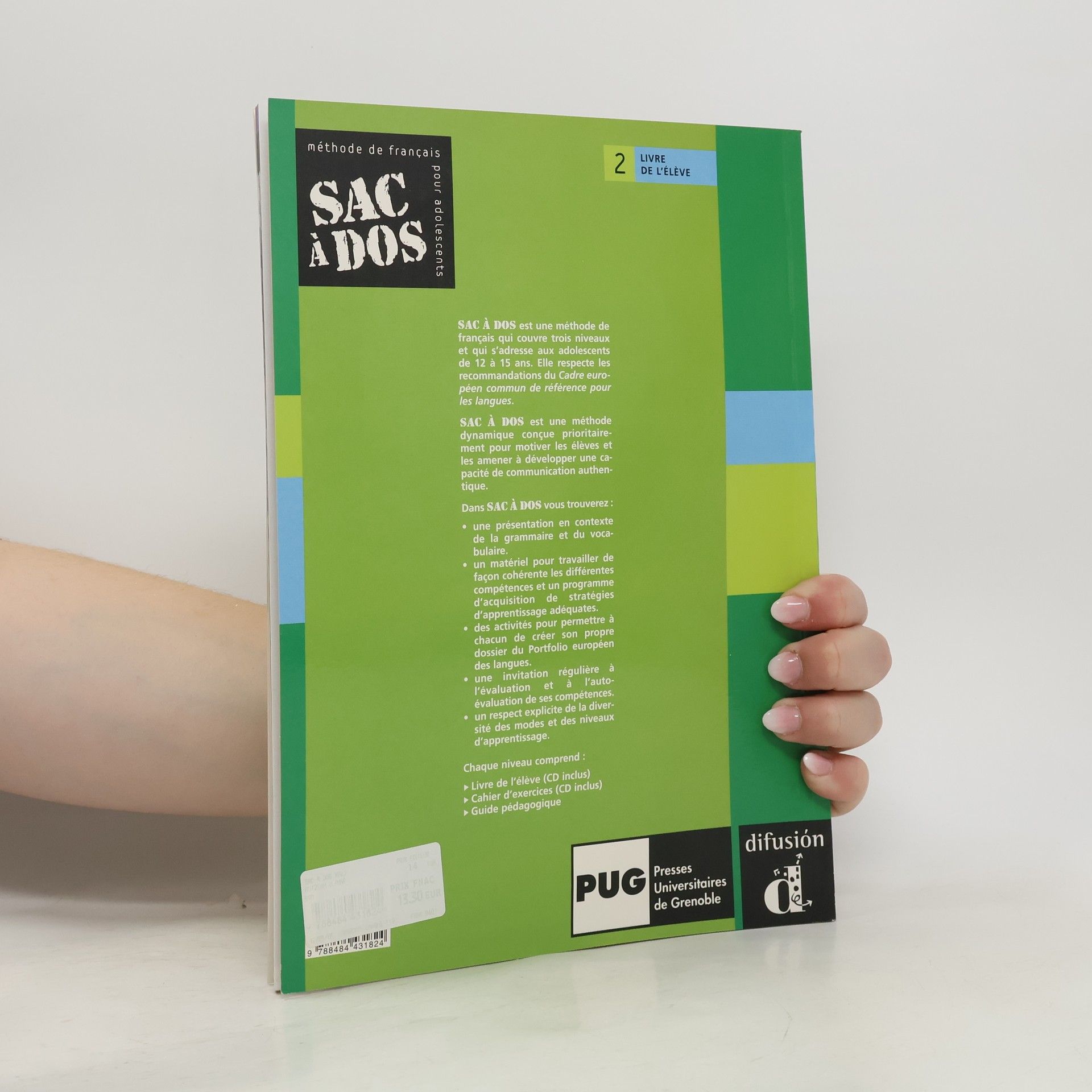 Sac à Dos est une méthode de français qui couvre trois niveau et qui s'adresse aux adolescents de 12 à 15 ans. Elle respecte les recommandations du Cadre européen commun de référence pour les langues. Sac à Dos est une méthode dynamique conçue prioritairement pour motiver les élèves et les amener à développer une cité de communication authentique. Dans Sac à Dos vous trouverez une présentation en contexte de la grammaire et du vocabulaire ; un matériel pour travailler de façon cohérente les différentes compétences et un programme d'acquisition de stratégies d'apprentissage adéquates ; des activités pour permettre à chacun de créer son propre dossier du Portfolio européen des langues. Une invitation régulière à l'évaluation et à l'auto-évaluation de ses compétences ; un respect explicite de la diversité des modes et des niveaux d'apprentissage.