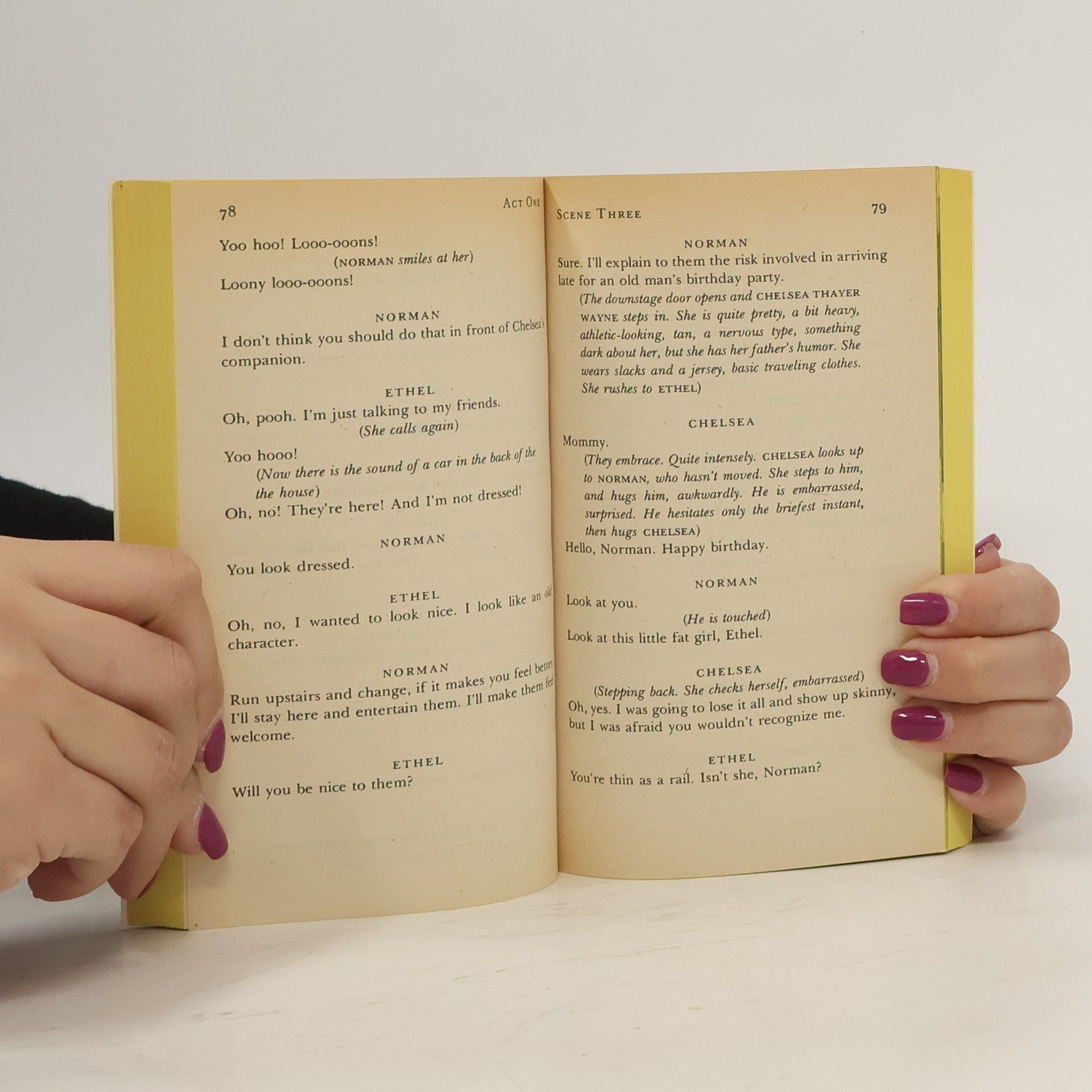 This is the love story of Ethel and Norman Thayer, who are returning to their summer home on Golden Pond for the forty-eighth year. He is a retired professor, nearing eighty, with heart palpitations and a failing memory-but still as tart-tongued, observant and eager for life as ever. Ethel, ten years younger, and the perfect foil for Norman, delights in all the small things that have enriched and continue to enrich their long life together. They are visited by their divorced, middle-aged daughter and her dentist fianc�, who then go off to Europe, leaving his teenage son behind for the summer. The boy quickly becomes the "grandchild" the elderly couple have longed for, and as Norman revels in taking his ward fishing and thrusting good books at him, he also learns some lessons about modern teenage awareness-and slang-in return. In the end, as the summer wanes, so does their brief idyll, and in the final, deeply moving moments of the play, Norman and Ethel are brought even closer together by the incidence of a mild heart attack. Time, they know, is now against them, but the years have been good and, perhaps, another summer on Golden Pond still awaits.