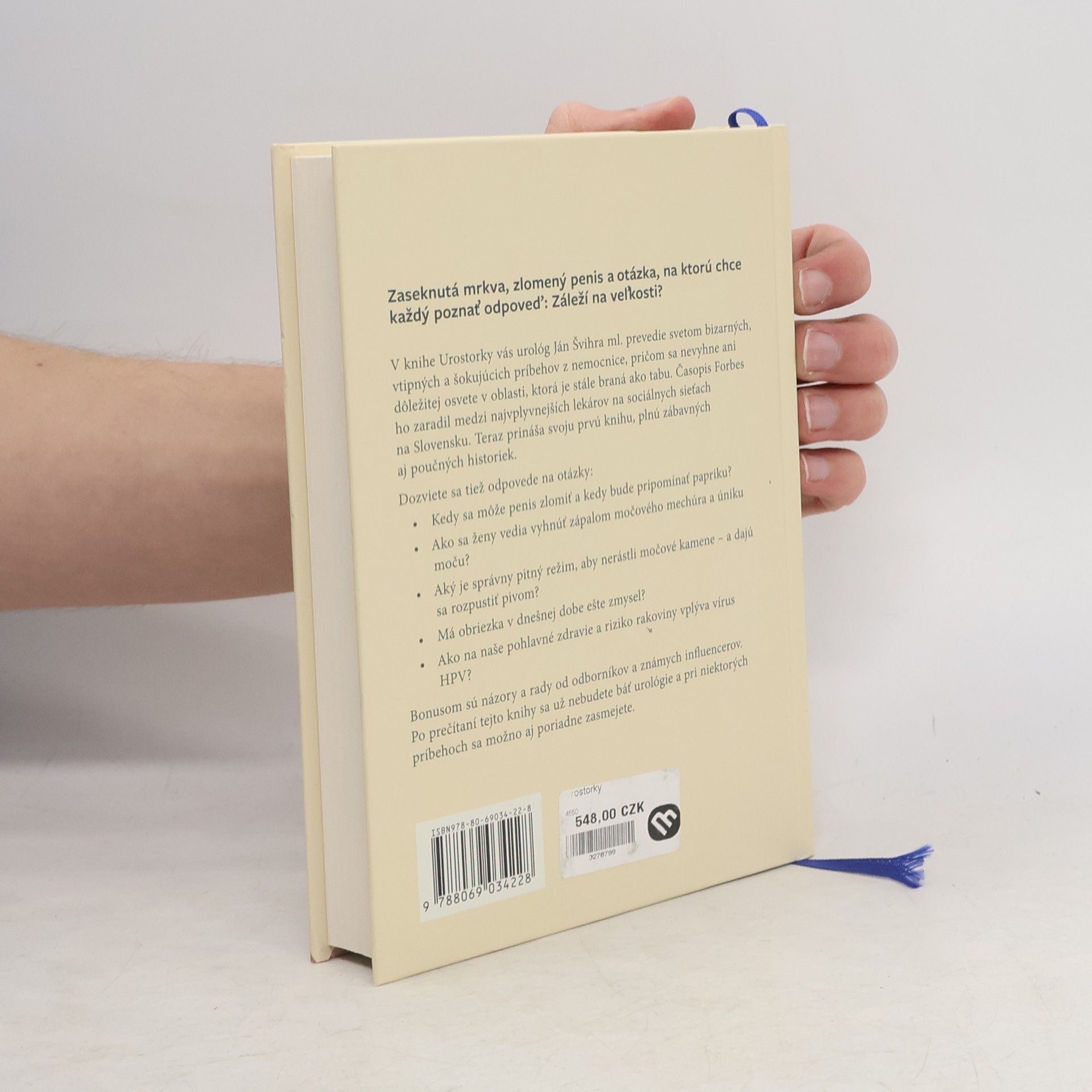Zaseknutá mrkva, zlomený penis a otázka, na ktorú chce každý poznať odpoveď: Záleží na veľkosti? V knihe Urostorky vás urológ Ján Švihra ml. prevedie svetom bizarných, vtipných a šokujúcich príbehov z nemocnice, pričom sa nevyhne ani dôležitej osvete v oblasti, ktorá je stále braná ako tabu. Časopis Forbes ho zaradil medzi najvplyvnejších lekárov na sociálnych sieťach na Slovensku. Teraz prináša svoju prvú knihu plnú zábavných aj poučných historiek. Dozviete sa tiež odpovede na otázky: Kedy sa môže penis zlomiť a kedy bude pripomínať papriku? Ako sa ženy vedia vyhnúť zápalom močového mechúra a úniku moču? Aký je správny pitný režim, aby nerástli močové kamene – a dajú sa rozpustiť pivom? Má obriezka v dnešnej dobe ešte zmysel? Ako na naše pohlavné zdravie a riziko rakoviny vplýva vírus HPV? Bonusom sú názory a rady od odborníkov a známych influencerov. Po prečítaní tejto knihy sa už nebudete báť urológie a pri niektorých príbehoch sa možno aj poriadne zasmejete.