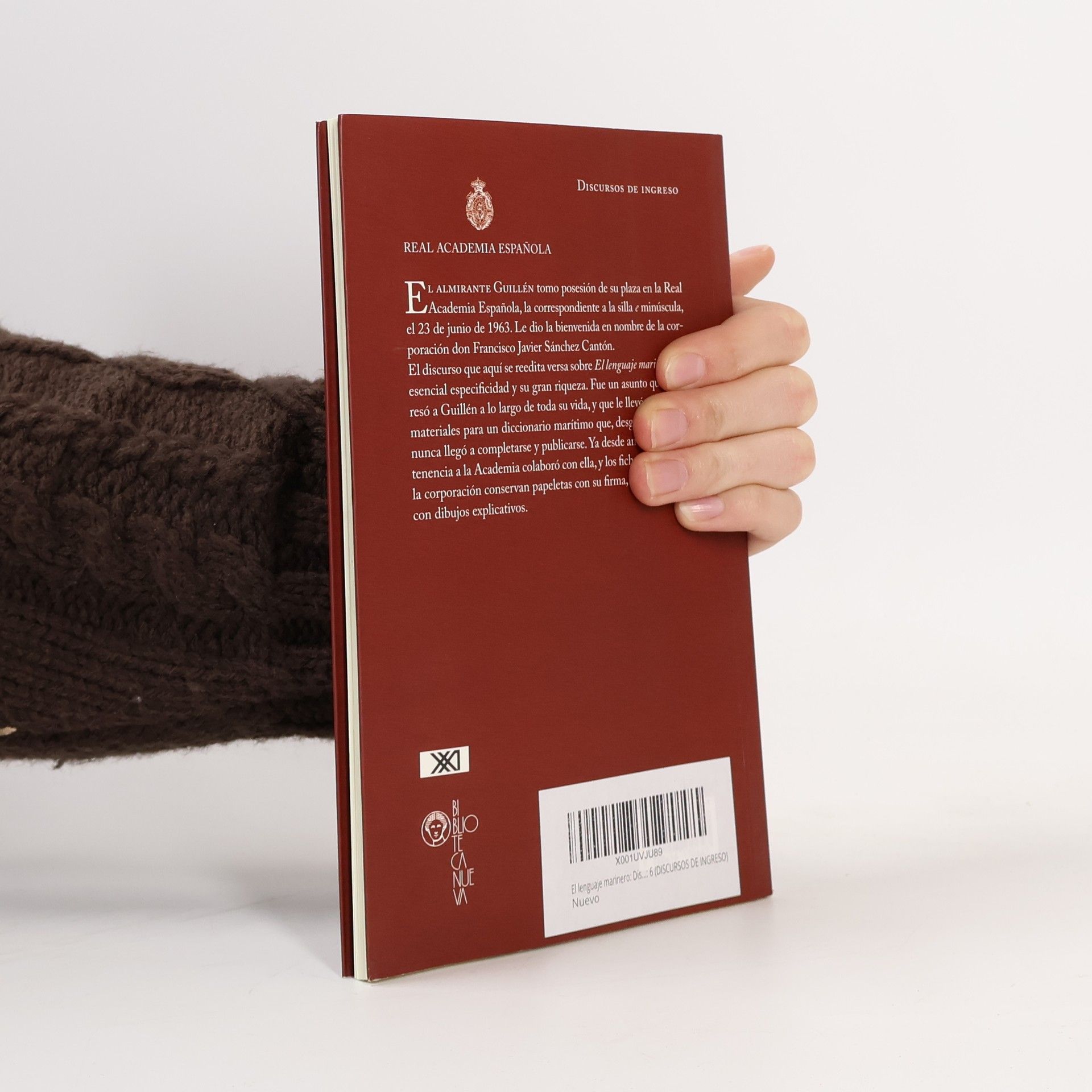 El almirante Guillén tomo posesión de su plaza en la Real Academia Española, la correspondiente a la silla e minúscula, el 23 de junio de 1963. Le dio la bienvenida en nombre de la corporación don Francisco Javier Sánchez Cantón. El discurso que aquí se reedita versa sobre El lenguaje marinero, su esencial especificidad y su gran riqueza. Fue un asunto que interesó a Guillén a lo largo de toda su vida, y que le llevó a recopilar materiales para un diccionario marítimo que, desgraciadamente, nunca llegó a completarse y publicarse. Ya desde antes de su pertenencia a la Academia colaboró con ella, y los ficheros léxicos de la corporación conservan papeletas con su firma, algunas incluso con dibujos explicativos.