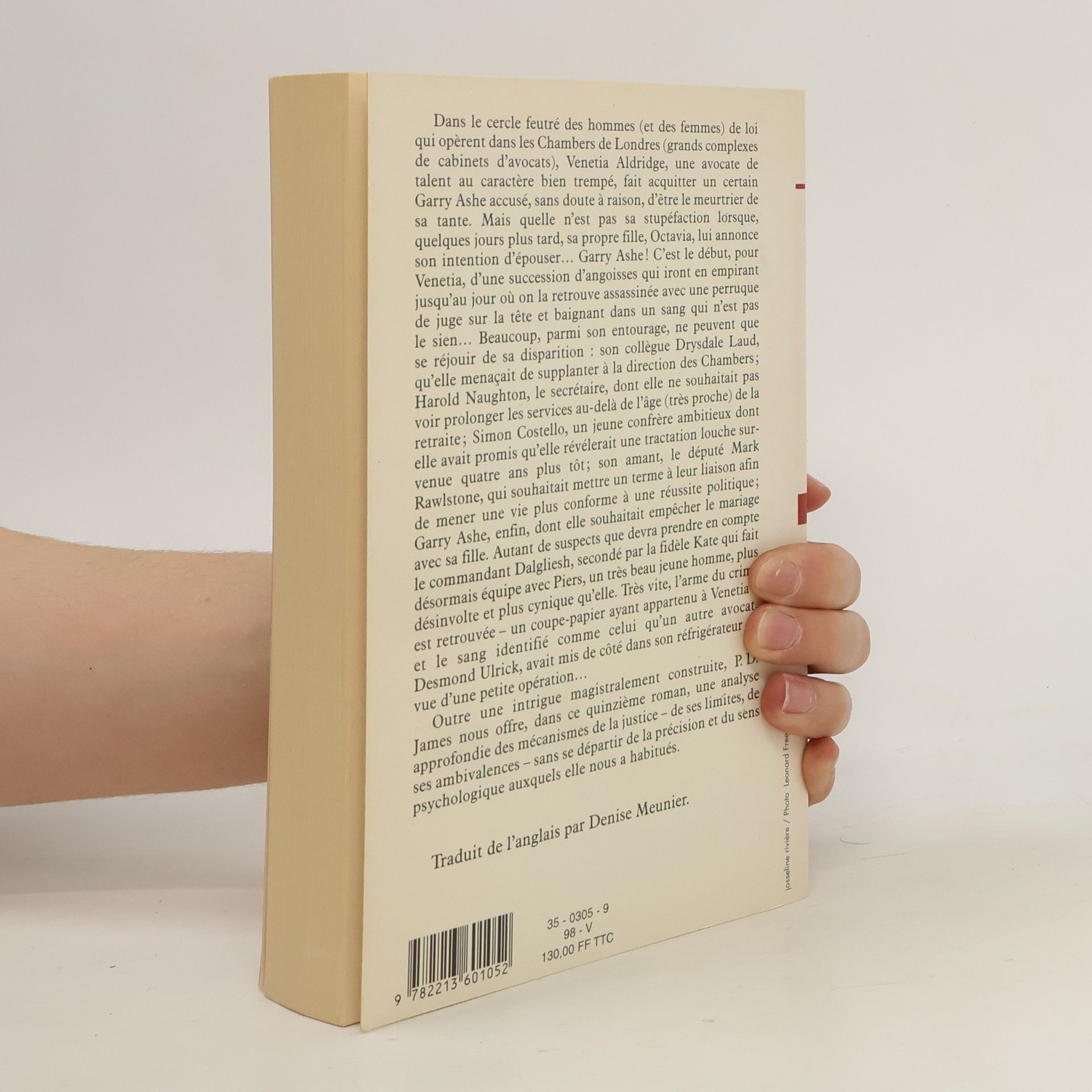 Dans le cercle feutré des hommes (et des femmes) de loi qui opèrent dans les Chambers de Londres (grands complexes de cabinets d'avocats), Venetia Aldridge, une avocate de talent au caractère bien trempé, fait acquitter un certain Garry Ashe accusé, sans doute à raison, d'être le meurtrier de sa tante. Mais quelle n'est pas sa stupéfaction lorsque, quelques jours plus tard, sa propre fille, Octavia, lui annonce son intention d'épouser... Garry Ashe ! C'est le début, pour Venetia, d'une succession d'angoisses qui iront en empirant jusqu'au jour où on la retrouve assassinée avec une perruque de juge sur la tête et baignant dans un sang qui n'est pas le sien... Beaucoup, parmi son entourage, ne peuvent que se réjouir de sa disparition : son collègue Drysdale Laud, qu'elle menaçait de supplanter à la direction des Chambers ; harold Naughton, le secrétaire, dont elle ne souhaitait pas voir prolonger les services au-delà de l'âge (très proche) de la retraite ; Simon Costello, un jeune confrère ambitieux dont elle avait promis qu'elle révélerait une tractation louche survenue quatre ans plus tôt ; son amant, le député Mark Rawlstone, qui souhaitait mettre un terme à leur liaison afin de mener une vie plus conforme à une réussite politique ; Garry Ashe, enfin, dont elle souhaitait empêcher le mariage avec sa fille. Autant de suspects que devra prendre en compte le commandant Dalgliesh, secondé par la fidèle Kate qui fait désormais équipe avec Piers, un très beau jeune homme, plus désinvolte et plus cynique qu'elle. Très vite, l'arme du crime est retrouvée - un coupe-papier ayant appartenu à Venetia - et le sang identifié comme celui qu'un autre avocat, Desmond d'Ulrick, avait mis de côté dans son réfrigérateur en vue d'une petite opération... Outre une intrigue magistralement construite, P. D. James nous offre, dans ce quinzième roman, une analyse approfondie des mécanismes de la justice - de ses limites, de ses ambivalences - sans se départir de la précision et du sens psychologique auxquels elle nous a habitués.