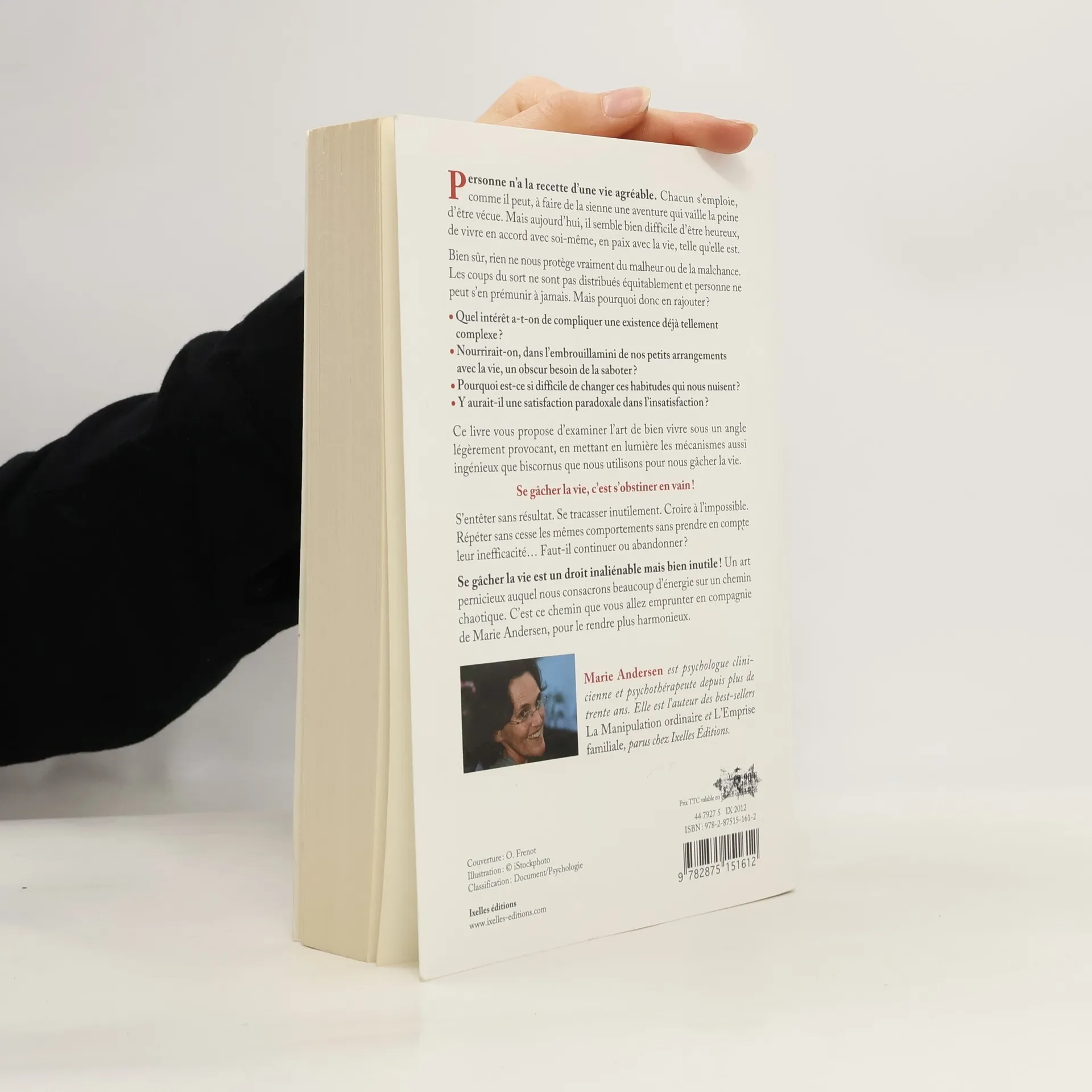 Personne na (TM)a la recette da (TM)une vie agrA(c)able. Pourtant chacun sa (TM)emploie, comme il peut, A faire de la sienne une aventure qui vaille la peine da (TM)Aatre vA(c)cue. Malheureusement, on est souvent loin du compte !A NA(c)s dans le confort, nous avons bien plus qua (TM)il na (TM)en faut pour nous concocter une vie assez plaisante, manger A notre faim, avoir quelques bons amis, aider nos enfants A grandir et nous rA(c)jouir da (TM)Aatre en vie. Rien ne nous empAache da (TM)inventer, de partager, da (TM)A(c)voluer ou de simplement contempler la nature au fil des saisons. Le bonheur est dans le creux de la main. Et pourtant ! Il semble parfois si difficile da (TM)Aatre heureux, de vivre en accord avec soi-mAame, en paix avec la vie, telle qua (TM)elle est. Bien sAr, rien ne nous protA]ge totalement du malheur ou de la malchance; les coups du sort ne sont pas distribuA(c)s A(c)quitablement et nous ne pouvons pas tout contrAler, loin sa (TM)en faut. a [ Les tuiles tomberont au grA(c) des tempAates, personne ne peut sa (TM)en prA(c)munir A jamais, mais pourquoi donc en rajouter ? a [ Pourquoi se compliquer une existence qui na (TM)est dA(c)jA pas si simple A gA(c)rer ? a [ Nourrirait-on, dans la (TM)embrouillamini de nos petits arrangements avec la vie, un obscur besoin de la saboter ? a [ Y aurait-il une tendance inconsciente A trouver une satisfaction paradoxale dans la (TM)insatisfaction, un plaisir dans le dA(c)plaisir ? Ce livre propose da (TM)examiner la (TM)art de bien vivre sous un angle lA(c)gA]rement provoquant, en mettant en lumiA]re les mA(c)canismes aussi ingA(c)nieux que biscornus que nous utilisons, souvent A notre insu, pour nous gA[cher la vie . Se gA[cher la vie, ca (TM)est sa (TM)obstiner en vain ! Sa (TM)entAater sans rA(c)sultat. Se tracasser inutilement. Croire A la (TM)impossible. Rester assis sur ses idA(c)es sans les remettre en question. RA(c)pA(c)ter encore et encore les mAames comportements sans prendre en compte leur inefficacitA(c). On se gA[che la vie parce qua (TM)on raisonne mal, parce qua (TM)on ne change rien ou parce qua (TM)on agit de faAon inappropriA(c)e. On na (TM)arrive pas A prendre du recul, on ne comprend pas, on se dA(c)courage accrochA(c) A soi-mAame, hors du temps, hors du vrai, hors du rA(c)el. Tout est lA ! Faut-il continuer ou abandonner ? Comment sortir de son enfermement ? Jusqua (TM)oA rester fidA]le A soi-mAame ? Quand faut-il renoncer A sa (TM)acharner ? Il na (TM)est pas simple de dA(c)finir si une action est vaine ou si, avec le temps, elle pourrait sa (TM)avA(c)rer efficace ? Comment savoir si la persA(c)vA(c)rance sera mortifA]re ou fructueuse ? La (TM)immobilisme serait-il un bon chemin vers la paix ? Faut-il vraiment que nos actions soient utiles ? Si tout na (TM)est que vanitA(c) et poursuite du vent, na (TM)y a-t-il pas quelque attrait A la futilitA(c) ou la (TM)insignifiance ? Se gA[cher la vie est un droit inaliA(c)nable mais bien inutile ! Un art pernicieux auquel nous consacrons beaucoup da (TM)A(c)nergie sur un chemin chaotique. Ca (TM)est ce chemin que vous allez emprunter en compagnie de Marie Andersen, pour le rendre plus harmonieux. A propos de l'auteur Marie Andersen est psychologue clinicienne et psychothA(c)rapeute depuis plus de trente ans. Elle a publiA(c) prA(c)cA(c)demment deux best-sellers: La Manipulation ordinaire et la (TM)Emprise familiale. Un livre publiA(c) par Ixelles A(c)ditions Visitez notre site: http: // www.ixelles-editions.com Contactez-nous A l'adresse contact@ixelles-editions.com