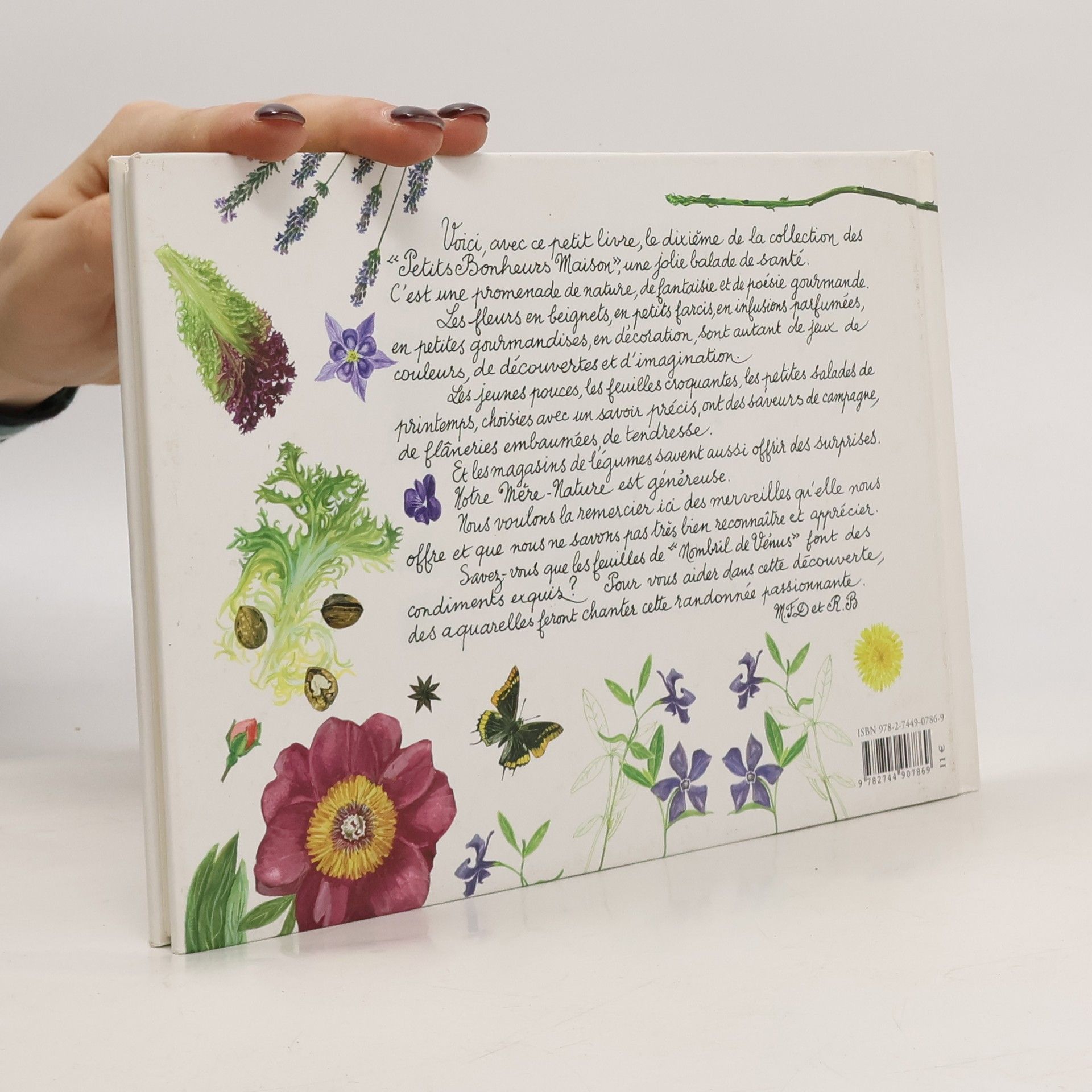 Voici, avec ce petit livre, le dixième de la collection des " Petits Bonheurs Maison ", une jolie balade de santé. C'est une promenade de nature, de fantaisie et de poésie gourmande. Les fleurs en beignets, en petits farcis, en infusions parfumées, en petites gourmandises, en décoration, sont autant de jeux de couleurs, de découvertes et d'imagination. Les jeunes pouces, les feuilles croquantes, les petites salades de printemps, choisies avec un savoir précis, ont des saveurs de campagne, de flâneries embaumées, de tendresse. Et les magasins de légumes savent aussi offrir des surprises. Votre Mère Nature est généreuse. Nous voulons le remercier ici des merveilles qu'elle nous offre et que nous ne savons pas très bien reconnaître et apprécier. Savez-vous que les feuilles de " Nombril de Vénus " font des condiments exquis ? Pour vous aidez dans cette découverte, des aquarelles feront chanter cette randonnée passionnante.