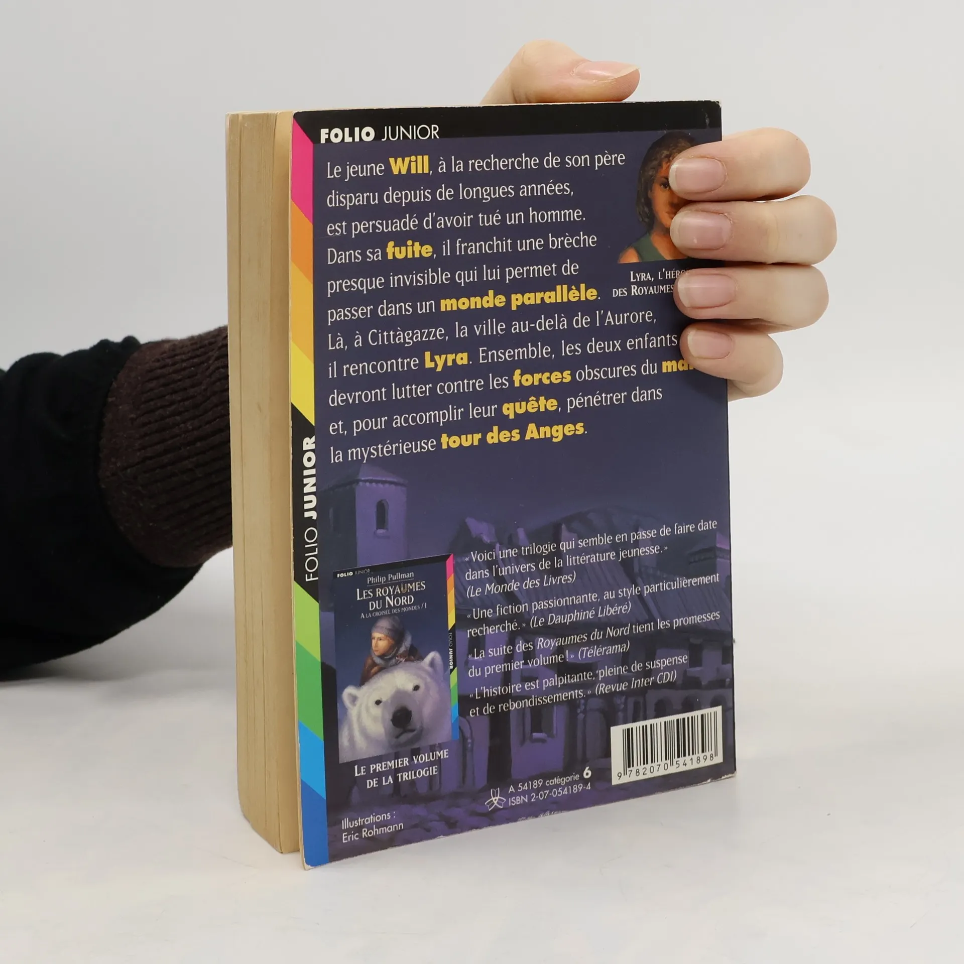 À la fin du premier volet, Les Royaumes du Nord, on avait quitté la jeune Lyra au moment où elle franchissait le pont entre deux mondes édifié par son père. On la retrouve donc dans un autre univers, où elle est rejointe par Will, débarqué, lui, d'un troisième monde très semblable au nôtre. On retrouve aussi la glaçante Mme Coulter, l'intrépide Lee Scoresby, entre autres personnages découverts dans le premier tome et désormais familiers. Apparaissent de nouveaux amis, mais aussi de nouveaux ennemis redoutables : des spectres qui vampirisent les adultes et sont invisibles aux yeux des enfants. Peu à peu, le mystère de la Poussière s'éclaircit tout en révélant sa complexité. Il est question d'ésotérisme, de théologie, de destin, au fil d'aventures palpitantes narrées dans un style éblouissant. À ne surtout pas réserver aux enfants à partir de 11 ans, l'oeuvre envoûtante de Philip Pullman est appelée à devenir un classique de la littérature fantastique. Ayant franchi le pont entre les mondes édifié par Lord Asriel, son père, l'intrépide Lyra se retrouve dans la cité de Cittàgazze, la ville au-delà de l'aurore, où des spectres mangeurs d'âmes rôdent dans les rues, où les lointains battements d'ailes des anges résonnent au-dessus d'une mystérieuse tour. Mais Lyra n'est pas sans allié. Car le jeune Will Parry, à la recherche de son père disparu depuis de longues années, a également pénétré dans cet étrange royaume par une porte magique. Ensemble, Lyra et Will vont entamer un périlleux voyage à travers les dimensions, et découvrir un secret mortel: un objet d'une puissance extraordinaire et dévastatrice. Mais à chaque étape de leur périple, ils se rapprocheront d'un danger plus funeste encore - et de l'incroyable vérité sur leur propre destinée...
