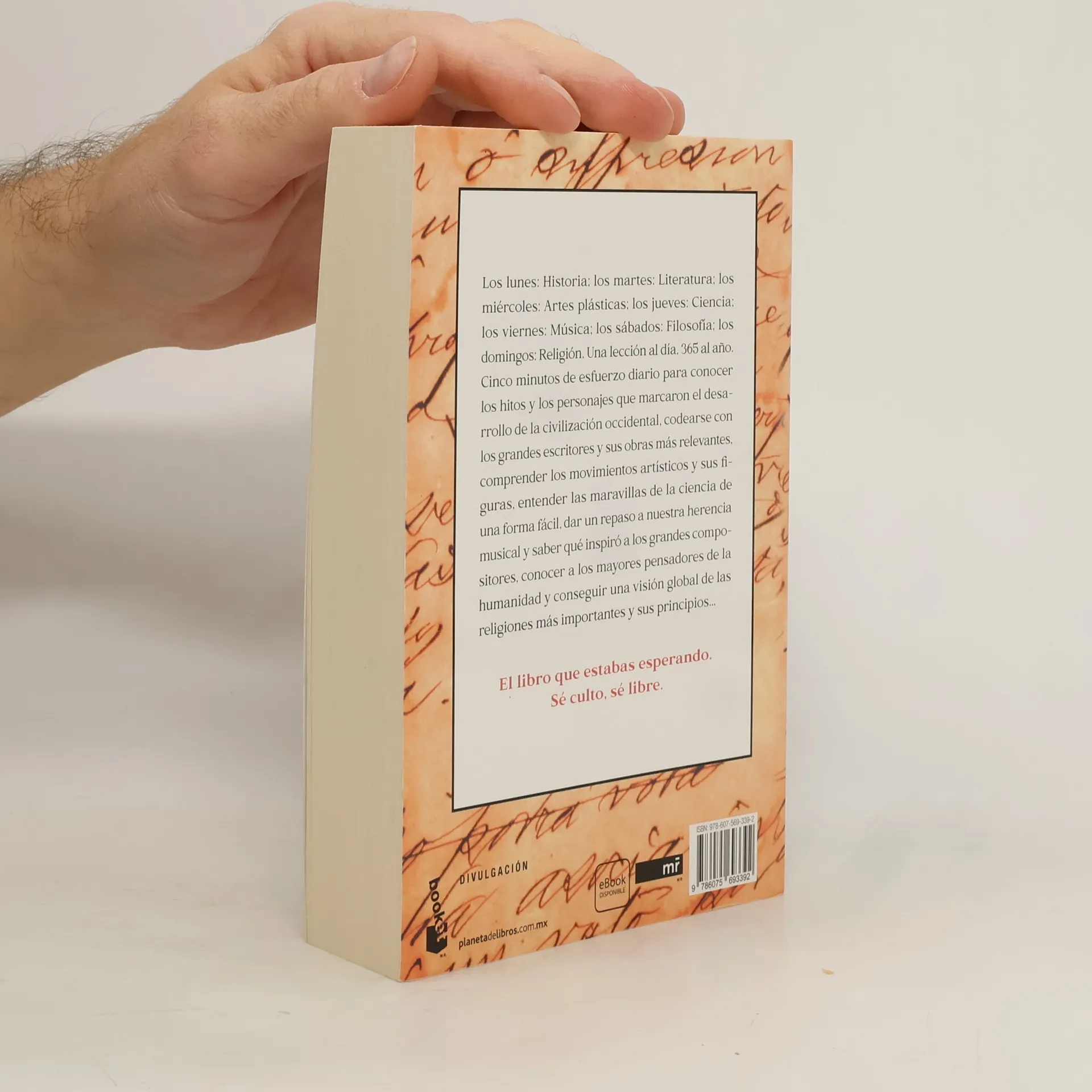 El bestseller que recomienda el New York Times Una lección al día. 365 lecciones al año. Cinco minutos de esfuerzo diario para: conocer los hitos y los personajes que marcaron el desarrollo de la civilización occidental, codearse con los grandes escritores y sus obras más relevantes, comprender los movimientos artísticos y sus figuras, entender las maravillas de la ciencia de una forma fácil, dar un repaso a nuestra herencia musical y saber qué inspiró a los grandes compositores, acceder a los mayores pensadores de la humanidad y obtener una visión global de las religiones más importantes y sus principios... Sé culto, sé libre