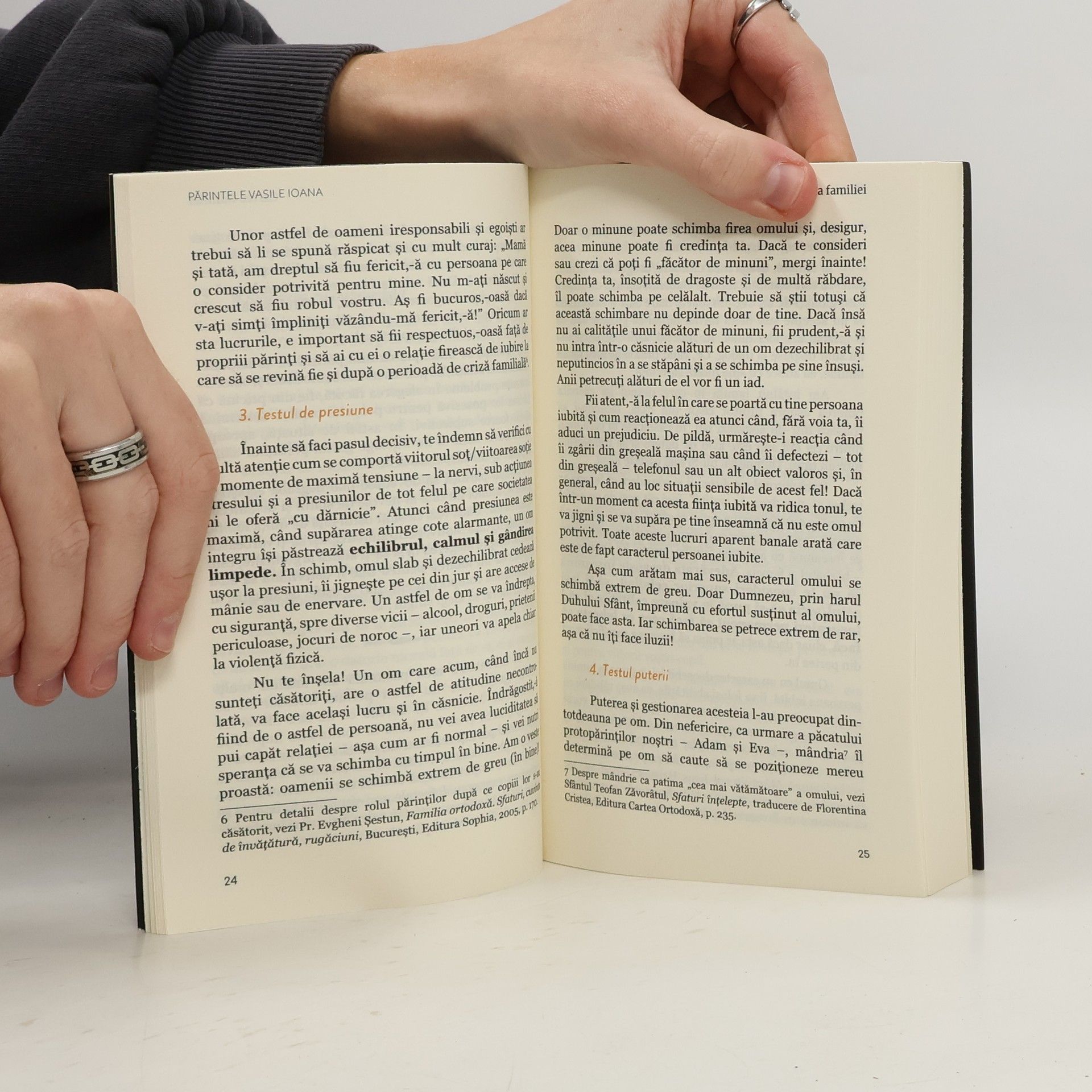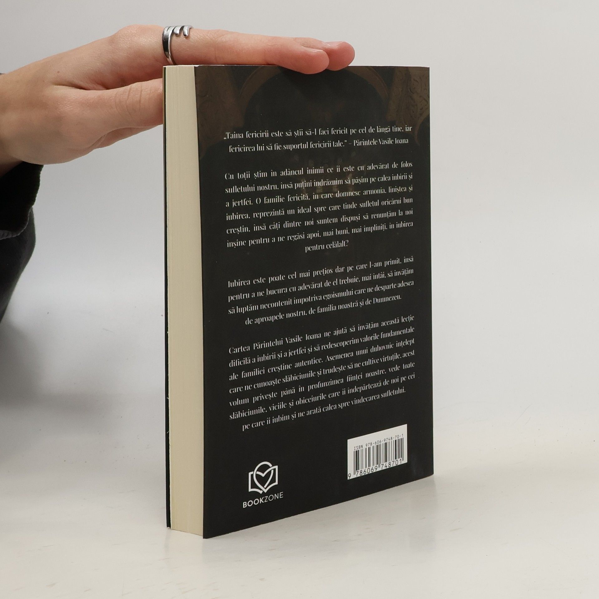 „Taina fericirii este să știi să-l faci fericit pe cel de lângă tine, iar fericirea lui să fie suportul fericirii tale.” – Părintele Vasile IoanaCu toții știm în adâncul inimii ce îi este cu adevărat de folos sufletului nostru, însă puțini îndrăznim să pășim pe calea iubirii și a jertfei. O familie fericită, în care domnesc armonia, liniștea și iubirea, reprezintă un ideal spre care tinde sufletul oricărui bun creștin, însă câți dintre noi suntem dispuși să renunțăm la noi înșine pentru a ne regăsi apoi, mai buni, mai împliniți, în iubirea pentru celălalt?Iubirea este poate cel mai prețios dar pe care l-am primit, însă pentru a ne bucura cu adevărat de el trebuie, mai întâi, să învățăm să luptăm necontenit împotriva egoismului care ne desparte adesea de aproapele nostru, de familia noastră și de Dumnezeu.Cartea Părintelui Vasile Ioana ne ajută să învățăm această lecție dificilă a iubirii și a jerfei și să redescoperim valorile fundamentale ale familiei creștine autentice. Asemenea unui duhovnic înțelept care ne cunoaște slăbiciunile și trudește să ne cultive virtuțile, acest volum privește până în profunzimea ființei noastre, vede toate slăbiciunile, viciile și obiceiurile care îi îndepărtează de noi pe cei pe care îi iubim și ne arată calea spre vindecarea sufletului.