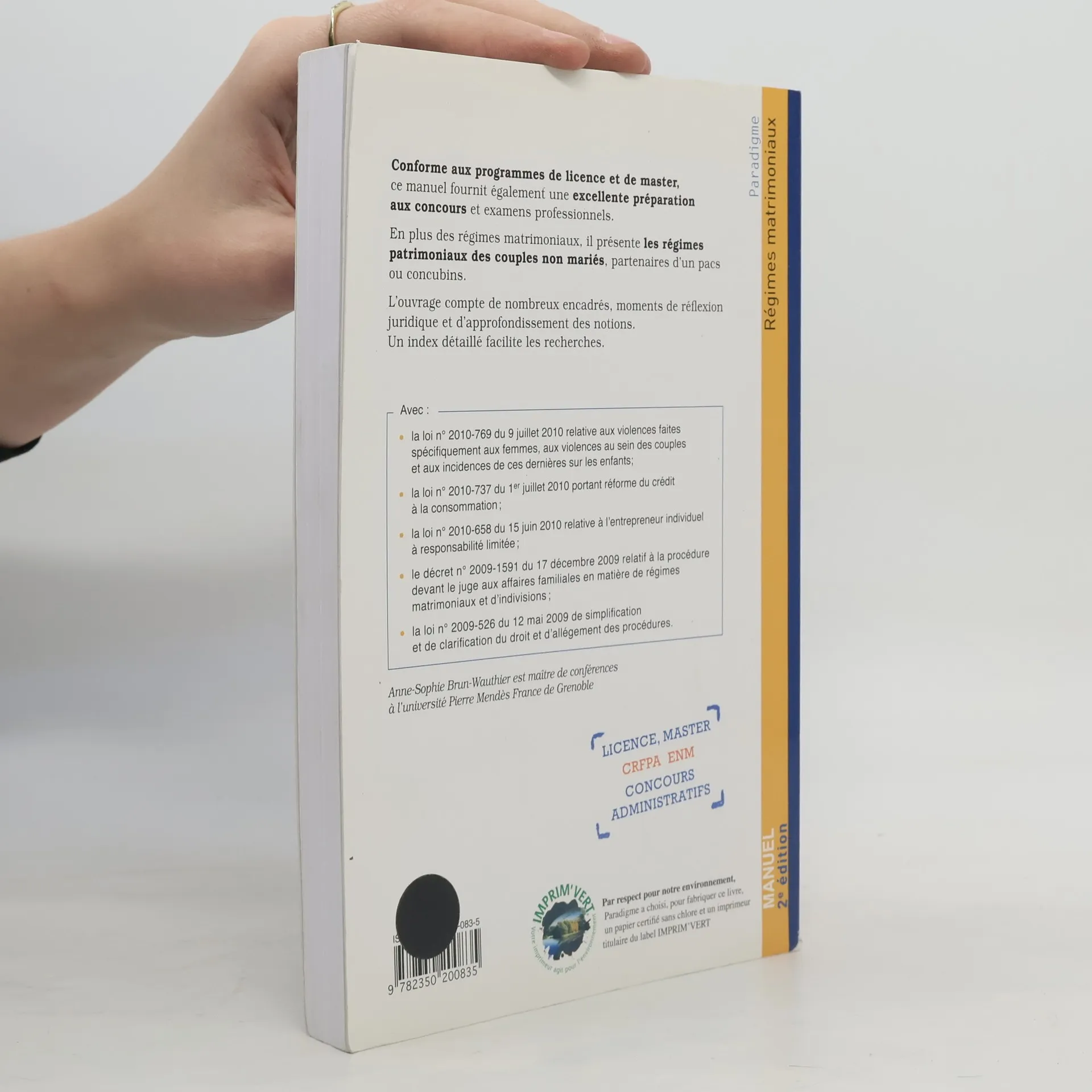 Conforme aux programmes de licence et de master, ce manuel fournit également une excellente préparation aux concours et examens professionnels. En plus des régimes matrimoniaux, il présente les régimes patrimoniaux des couples non mariés, partenaires d’un pacs ou concubins. L’ouvrage compte de nombreux encadrés, moments de réflexion juridique et d’approfondissement des notions. Un index détaillé facilite les recherches. Avec : • la loi n° 2010-769 du 9 juillet 2010 relative aux violences faites spécifiquement aux femmes, aux violences au sein des couples et aux incidences de ces dernières sur les enfants; • la loi n° 2010-737 du 1er juillet 2010 portant réforme du crédit à la consommation ; • la loi n° 2010-658 du 15 juin 2010 relative à l’entrepreneur individuel à responsabilité limitée ; • le décret n° 2009-1591 du 17 décembre 2009 relatif à la procédure devant le juge aux affaires familiales en matière de régimes matrimoniaux et d’indivisions ; • la loi n° 2009-526 du 12 mai 2009 de simplification et de clarification du droit et d’allégement des procédures.