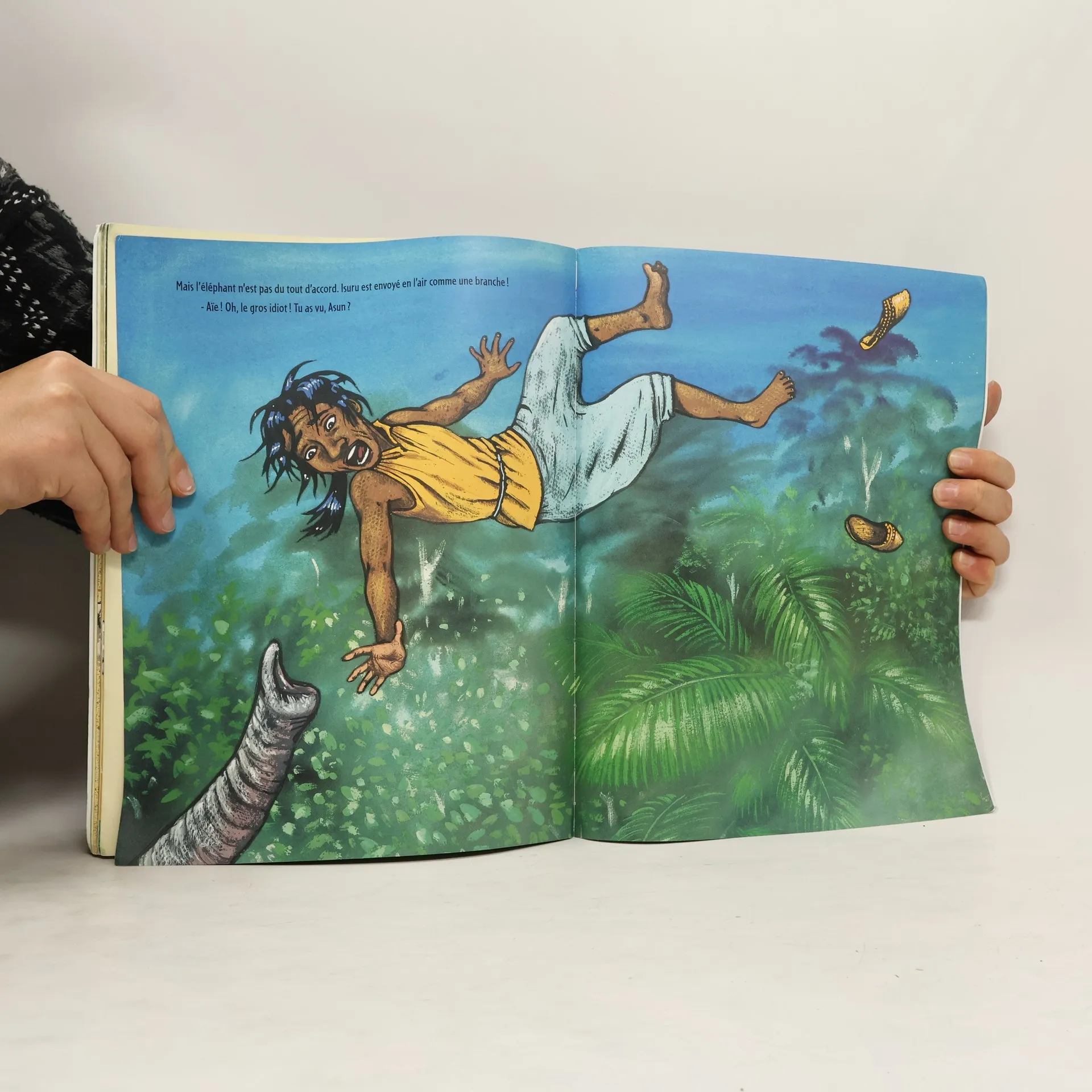 Mais qui est ce grand garçon qui se promène partout les bras en l’air ? Il dit qu’il est fort comme le soleil et l’homme le plus intelligent du Bengale. Au bord de l’étang, il rencontre Asun, celui qu’on surnomme Petit Yogi. Asun croit à la beauté du monde, il est rêveur de jour, il écoute le chant des oiseaux, et il observe tout.