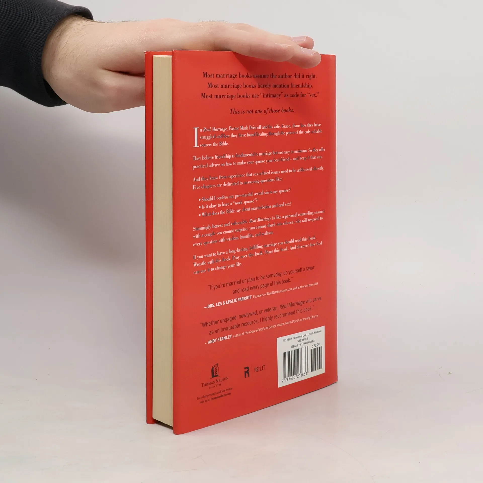 Most marriage books assume the author did it right. Most marriage books barely mention friendship. Most marriage books use “intimacy” as code for “sex.” This is not one of those books. In Real Marriage, Pastor Mark Driscoll and his wife, Grace, share how they have struggled and how they have found healing through the power of the only reliable source: the Bible. They believe friendship is fundamental to marriage but not easy to maintain. So they offer practical advice on how to make your spouse your best friend – and keep it that way. And they know from experience that sex-related issues need to be addressed directly. Five chapters are dedicated to answering questions like: Should I confess my pre-marital sexual sin to my spouse? Is it okay to have a “work spouse”? What does the Bible say about masturbation and oral sex? Stunningly honest and vulnerable, Real Marriage is like a personal counseling session with a couple you cannot surprise, you cannot shock into silence, who will respond to every question with wisdom, humility, and realism. If you want to have a long-lasting, fulfilling marriage you should read this book. Wrestle with this book. Pray over this book. Share this book. And discover how God can use it to change your life. Endorsements : “If you’re married or plan to be someday, do yourself a favor and read every page of this book.” —DRS. LES & LESLIE PARROTT Founders of RealRelationships.com and authors of Love Talk “Whether engaged, newlywed, or veteran, Real Marriage will serve as an invaluable resource. I highly recommend this book.” —ANDY STANLEY author of The Grace of God and Senior Pastor, North Point Community Church "One of my greatest concerns is that culture is going to continually define and redefine what marriage is and is not, and the church is going to simply sit on the sidelines and react rather than seeking to actually become proactive by confidently teaching what the Bible has to say about it. That is why I am so thankful that Mark and Grace Driscoll wrote this book. Their approach to marriage, its benefits and challenges are transparent and challenging and I honestly believe that every married couple who will work through what they lead us through in this book will not just merely have a marriage that survives in this world but rather thrives in it." — PERRY NOBLE Senior Pastor, NewSpring Church "Our thanks to Mark and Grace Driscoll who have served this generation well by tastefully but boldly addressing the real issues facing real marriages. Taking the unchanging truth of God’s word and sprinkling in is the story of God’s mercy in their own marriage they have filled every chapter with real helpfulness. This book is powerful, biblical, practical and healing for marriages that hurt. My wife and our adult children read it to great profit." — DR. JAMES MACDONALD Senior Pastor, Harvest Bible Chapel and Bible teacher for Walk in the Word