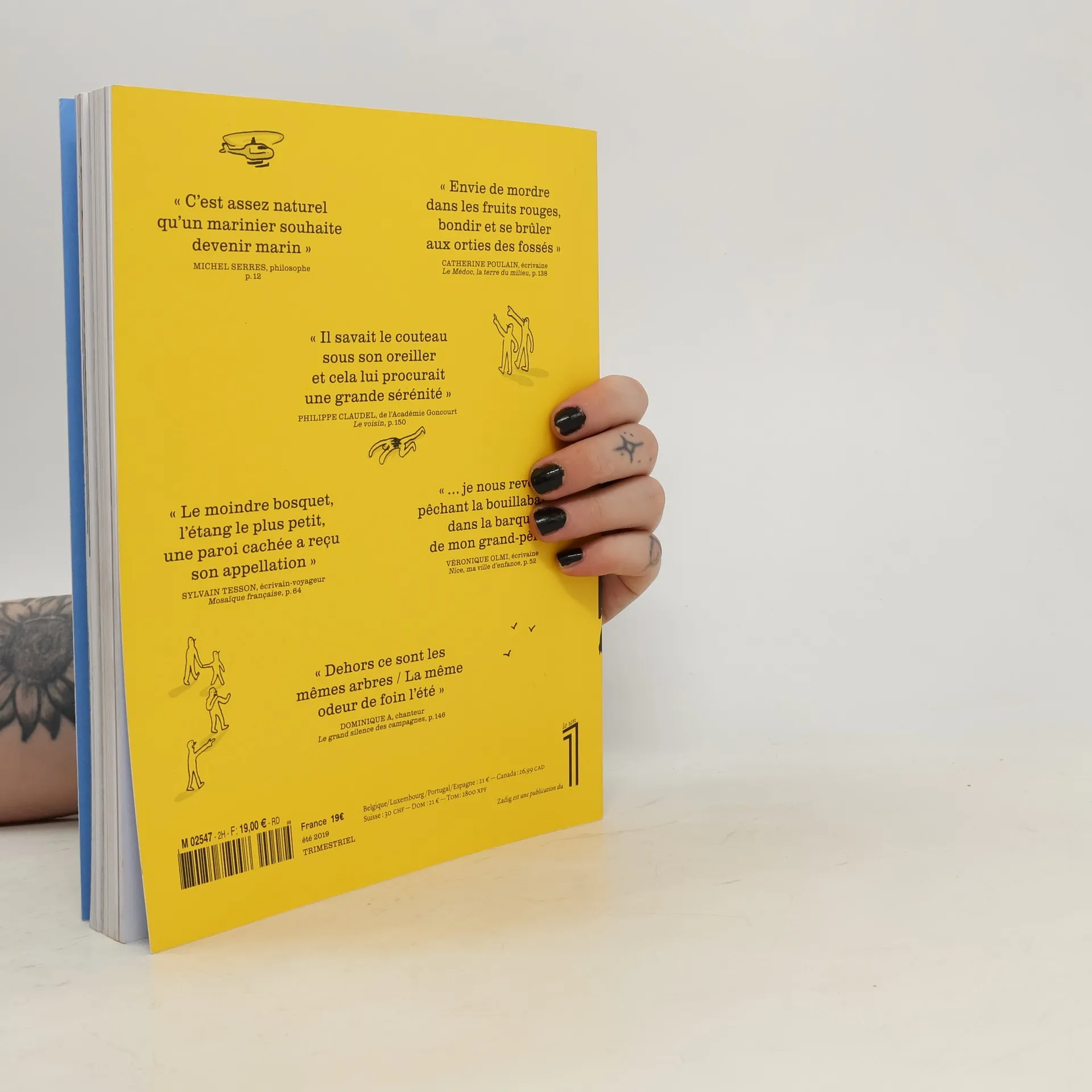 Zadig, nouveau trimestriel sous la direction d'Eric Fottorino propose un voyage extraordinaire dans la France d'aujourd'hui.Il s'agit d'offrir aux lecteurs de multiples regards sur la France d'aujourd'hui avec l'objectif de rendre lisible un pays devenu illisible : la FranceLa dimension régionale est illustrée par une carte de la France et de son Outre-mer que Zadig sillonnera numéro après numéroChristian BOBIN, Maylis de KERANGAL, Léonor RECONDO, Hervé LEBRAS, Mona OZOUF, Pierre ROSANVALLON, Leila SLIMANI, Marie DESPLECHIN, Régis JAUFFRET, ainsi que Patrick BOUCHERON qui traite d'un grand livre qui a marqué sur la France, en occurrence " L'identité de la France " de Braudel, ont participé à ce premier numéro.