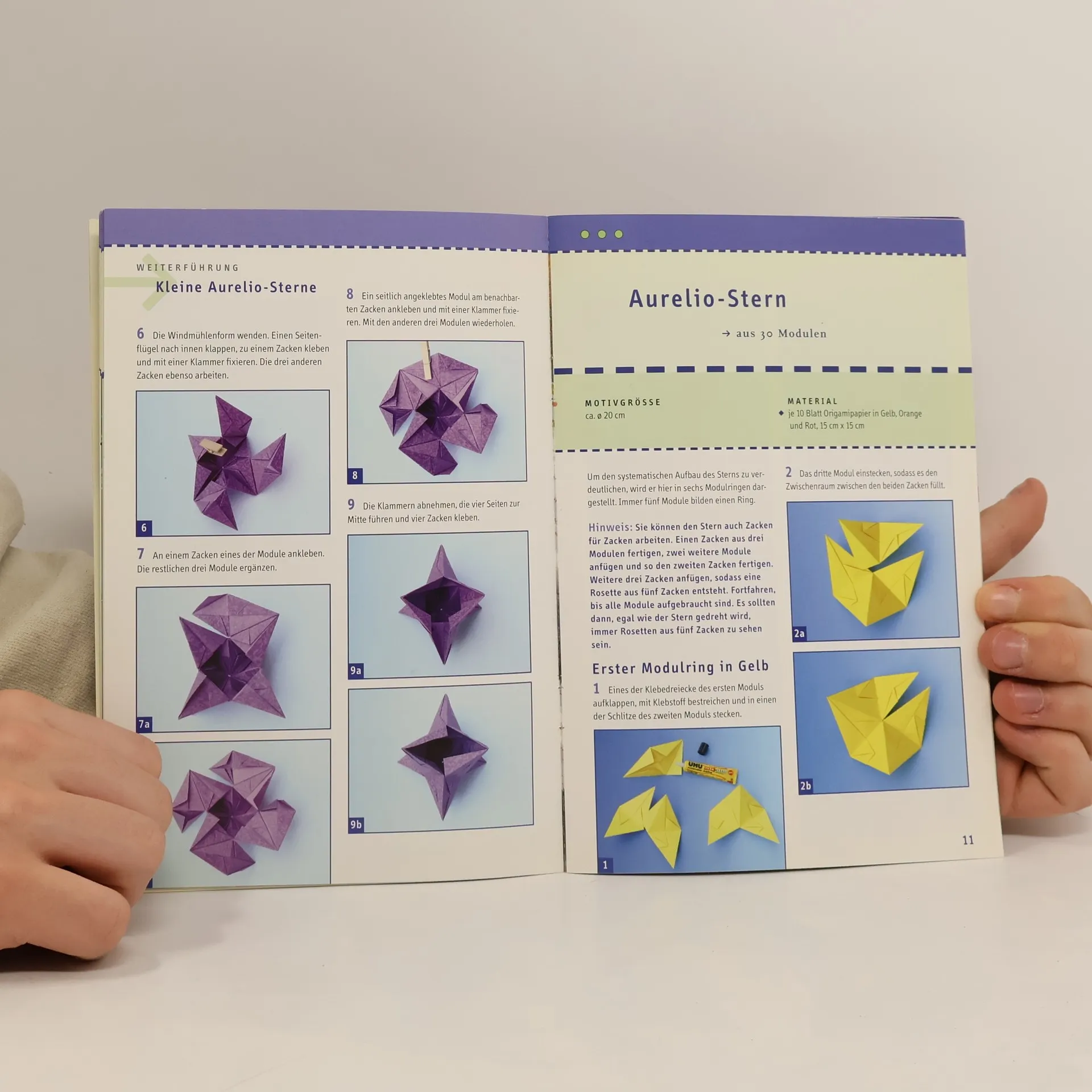 Aurelio-Sterne bestechen durch ihre Dreidimensionalität und ihre Vielseitigkeit. Sie bestehen alle aus einem gefalteten Basis-Modul, das in unterschiedlicher Anzahl und Anordnung zusammengeklebt wird. So entstehen aus Papieren Sterne in verschiedenen Größen, ein- oder mehrfarbig, als Lichterkette, Leuchtstern oder Baumschmuck.