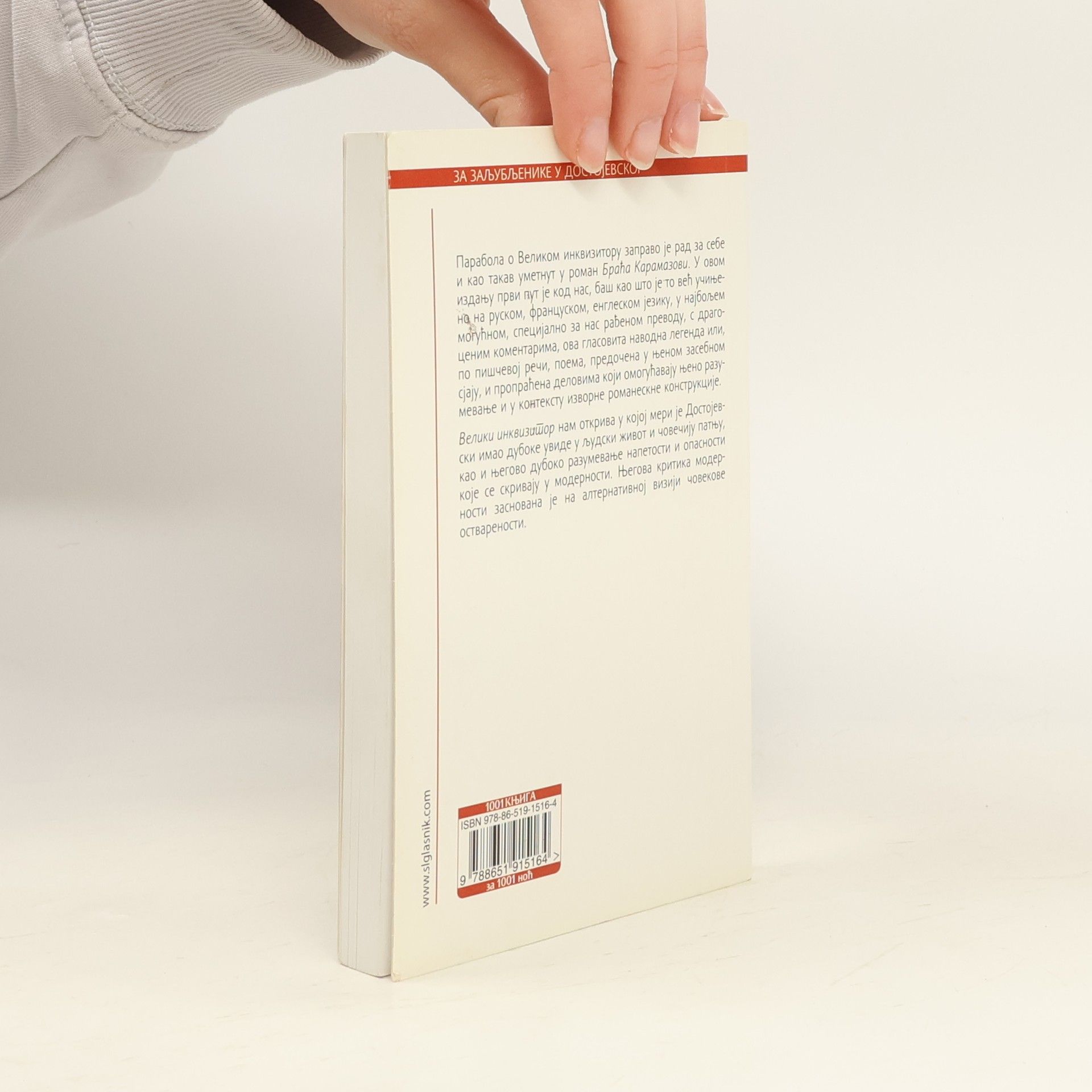 Parabola o Velikom inkvizitoru zapravo je rad za sebe i kao takav umetnut u roman Braća Karamazovi. U ovom izdanju prvi put je kod nas, baš kao što je to već učinjeno na ruskom, francuskom, engleskom jeziku, u najbolјem mogućnom, specijalno za nas rađenom prevodu, s dragocenim komentarima, ova glasovita navodna legenda ili, po piščevoj reči, poema, predočena u njenom zasebnom sjaju, i propraćena delovima koji omogućavaju njeno razumevanje i u kontekstu izvorne romaneskne konstrukcije. Veliki inkvizitor nam otkriva u kojoj meri je Dostojevski imao duboke uvide u lјudski život i čovečiju patnju, kao i njegovo duboko razumevanje napetosti i opasnosti koje se skrivaju u modernosti. Nјegova kritika modernosti zasnovana je na alternativnoj viziji čovekove ostvarenosti.
