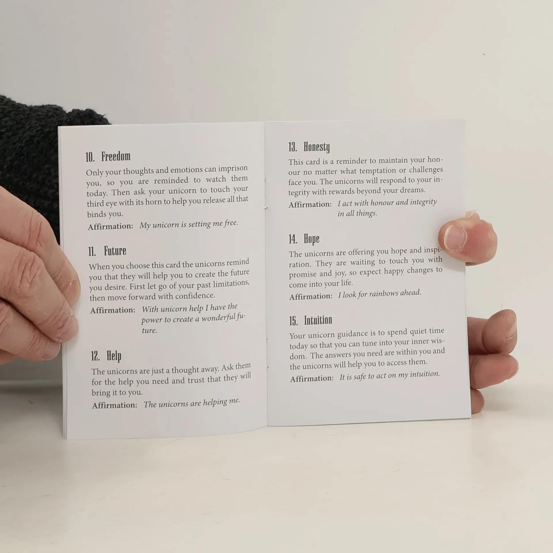 The magical, mythical beings of pure energy known as unicorns stand ready to help and guide humanity in this beautiful deck of affirmations, which features a unique unicorn on every card. By attuning to the pack and drawing a card, users gain access to the wisdom of unicorns to help with meditation or daily navigation. The simple messages of guidance and inspiration will be welcome to both adults and children striving to connect with themselves and improve their inner lives.