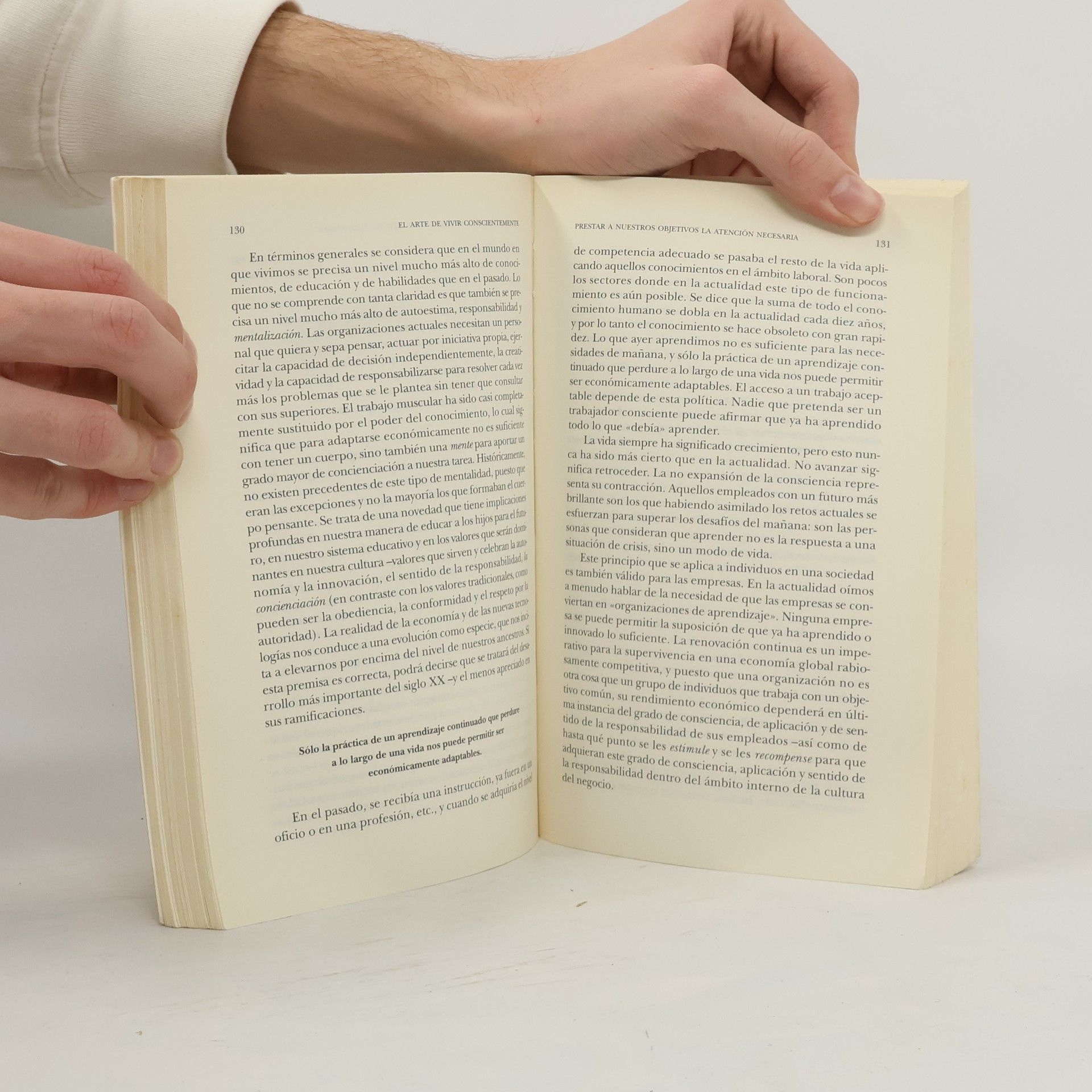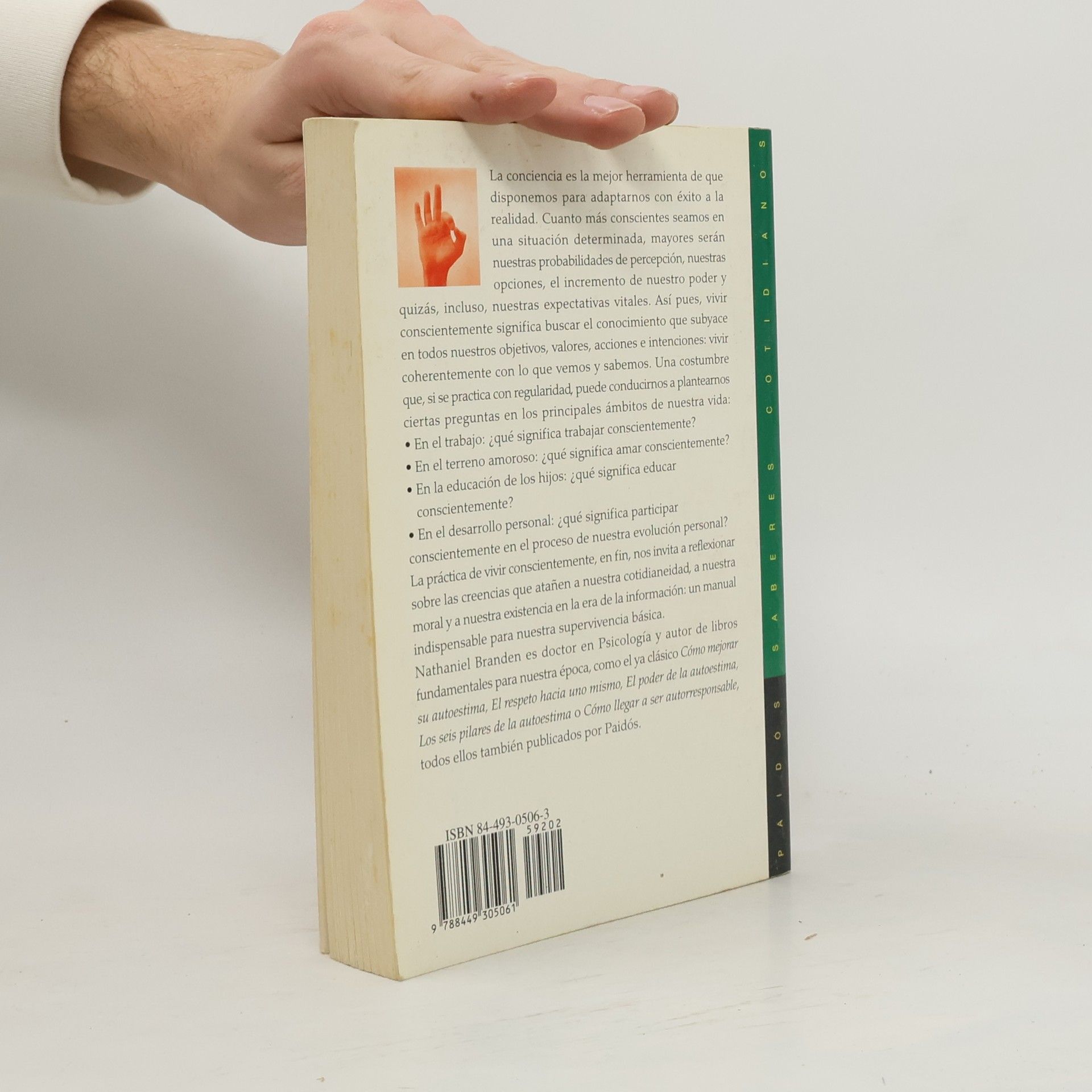 La conciencia es la mejor herramienta de que disponemos para adaptarnos con exito a la realidad. Cuanto mas conscientes seamos en una situacion determinada, mayores seran nuestras probabilidades de percepcion, nuestras opciones, el incremento de nuestro poder y quizas, incluso, nuestras expectativas vitales. Asi pues, vivir conscientemente significa buscar el conocimiento que subyace en todos nuestros objetivos, valores, acciones e intenciones: vivir coherentemente con lo que vemos y sabemos. Una costumbre que, si se practica con regularidad, puede conducirnos a plantearnos ciertas preguntas en los principales ambitos de nuestra vida: En el trabajo: que significa trabajar conscientemente? En el terreno amoroso: que significa amar conscientemente? En la educacion de los hijos: que significa educar conscientemente? En el desarrollo personal: que significa participar conscientemente en el proceso de nuestra evolucion personal? La practica de vivir conscientemente, en fin, nos invita a reflexionarsobre las creencias que atanen a nuestra cotidianeidad, a nuestra moral y a nuestra existencia en la era de la informacion: un manual indispensable para nuestra supervivencia basica.