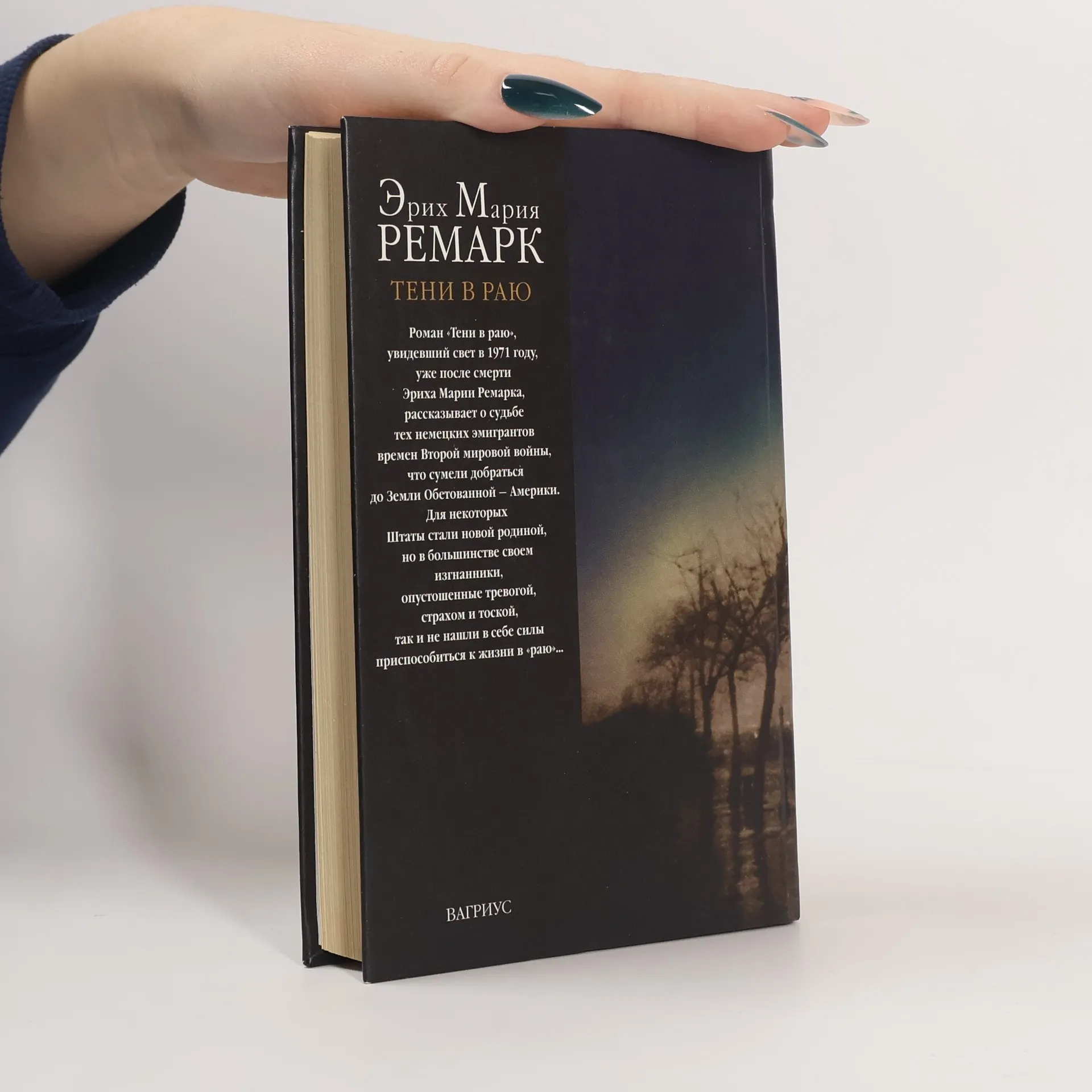 Shadows in Paradise Роман "Тени в раю", увидевший свет в 1971 году, уже после смерти Эриха Марии Ремарка, рассказывает о судьбе тех немецких эмигрантов времен Второй мировой войны, что сумели добраться до Земли Обетованной - Америки. Для некоторых Штаты стали новой родиной, но в большинстве своем изгнанники, опустошенные тревогой, страхом и тоской, так и не нашли в себе силы приспособиться к жизни в "раю"...