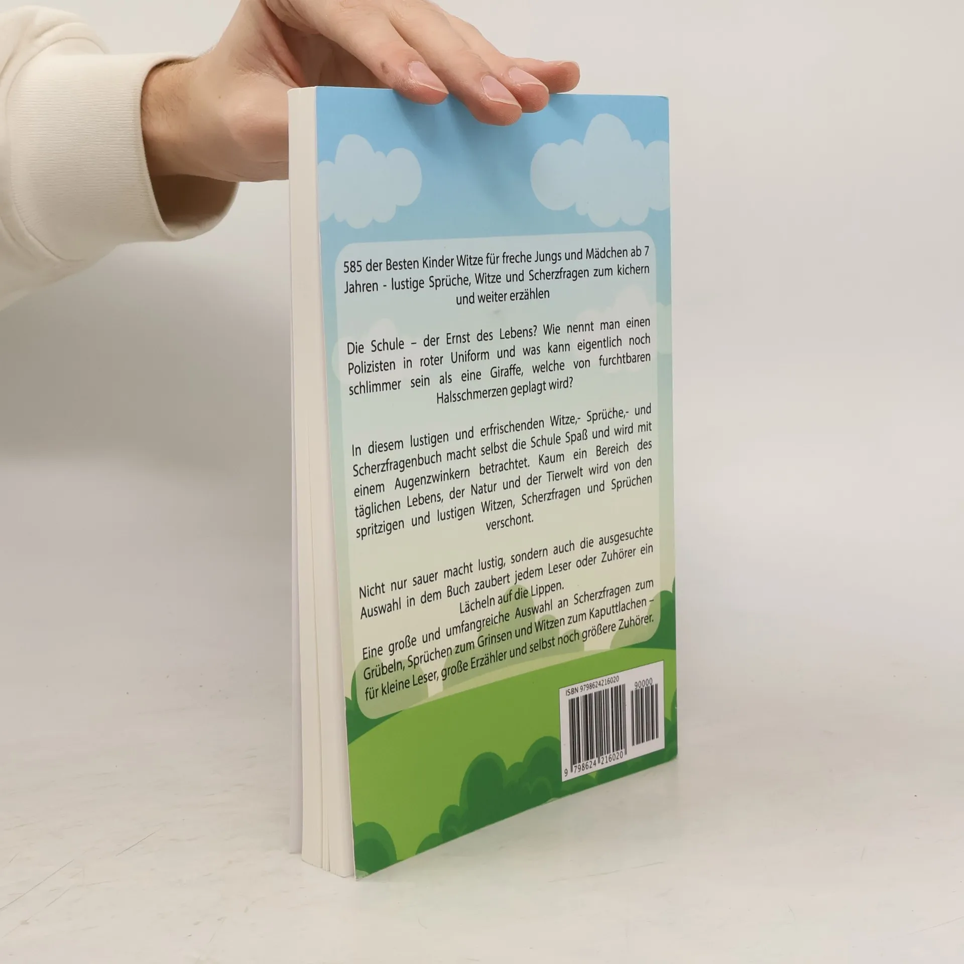 585 der Besten Kinder Witze für freche Jungs und Mädchen ab 7 Jahren beinhaltet lustige Sprüche, Witze und Scherzfragen zum kichern und weiter erzählen.Die Schule - der Ernst des Lebens? Wie nennt man einen Polizisten in roter Uniform und was kann eigentlich noch schlimmer sein als eine Giraffe, welche von furchtbaren Halsschmerzen geplagt wird?In diesem lustigen und erfrischenden Witze,- Sprüche,- und Scherzfragenbuch macht selbst die Schule Spaß und wird mit einem Augenzwinkern betrachtet. Kaum ein Bereich des täglichen Lebens, der Natur und der Tierwelt wird von den spritzigen und lustigen Witzen, Scherzfragen und Sprüchen verschont. Nicht nur sauer macht lustig, sondern auch die ausgesuchte Auswahl in dem Buch zaubert jedem Leser oder Zuhörer ein Lächeln auf die Lippen. Eine große und umfangreiche Auswahl an Scherzfragen zum Grübeln, Sprüchen zum Grinsen und Witzen zum Kaputtlachen - für kleine Leser, große Erzähler und selbst noch größere ZuhörerMit diesem witzigen Buch wird jedes Kind spielend leicht zum Komiker und beeindruckt das ganze Umfeld inklusive Familie, Freunde und Lehrer mit vielerlei lustigen Witzen. Besonders gut zum Leseeinstieg bereits ab dem Schuleintrittsalter geeignet, für Jungs und Mädchen , zum vorlesen oder auch selbst stöbern, auswendig lernen und kichern. Insgesamt 277 Scherzfragen, 32 kindergerechte Sprüche und 276 spaßige Witze für kleine Knalltüten, die einen riesen großen Spaßfaktor garantieren.Eine bunte Mischung aus den Bereichen: ☼ Berufe ☼ Essen und Trinken ☼ Körper und Sinne ☼ Natur und Umwelt ☼ Verkehr ☼ Tierwelt ☼ Schule ☼ Menschen ☼ Blondinenwitze usw. In jeder Pause, auf Kindergeburtstagen oder sogar auf öden Familienfesten wird es dank der fantasiereichen und amüsanten Sprüche und Scherzfragen so schnell nicht langweilig und die Kids werden im Hand um Drehen zu echten Komikern mit Lachanfallgarantie!