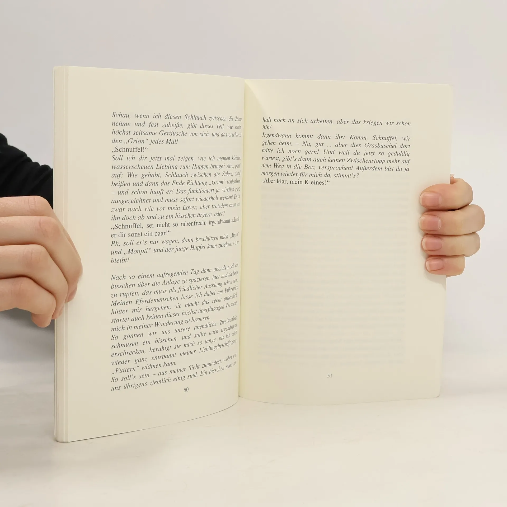 Das Fohlen Fiora muss ohne Mutter aufwachsen und mühsam lernen, zu vertrauen und Ängste zu überwinden. Erst dann zeigt sich, welch verschmustes und neugieriges Wesen in ihm steckt. Gnadenbrotschimmel Pepe hat auf seine alten Tage ein liebevolles Zuhause gefunden, in dem er sein Rentnerdasein mit viel Pflege und neuen Freunden genießen kann. Das Buch gibt auf amüsante Art und Weise Einblick in die Gedankenwelt der beiden Pferde, zeigt ihre Ängste, Wünsche und ihre ureigenen Charaktereigenschaften.