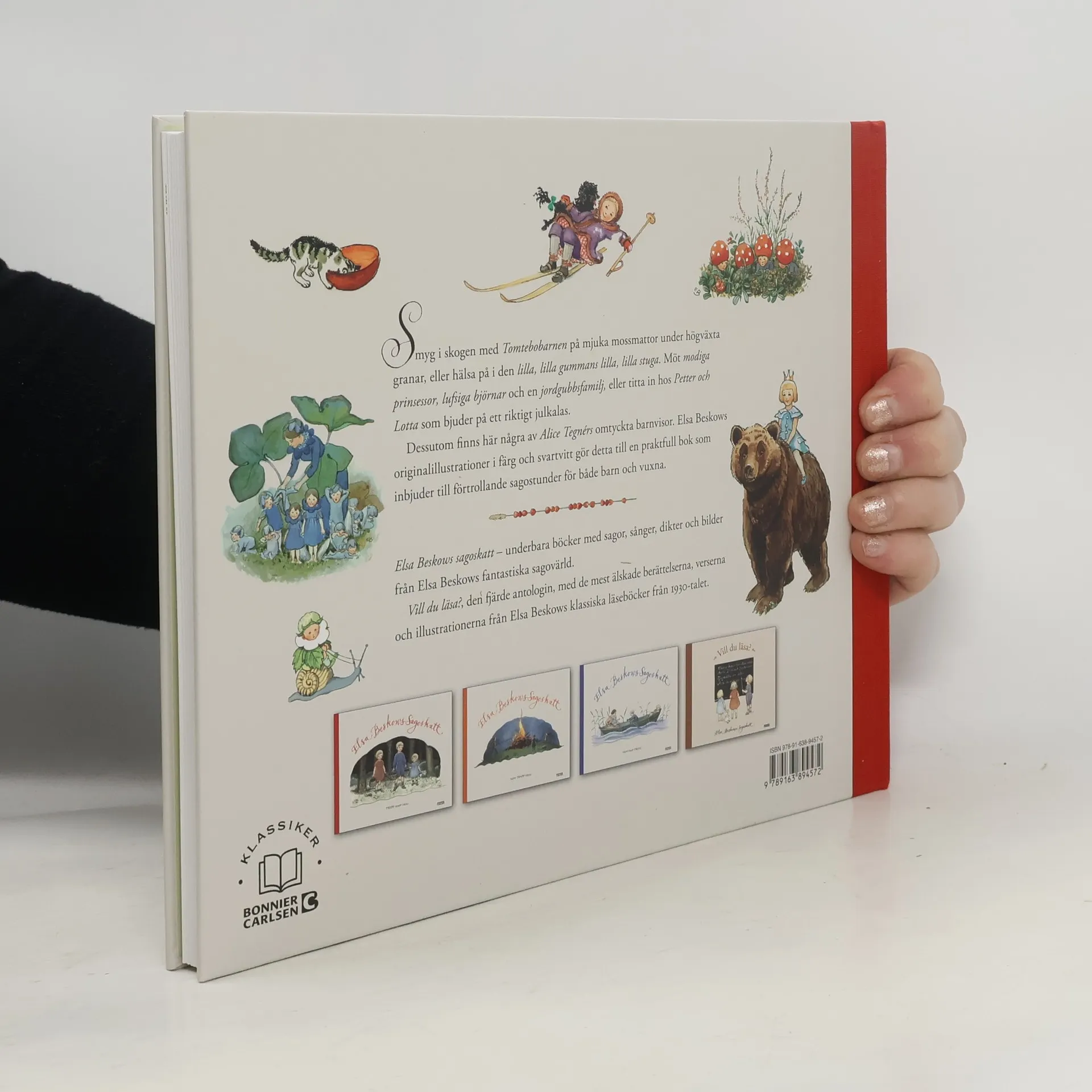 I denna praktfulla volym finns de allra mest älskade sagorna, verserna och motiven samlade. Samlingen innehåller både välkända berättelser som "Tomtebobarnen" och "Sagan om den lilla, lilla gumman" samt några av Alice Tegnérs omtyckta barnvisor tillsammans med de vackra bilderna, men också några mer okända guldkorn ur Elsa Beskows fantastiska sagoflora. Med originalillustrationer i färg och svartvitt är det här en sagoskatt som gläder både barn och vuxna.
