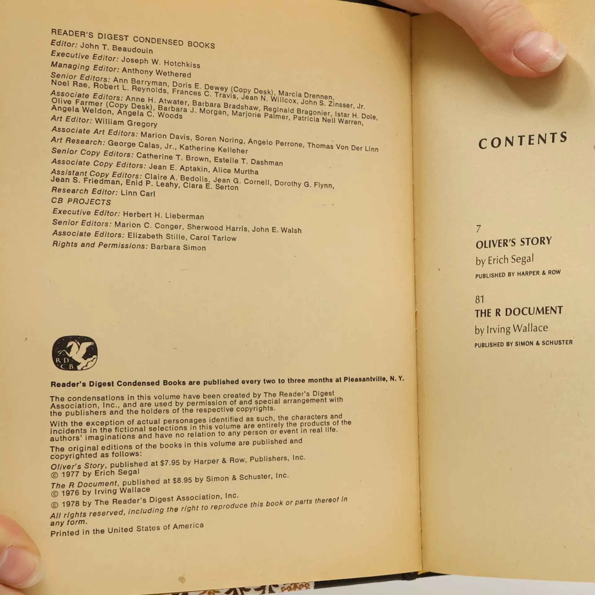 Best Sellers from Reader's Digest Condensed Books. Oliver's Story. The R Document, Erich Segal, Irving Wallace