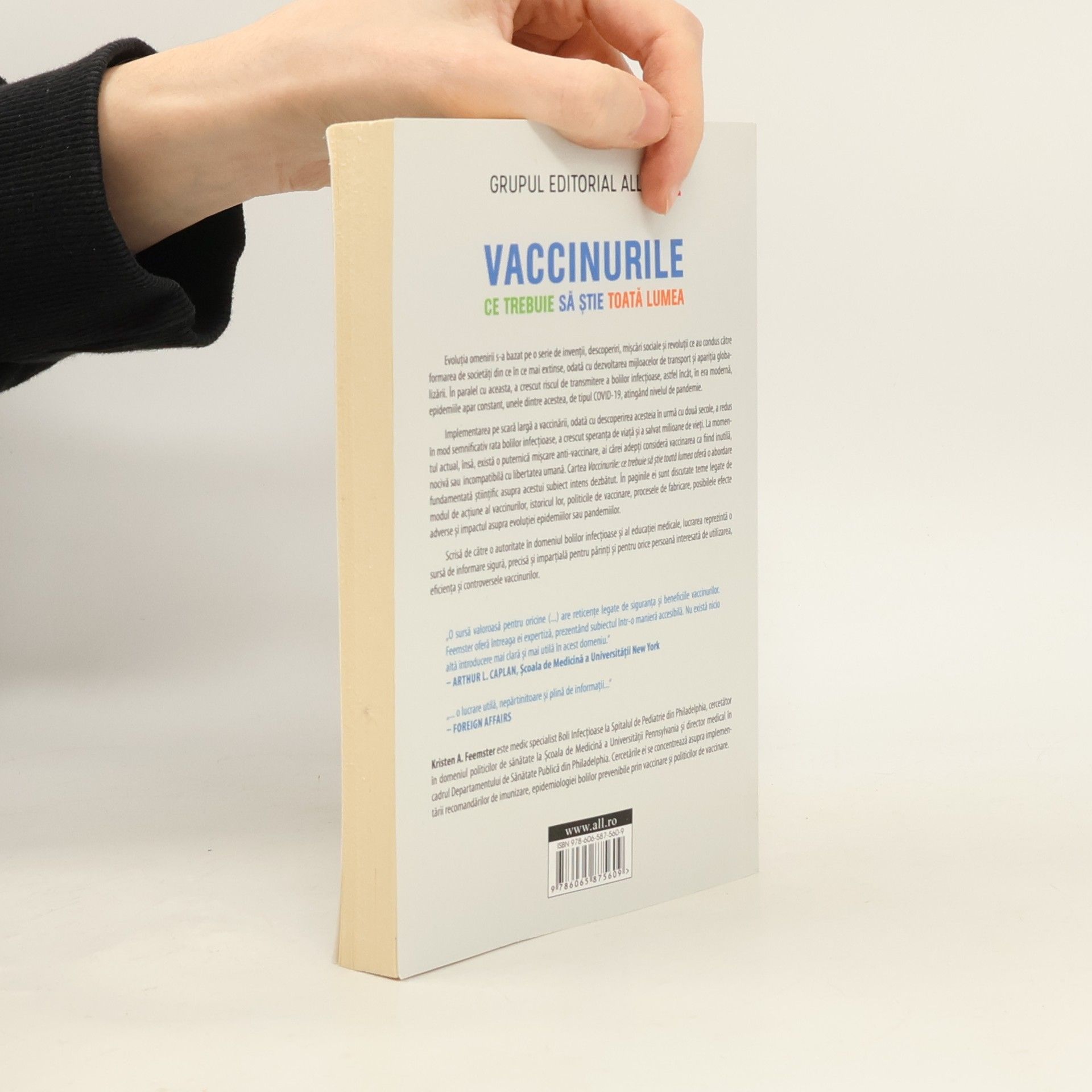 Cea mai clară sursă de informare despre vaccinuriLucrarea de față cuprinde informații sigure și complete despre utilizarea, eficiența și controversele vaccinurilor. Scrisă de o autoritate în domeniul bolilor infecțioase și al educației medicale, reprezintă o lectură esențială pentru părinți și pentru orice persoană interesată de subiect.Invențiile, descoperirile, mișcările sociale și revoluțiile stau la baza evoluției omenirii. Dezvoltarea mijloacelor de transport a făcut posibilă formarea unor societăți din ce în ce mai extinse. În paralel, au apărut și problemele asociate cu creșterea densității populației. Riscul major de transmitere a bolilor infecțioase este una dintre ele. În era modernă, epidemiile apar constant, iar o parte dintre ele, de tipul COVID-19, ating nivelul de pandemie.Vaccinurile reprezintă soluția cu o eficiență dovedită în reducerea semnificativă a incidenței bolilor infecțioase și chiar a eradicării unora dintre ele. Introducerea vaccinurilor în practica medicală a marcat un real progres în domeniul sănătății publice în ultimii 100 de ani. Astfel, a crescut speranța de viață și au fost salvate milioane de vieți.Dar, la momentul actual, există și o puternică mișcare anti-vaccinare. Epidemiile recente de pe plan mondial demonstrează faptul că bolile prevenibile prin vaccinare, cum ar fi pertussis (*pop. tuse convulsivă/măgărească) sau rujeola, pot apărea pe măsură ce frica de vaccinare crește și rata imunizării scade. În consecință, furnizorii de servicii medicale petrec timp și efort considerabil educând pacienții și familiile acestora în privința importanței imunizării. Decizia de a vaccina sau de a nu vaccina are impact atât asupra fiecărui individ în parte, cât și asupra celor din jur. În consecință, este imperativ necesar să fim bine informați înainte de a lua o decizie. Trebuie să identificăm sursele de încredere ce pot răspunde în mod adecvat la întrebările despre riscurile și beneficiile listei actuale de vaccinuri. Cu siguranță, această carte se numără printre ele.Abordarea autoarei este în totalitate fundamentată științific, iar modul clar și concis în care sunt prezentate informațiile o fac cât se poate de accesibilă pentru publicul larg. Lucrarea tratează teme precum modalitatea de acțiune a vaccinurilor, istoricul lor, bolilor prevenibile prin vaccinare, politicile de vaccinare, procesele de fabricare, posibilele efecte adverse și impactul asupra evoluției epidemiilor sau pandemiilor. De asemenea, reprezintă un instrument util în înțelegerea provocărilor legate de implementarea imunizării la nivelul populației.„O sursă valoroasă pentru oricine (…) are reticențe legate de siguranța și beneficiile vaccinurilor. Feemster oferă întreaga ei expertiză, prezentând subiectul într-o manieră accesibilă. Nu există nicio altă introducere mai clară și mai utilă în acest domeniu.” – Arthur L. Caplan, Școala de Medicină a Universității New York