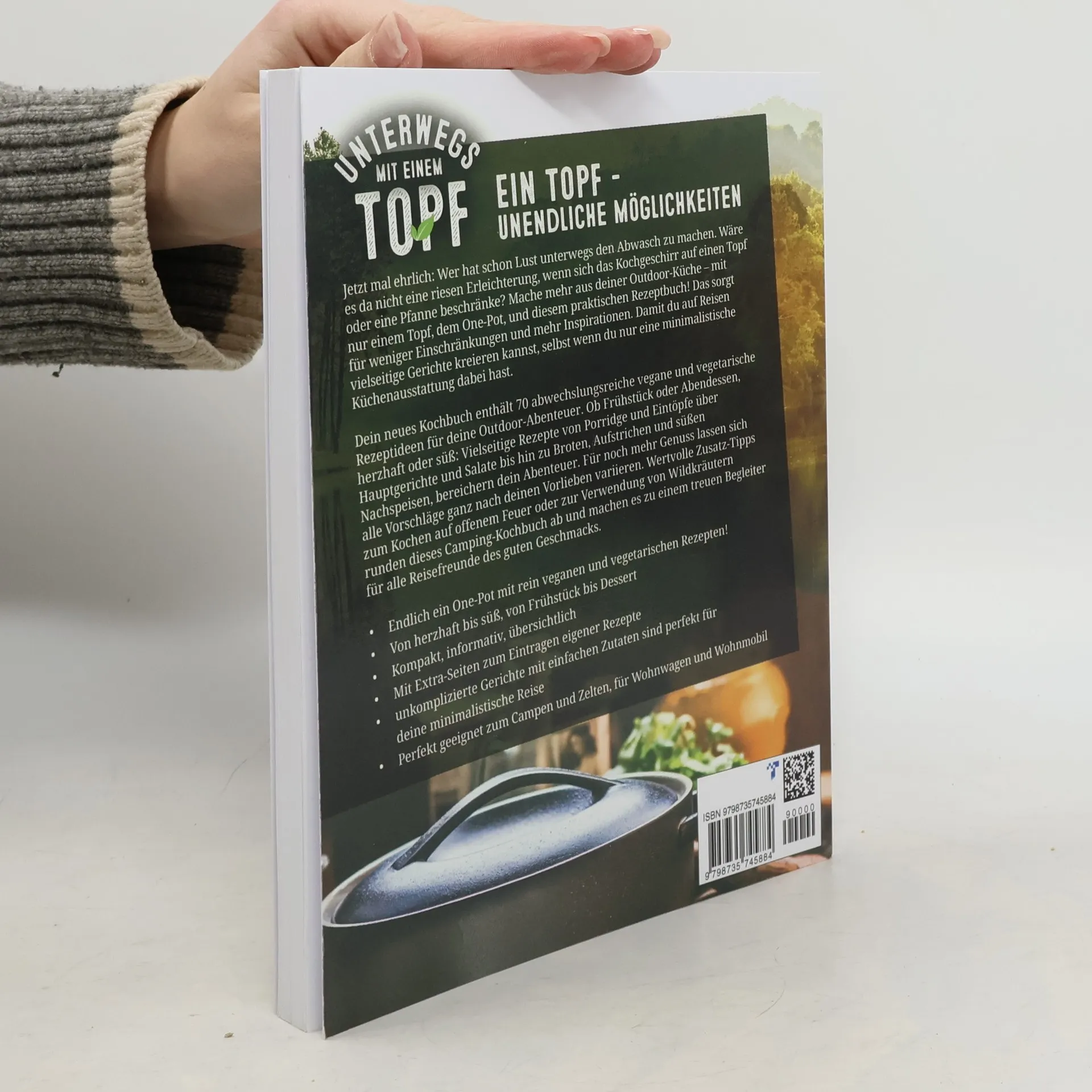 -2. Neuauflage- Kochst auch du liebend gern, wenn du auf Reisen bist? Doch stört dich manchmal der große Aufwand darum herum? Ab jetzt ist Schluss mit viel Geschirr, anstrengendem Abwasch und Zeitverschwendung! Denn „Unterwegs mit einem Topf“ ist dein neues One Pot-Kochbuch für eine Outdoor-Küche , die so unkompliziert ist wie kaum zuvor. 70 schmackhafte vegetarische und vegane One Pot-Rezepte stehen dir zur Auswahl – und für jedes Rezept gibst du alle Zutaten in nur einen einzigen Kochtopf gibst. Das reduziert den Aufwand und sorgt für mehr Abwechslung und gute Laune unterwegs . Du darfst dich freuen auf nahrhafte Frühstücksideen, kreative Suppen und Eintöpfe, knackige Salate, selbstgemachte Brote, Aufstriche, wohltuende Hauptgerichte und feine Desserts – alles aus nur einem Topf! Sämtliche Rezepte im Camping-Kochbuch enthalten Kalorienangaben für bewusste Reisende und sind so konzipiert, dass du sie ganz nach deinen Vorlieben verändern und an die Besonderheiten vor Ort anpassen kannst. Mit Extraseiten zum Notieren deiner eigenen One Pot Rezepte . So hast du all deine liebsten Camping-Rezepte in einem Buch – das erspart dir auch gleich die Online-Recherche und die Frage, wer gerade Handy-Empfang hat. Und damit du auch guten Gewissens kochen und genießen kannst, findest du in deinem neuen Wohnmobil-Kochbuch wertvolle Tipps zum OnePotten, zum Beispiel rund um die richtige Ausstattung , die Lebensmittel-Basics , Ratschläge zum Kochen am Feuer oder zur Verwendung von Wildkräutern . Deine Vorteile auf einen -> Durch den Verzicht auf sehr teuren Farbdruck können wir dir das beste Preis-Leistungsverhältnis anbieten, ohne auf den Geschmack verzichten zu müssen! Durch die integrierten QR-Codes kannst du dir alle Zubereitungen digital ansehen oder den Ordner durchstöbern!