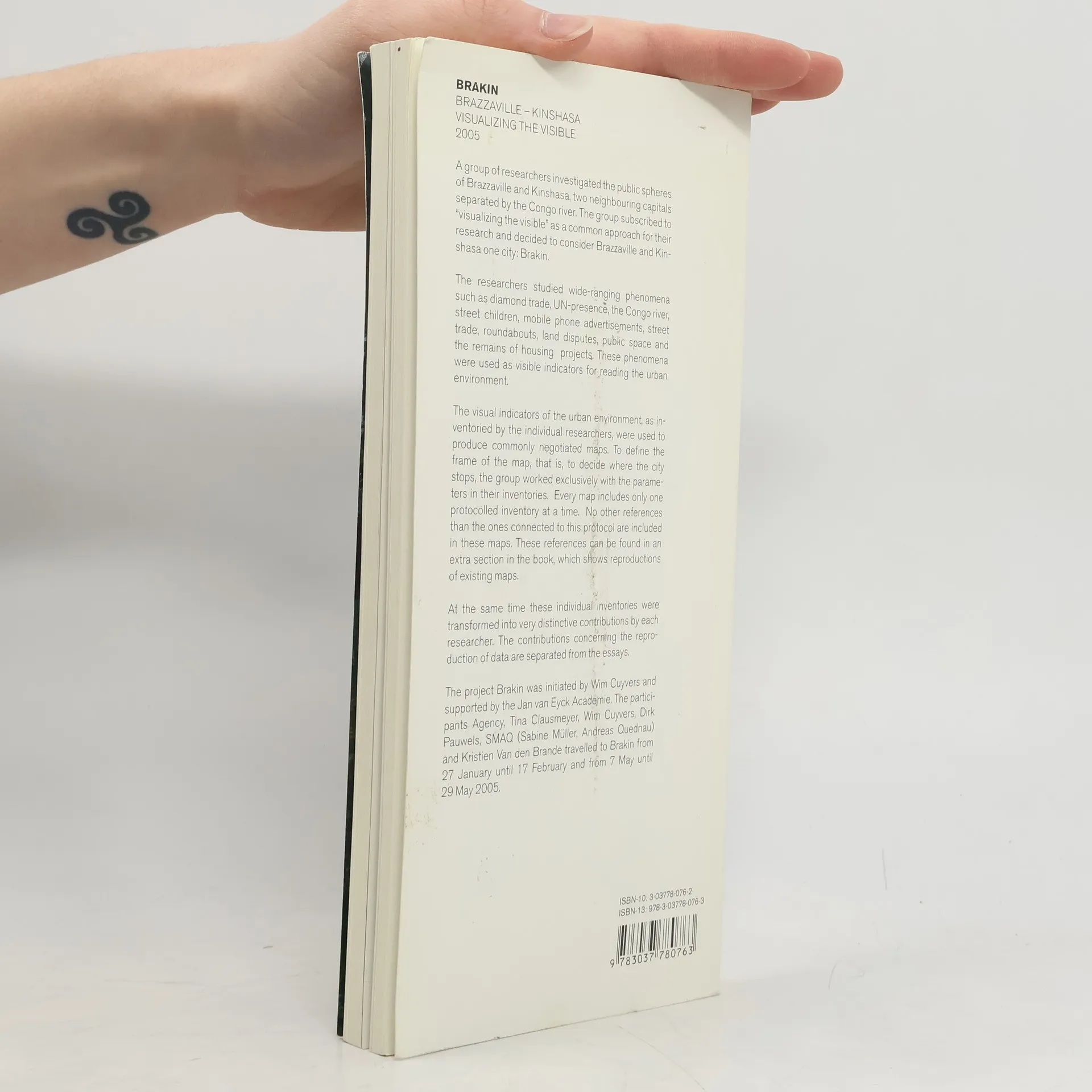A group of scholars studied the various manifestations of public space using the example of the booming capitals Brazzavile and Kinshasa.BRAZZaville-KINshasa, viewed as one metropolis in this study, is systematically documented through everyday phenomena such as "Architectural Manifestations of the Diamond Trade," "The UN Presence," "The River Congo," "Street Children," "Mobile Phone Advertising," "Conflicts over Property Ownership," and so on.This visual indicators of urban identity are collected like an inventory and recorded on maps of the city that enable one to crisscross BRAKIN in one’s mind.Somewhat like an ideal guidebook, the publication is designed to help the reader through present-day BRAKIN and at the same time serve as a prototype for discussions of indicators of public space. Visualizing the Visible is a research project of the Jan van Eyck Academie, Maastricht, initiated and directed by Wim Cuyvers, with Tina Clausmeyer, Dirk Pauwels, and Kristien Van den Brande as researchers.