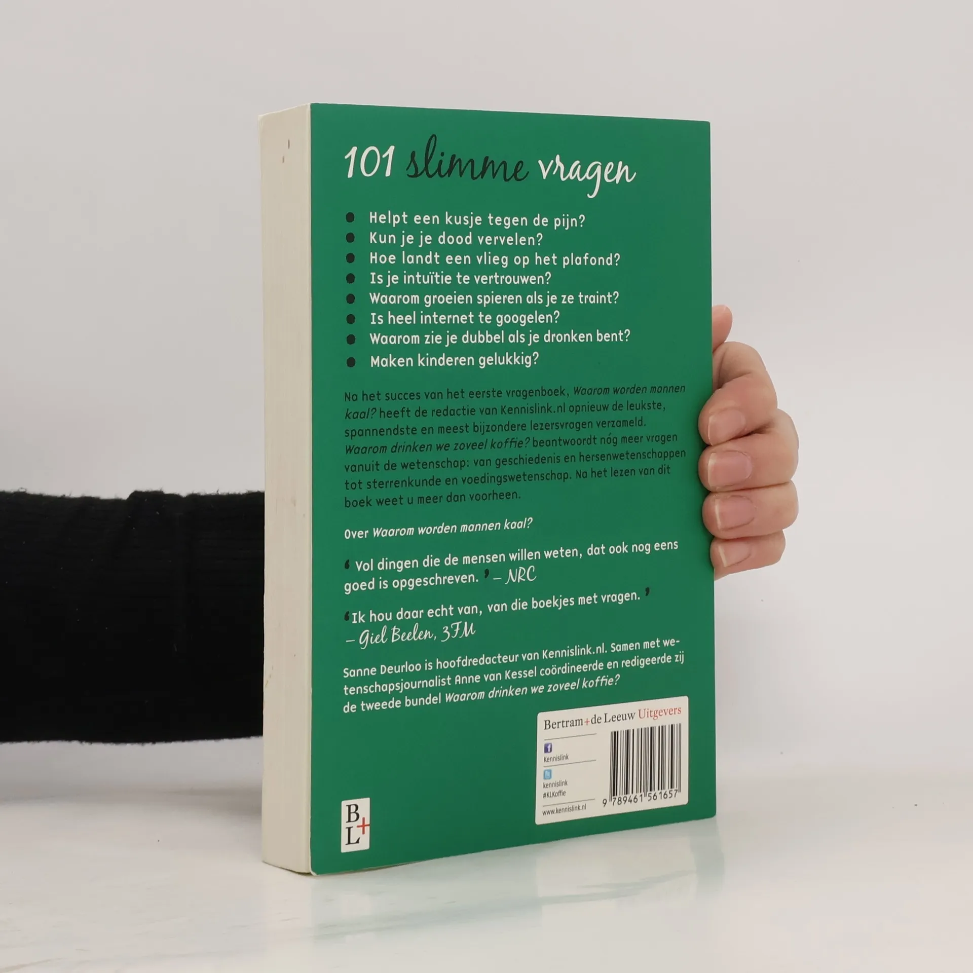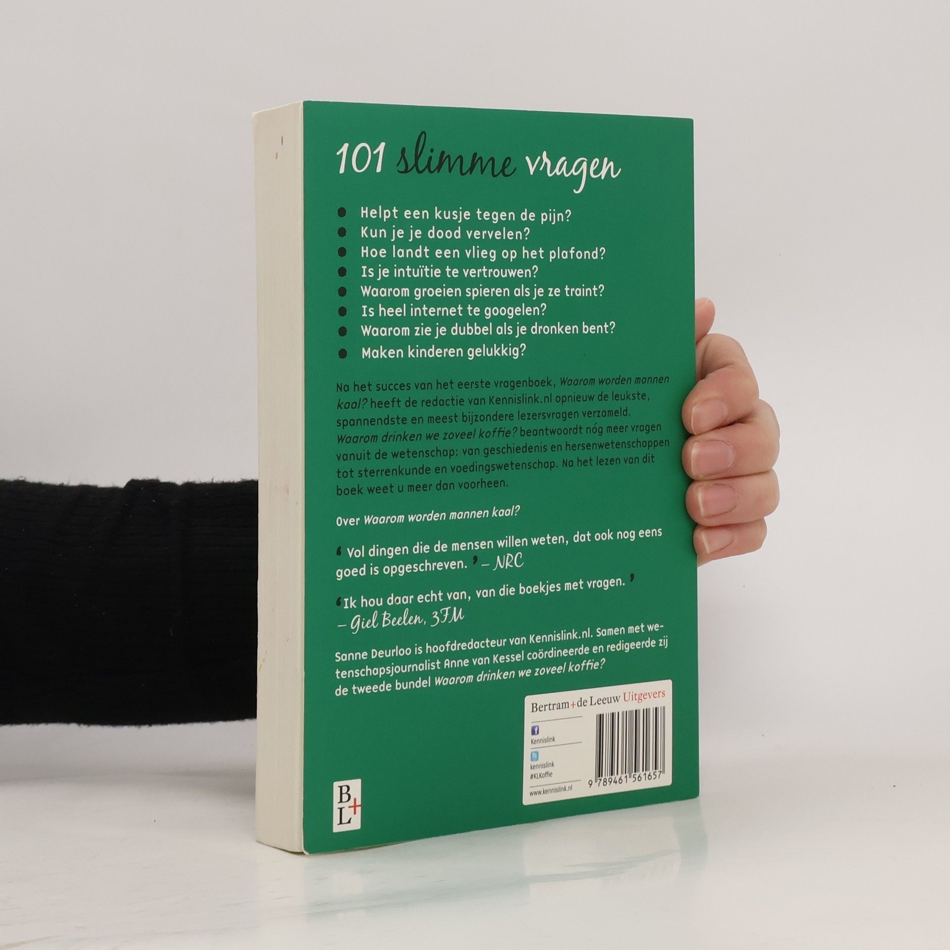 101 slimme vragen - Helpt een kusje tegen de pijn? - Kun je je dood vervelen? - Waarom groeien spieren als je ze traint? - Is je intuïtie te vertrouwen? - Hoe landt een vlieg op het plafond? - Is heel internet te Googlen? - Waarom zie je dubbel als je dronken bent? - Maken kinderen gelukkig? Na het succes van het eerste vragenboek, Waarom worden mannen kaal? hebben de redacteuren van Kennislink.nl opnieuw de leukste, spannendste en interessantste lezersvragen verzameld. Waarop alleen de wetenschap antwoord kan geven. Bijzondere vragen en antwoorden die iets vertellen over wie we zijn, over de wereld waarin we wonen. Maar ook over onze gewoontes en verslavingen: want waarom drinken we zoveel koffie? Bijna nergens ter wereld wordt zo veel koffie gedronken als in Nederland. Is dat wel gezond?