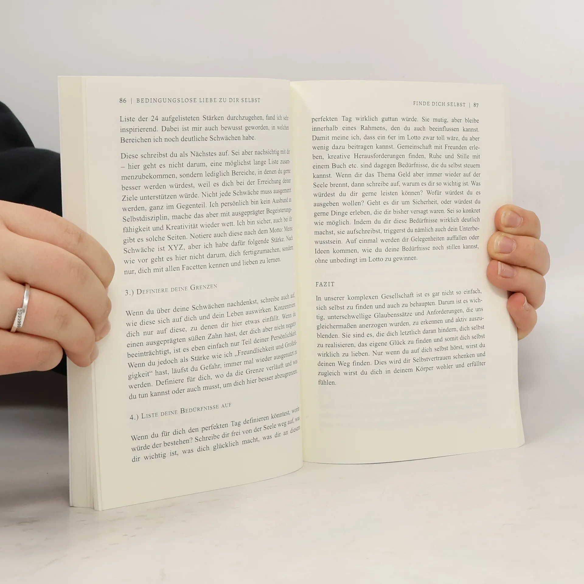Kommt dir einer der folgenden Sätze bekannt vor?„ Mir gelingt nie etwas. Ich habe immer Pech. “„ Niemand nimmt mich ernst. Warum auch? “„ Ich bin hässlich und unattraktiv. “Vielen von uns fällt es leicht, ständig für andere da zu sein, ihnen Komplimente zu machen und dafür zu sorgen, dass es ihnen gut geht.Umso schwerer kann es uns fallen, dieselbe Zuneigung für uns selbst zu empfinden.Doch wer die eigenen Bedürfnisse am laufenden Band ignoriert, sich verteufelt und seine eigenen Leistungen untergräbt, baut eine feindselige Beziehung zu sich selbst auf.Auf lange Sicht können Selbstzweifel, Unsicherheiten und Ängste einen großen seelischen Schaden anrichten und dafür sorgen, dass wir uns dauerhaft schlecht fühlen …… oder im schlimmsten Fall sogar physisch und psychisch krank machen.Wenn auch du dich dabei ertappst, wie deine „ Ich bin-Sätze “ immer wieder mit negativen Gedanken enden, ist es höchste Zeit, eine neue, liebevolle Beziehung zu dir selbst aufzubauen.In „ Bedingungslose Liebe zu dir selbst“ begleitet dich Erfolgsautor Johannes Freitag auf deiner Reise zu deinem neuen, starken Selbst. Und vieles mehr ...Selbstliebe ist kein neumodischer Trend und hat auch nichts mit egoistischem Verhalten zu tun. Eine gesunde Beziehung zu dir selbst ist der Grundbaustein für langfristiges Glück.Nur wer sich selbst zu schätzen weiß, kann seine Fähigkeiten zielgerichtet einsetzen und Träume verwirklichen.Keine Sorge, dich selbst lieben zu lernen geht schneller, als du denkst. Du brauchst nicht Jahre an dir zu arbeiten, tief in der Vergangenheit zu wühlen und deinen Alltag völlig umzustrukturieren.In wenigen Wochen kannst du einfache Verhaltensmuster etablieren, die dir dabei helfen, dich selbst wertschätzen zu lernen. Wenn du bereit bist, deinem Leben eine Wende zu geben, indem du liebevoller mit dir selbst umgehst, dann klicke auf den „In den Einkaufswagen“-Knopf oben rechts.