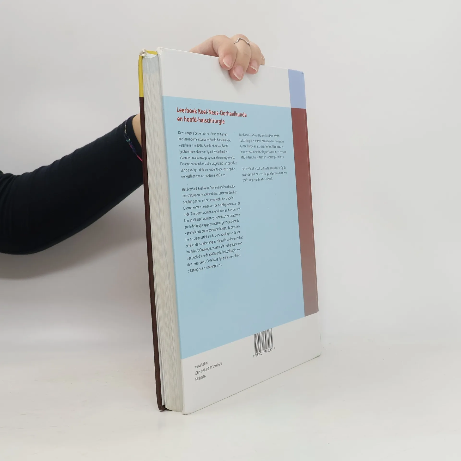 Deze uitgave betreft de herziene editie van Keel-neus-oorheelkunde en hoofd-halschirurgie, verschenen in 2007. Aan dit standaardwerk hebben meer dan veertig uit Nederland en Vlaanderen afkomstige specialisten meegewerkt. De aangeboden leerstof is uitgebreid ten opzichte van de vorige editie en verder toegespitst op het werkgebied van de moderne KNO-arts. Het Leerboek Keel-Neus-Oorheelkunde en hoofd-halschirurgie omvat drie delen. Eerst worden het oor, het gehoor en het evenwicht behandeld. Daarna komen de neus en de neusbijholten aan de orde. Ten slotte worden mond, keel en hals besproken. In elk deel worden systematisch de anatomie en de fysiologie gepresenteerd, gevolgd door de verschillende onderzoeksmethoden, de prevalentie, de diagnostiek en de behandeling van de verschillende aandoeningen. Nieuw is onder meer het hoofdstuk Oncologie, waarin alle maligniteiten op het gebied van de KNO/hoofd-halschirurgie worden besproken. De tekst is rijk geillustreerd met tekeningen en kleurenplaten. Leerboek Keel-Neus-Oorheelkunde en hoofd-halschirurgie is primair bedoeld voor studenten geneeskunde en arts-assistenten. Daarnaast is het een waardevol naslagwerk voor meer ervaren KNO-artsen, huisartsen en andere specialisten. Het leerboek is ook online te raadplegen. Op de website vindt de lezer de gehele inhoud van het boek, aangevuld met casuistiek."