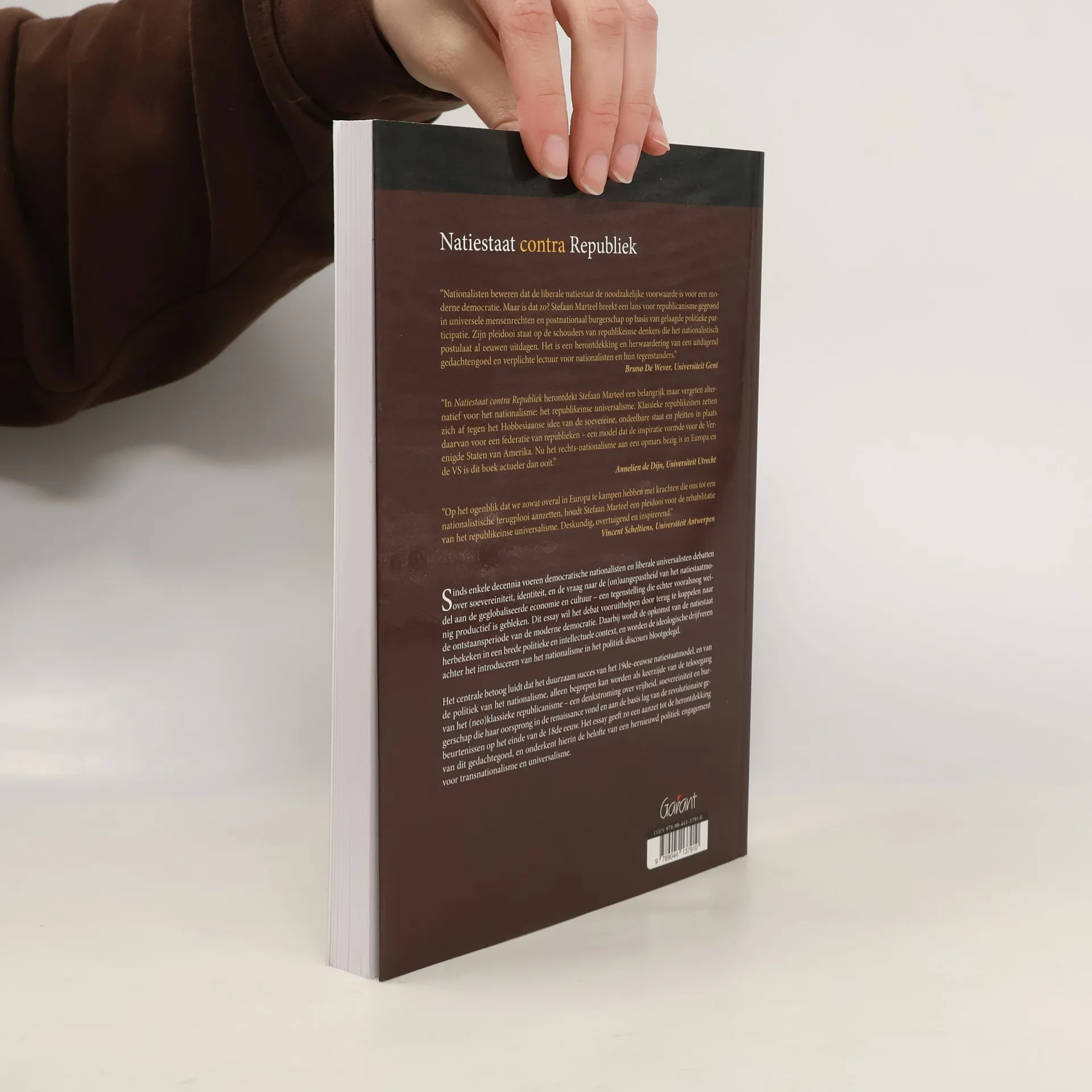 “Nationalisten beweren dat de liberale natiestaat de noodzakelijke voorwaarde is voor een moderne democratie. Maar is dat zo? Stefaan Marteel breekt een lans voor republicanisme gegrond in universele mensenrechten en postnationaal burgerschap op basis van gelaagde politieke participatie. Zijn pleidooi staat op de schouders van republikeinse denkers die het nationalistisch postulaat al eeuwen uitdagen. Het is een herontdekking en herwaardering van een uitdagend gedachtengoed en verplichte lectuur voor nationalisten en hun tegenstanders.” Bruno De Wever, Universiteit Gent “ In Natiestaat contra Republiek herontdekt Stefaan Marteel een belangrijk maar vergeten alternatief voor het nationalisme: het republikeinse universalisme. Klassieke republikeinen zetten zich af tegen het Hobbesiaanse idee van de soevereine, ondeelbare staat en pleitten in plaats daarvan voor een federatie van republieken – een model dat de inspiratie vormde voor de Verenigde Staten van Amerika. Nu het rechts-nationalisme aan een opmars bezig is in Europa en de VS is dit boek actueler dan ooit.” Annelien de Dijn, Universiteit Utrecht “Op het ogenblik dat we zowat overal in Europa te kampen hebben met krachten die ons tot een nationalistische terugplooi aanzetten, houdt Stefaan Marteel een pleidooi voor de rehabilitatie van het republikeinse universalisme. Deskundig, overtuigend en inspirerend.” Vincent Scheltiens, Universiteit Antwerpen Sinds enkele decennia voeren democratische nationalisten en liberale universalisten debatten over soevereiniteit, identiteit, en de vraag naar de (on)aangepastheid van het natiestaatmodel aan de geglobaliseerde economie en cultuur – een tegenstelling die echter vooralsnog weinig productief is gebleken. Dit essay wil het debat vooruithelpen door terug te koppelen naar de ontstaansperiode van de moderne democratie. Daarbij wordt de opkomst van de natiestaat herbekeken in een brede politieke en intellectuele context, en worden de ideologische drijfveren achter het introduceren van het nationalisme in het politiek discours blootgelegd. Het centrale betoog luidt dat het duurzaam succes van het 19de-eeuwse natiestaatmodel, en van de politiek van het nationalisme, alleen begrepen kan worden als keerzijde van de teloorgang van het (neo)klassieke republicanisme – een denkstroming over vrijheid, soevereiniteit en burgerschap die haar oorsprong in de renaissance vond en aan de basis lag van de revolutionaire gebeurtenissen op het einde van de 18de eeuw. Het essay geeft zo een aanzet tot de herontdekking van dit gedachtegoed, en onderkent hierin de belofte van een hernieuwd politiek engagement voor transnationalisme en universalisme. Stefaan Marteel (1977) studeerde geschiedenis aan de Universiteit Gent en behaalde in 2009 zijn doctoraat aan het Europees Universitair Instituut in Firenze. Hij gaf les aan de Radboud Universiteit Nijmegen en is de auteur van The Intellectual Origins of the Belgian Revolution: Political Thought and Disunity in the Kingdom of the Netherlands (Palgrave 2018). Natiestaat contra Republiek is zijn eerste publieksboek .