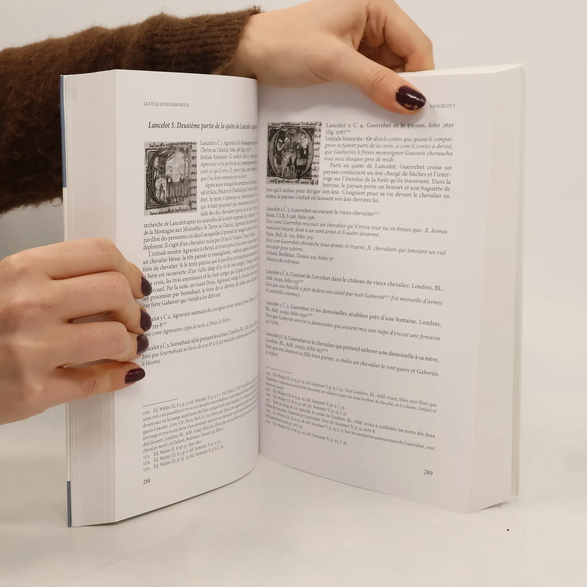 Présentation et commentaire du cycle iconographique du manuscrit BnF, fr. 344, qui offre une lecture remarquable du cycle du Graal et offre de nouvelles pistes pour l'exploration de l'iconographie romanesque à la fin du XIIIe siècle. Le Lancelot-Graal, dont les différentes parties ont été rédigées entre la toute fin du XIIe siècle et la première moitié du XIIIe siècle, constitue l'un des plus grands cycles romanesques en prose du Moyen Âge. Il se compose de cinq branches dont l'ordre diégétique : l'Estoire del Saint Graal, le Merlin et sa Suite, le Lancelot en prose, la Queste del Saint Graal et la Mort Artu, ne suit pas la chronologie de la composition. Le cycle raconte l'histoire du Graal, depuis ses origines et jusqu'à sa conquête par le Bon Chevalier Galaad, et les aventures de Lancelot, héritée du Chevalier de la Charette de Chrétien de Troyes. Il dessine habilement une histoire capable de réunir les temps christiques à ceux du royaume Arthurien et d'embrasser des discours variés issus de la Bible, de la littérature exemplaire, de la pensée théologique et du roman courtois. Plus de cent quarante manuscrits conservent encore aujourd'hui tout ou partie du Lancelot-Graal, ce qui témoigne d'un succès jamais démenti du XIIIe au XVe siècle et d'un prestige dont de nombreux princes et souverains, d'Henri IV de Luxembourg à Jean de Berry et Jacques d'Armagnac, ont voulu se parer. Pourtant, les manuscrits réunissant toutes les branches du cycle sont relativement peu nombreux. Cette étude iconographique se concentre sur les cinq manuscrits les plus anciens comprenant l'intégralité du Lancelot-Graal, produits entre la fin du XIIIe et le début du XIVe siècle : Bonn, ULB, S 526 ; Paris, BnF, fr. 110 et fr. 344 ; Londres, BL, Add. 10292-294 et un volume actuellement dispersé entre plusieurs collections (l'ex-Amsterdam, BPH, ms 1, Manchester, Rylands, ms Fr. 1, et Oxford, Bodleian, Douce 215). Le cycle iconographique de BnF, fr. 344, reproduit dans son intégralité, fait l'objet d'un commentaire systématique. Ce manuscrit d'origine messine ou verdunoise, que l'on peut rapprocher sur le plan stylistique des trésors enluminés de Renaut de Bar, évêque de Metz entre 1302 et 1313, présente plus de trois cents miniatures et initiales historiées. C'est un témoin de l'importance du développement de l'illustration des ouvrages de type profane en langue vernaculaire à partir de la fin du XIIe siècle. Il constitue une lecture attentive et remarquable du cycle du Graal et permet d'explorer sous un angle nouveau la mise en place progressive d'une iconographie proprement romanesque à partir des modèles cléricaux.