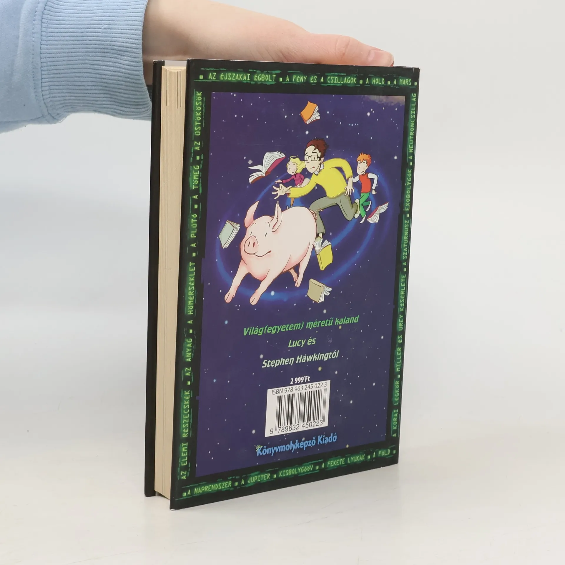 Mikor George találkozik új szomszédaival – Annie-vel, és tudós apjával, Erikkel – rábukkan egy titkos kulcsra, mely új, rejtett ablakot nyit számára a világra. Mégpedig a világűrből! Eriké a világ legfejlettebb számítógépe, a szuperintelligens Kozmosz, aki George-ot és barátait az univerzum bármely pontjára képes elrepíteni. George egyszercsak egy hullámvasúton találja magát, ami a végtelen világűrben száguldozik vele: bolygók mellett suhannak el, egy aszteroida viharon vágnak keresztül, egészen a Naprendszer legszéléig, és még azon is túl. De valaki másnak is tervei vannak Kozmoszszal – és ezek a tervek szörnyű veszélybe sodorják Eriket és George-ot. Mert nincs a világűrben semmi, ami veszélyesebb lenne a fekete lyuknál… Ez az ínycsiklandó könyvmolyeledel egy izgalmas és humoros kaland alapján készült, Stephen Hawking-módra. A legújabb fekete lyukakkal foglalkozó elméletek felhasználásával, és érdekfeszítő tudományos ismeretekkel fűszerezve a világűrről és a bolygókról. És a hab a tortán, hogy rengeteg valódi fotót találhatunk benne a világűrről!