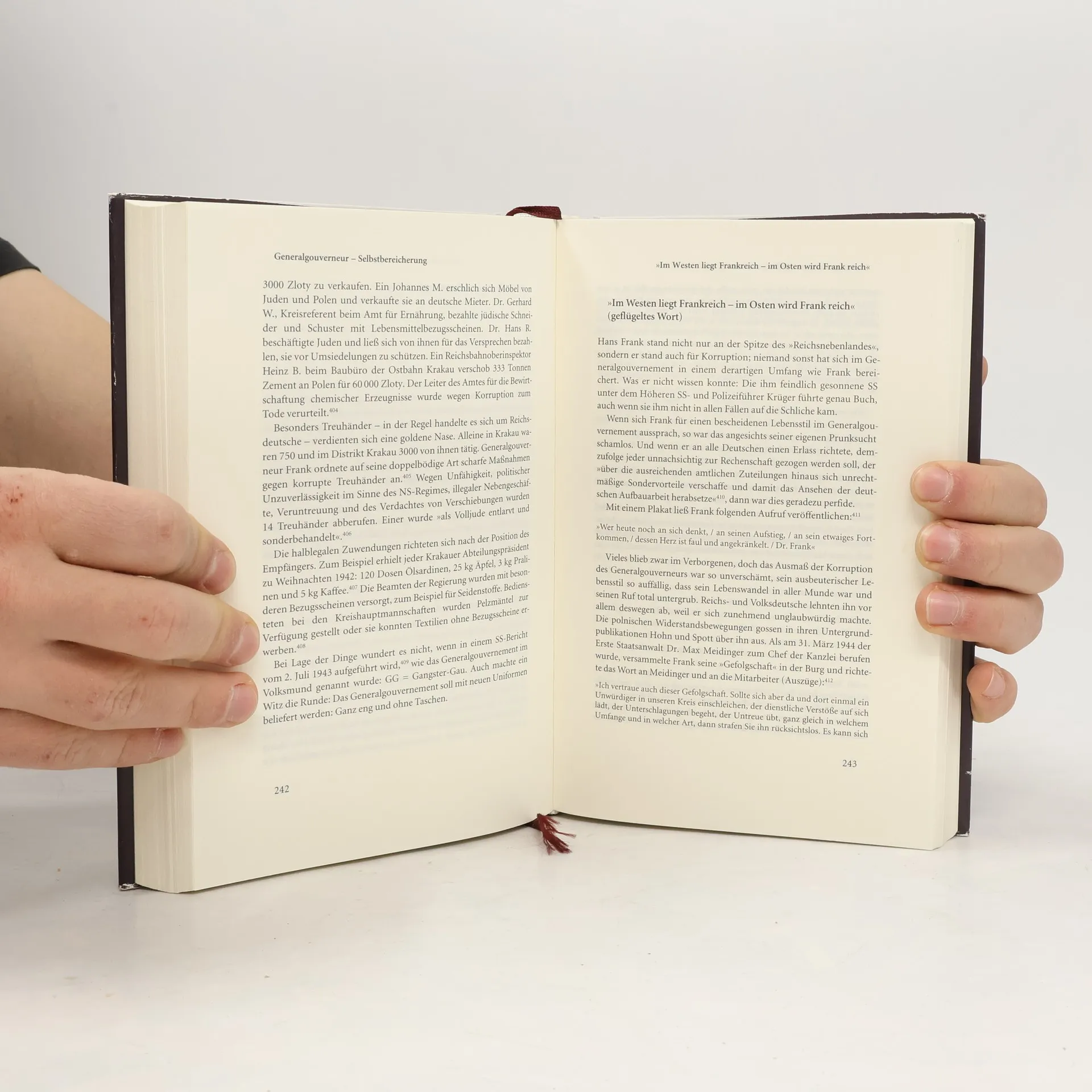Die Biographie eines fanatischen NS-Karrieristen: In der „Kampfzeit“ vertrat Hans Frank seinen „Führer“ vor Gericht; 1933 wurde er bayerischer Justizminister und Reichskommissar für die Gleichschaltung der Justiz. Gnadenlos „säuberte“ er seinen eigen Berufsstand und machte als Reichsminister (ab 1934) und Präsident der von ihm gegründeten Akademie für Deutsches Recht das Unrecht zur Geschäftsgrundlage des NS-Staates. 1939 wurde er Generalgouverneur im besetzten Polen. Er war besessen von Prunk und Pomp und zählte zu den korruptesten Führern des Dritten Reichs. Weil er auch am millionenfachen Mord an Juden und anderen 'Missliebigen' beteiligt war, wurde er 1946 in Nürnberg als Hauptkriegsverbrecher angeklagt und am 10.6.1946 hingerichtet.