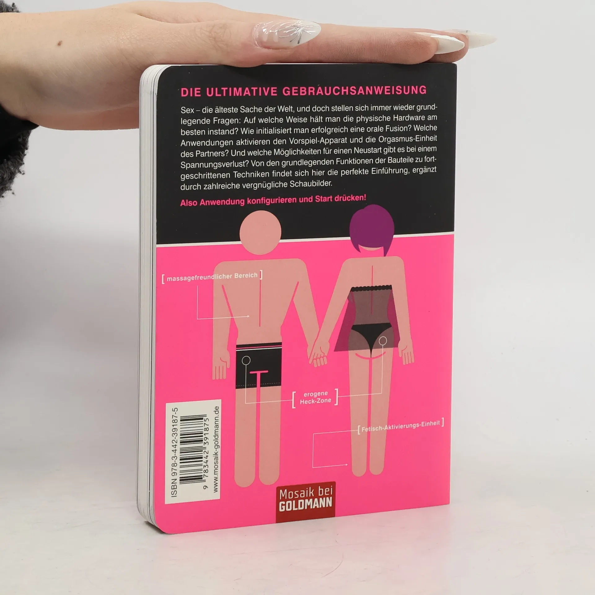 Sexy „Gebrauchsanleitungen“ mit witzigen und ausgeklügelten Illustrationen „Sex – Betriebsanleitung“ gibt endlich Antwort auf die grundlegenden Fragen zum richtigen Durchführen von Sex: Wie installiert man den perfekten Verführungsbereich? Auf welche Weise hält man die physische Hardware für optimalen Gebrauch am besten instand? Wie initialisiert man erfolgreich eine orale Schnittstelle? Welche Anwendungen aktivieren den Vorspiel-Apparat und die Orgasmus-Einheit des Partners? Und welche Möglichkeiten für einen Neustart gibt es bei einem Spannungsabfall? Von den grundlegenden Funktionen der Bauteile zu fortgeschrittenen Techniken wie Sexspielzeug und Kama Sutra finden sich hier die perfekte Einführung zum Thema, ergänzt durch Experten-Tipps und zahlreiche Schaubilder. Also Anwendung konfigurieren und Start drücken! Das perfekte Geschenk – bester Partygag! Ausstattung: 2-farbig