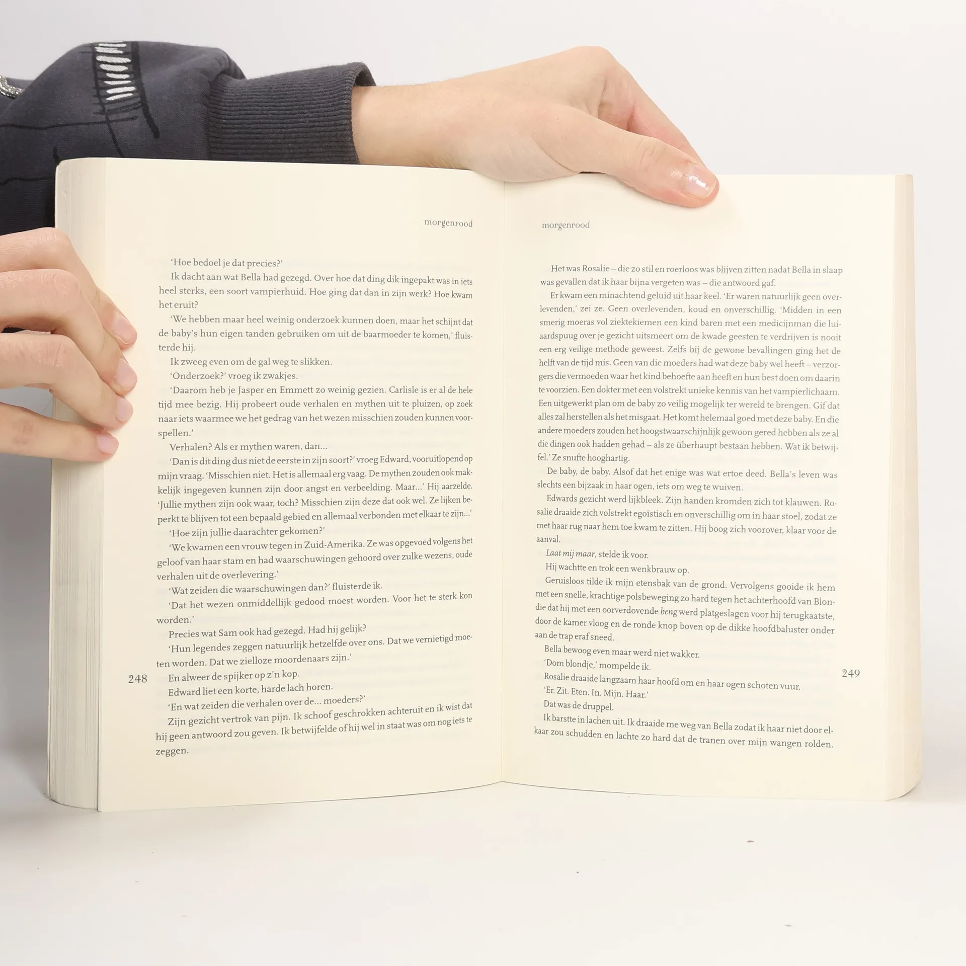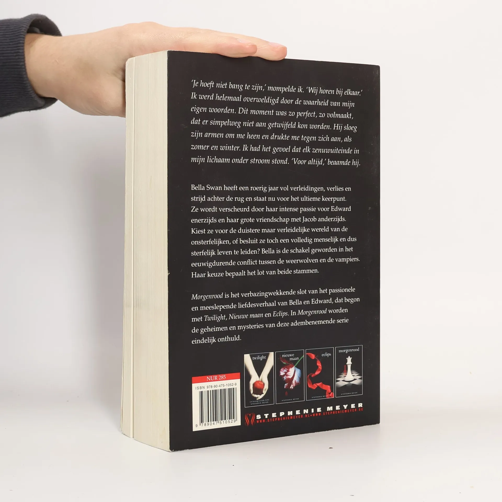 Bella Swan heeft een roerig jaar vol verleidingen, verlies en strijd achter de rug en staat nu voor het ultieme keerpunt. Ze wordt verscheurd door haar intense passie voor Edward enerzijds en haar grote vriendschap met Jacob anderzijds. Kiest ze voor de duistere maar verleidelijke wereld van de onsterfelijken, of besluit ze toch een volledig menselijk en dus sterfelijk leven te leiden? Bella is de schakel geworden in het eeuwigdurende conflict tussen de weerwolven en de vampiers. Haar keuze bepaalt het lot van beide stammen. Morgenrood is het verbazingwekkende slot van het passionele en meeslepende liefdesverhaal van Bella en Edward, dat begon met Twilight, Nieuwe maan en Eclips. In Morgenrood worden de geheimen en mysteries van deze adembenemende serie eindelijk onthuld.
