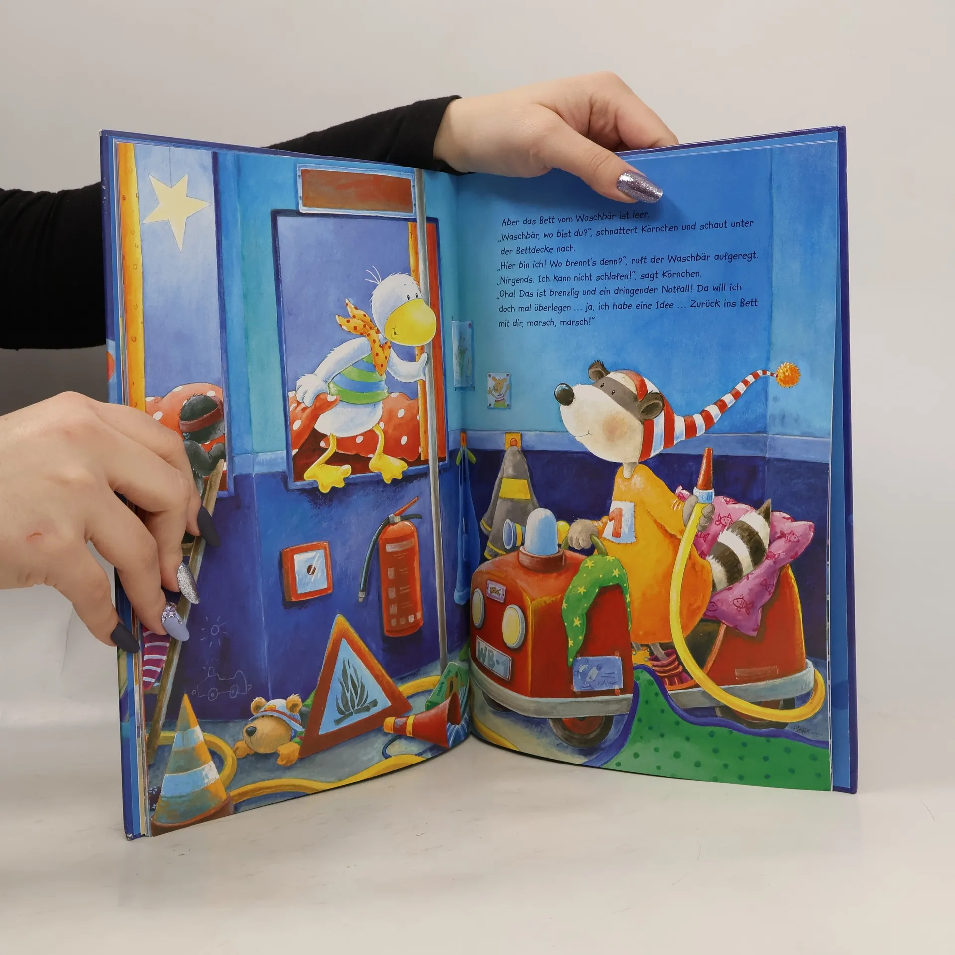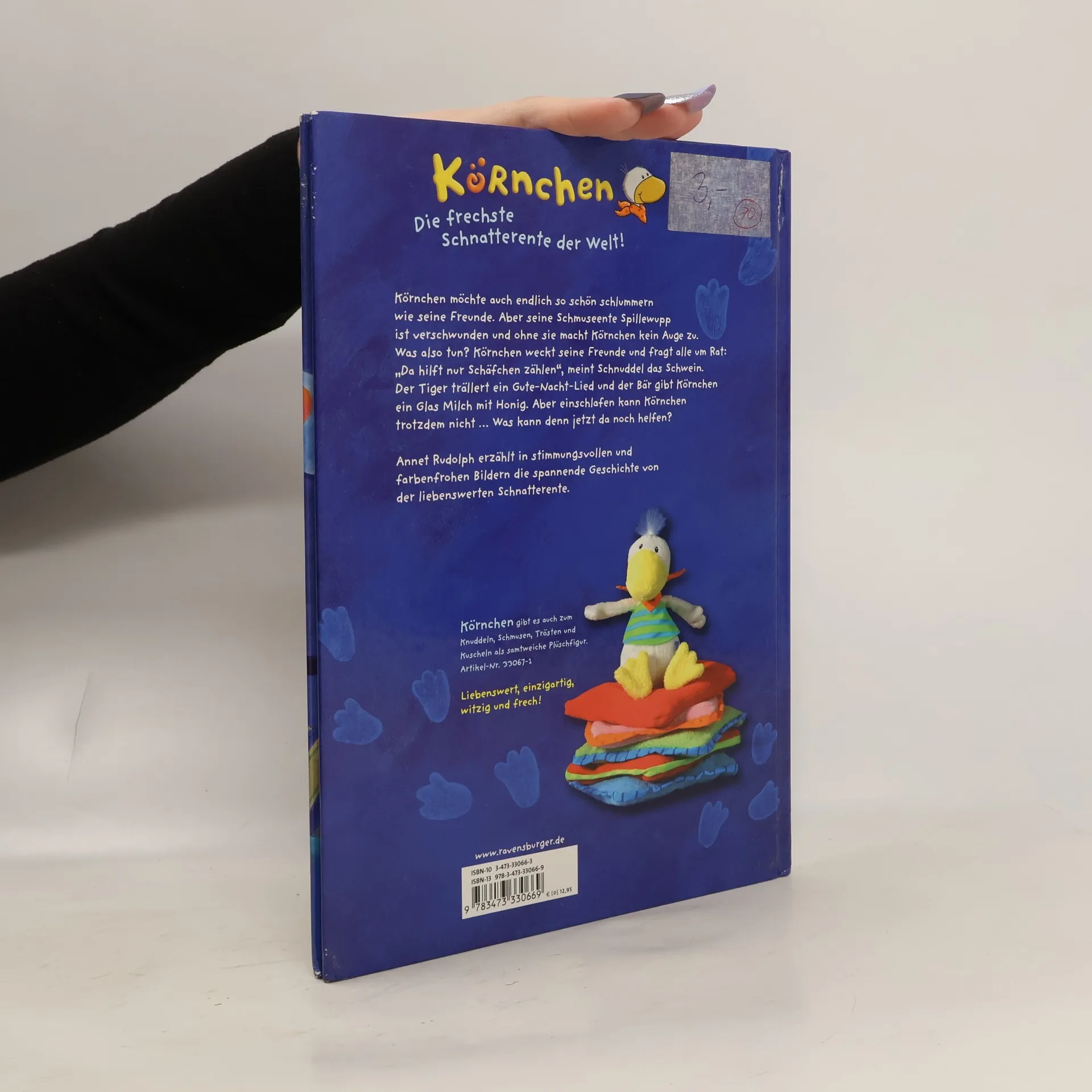 Körnchen ist ratlos: Wo ist denn nur seine Schmuseente Spillewupp hingekommen, Ohne die kann Körnchen nämlich nicht einschlafen. Die kleine Schnatterente macht sich zu später Stunde auf den Weg und fragt all ihre Freunde nach Einschlaftipps. "Da hilft nur Schäfchen zählen", meint Schnuddel das Schwein. Der Tiger trällert ein Gute-Nacht-Lied und der Bär macht sogar Milch mit Honig. Tapfer probiert Körnchen alles aus, Aber einschlafen kann Körnchen trotzdem nicht ... Was kann denn jetzt noch helfen ...?