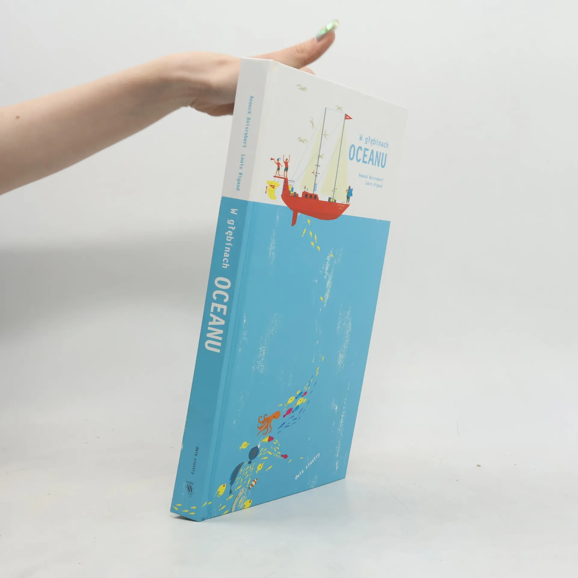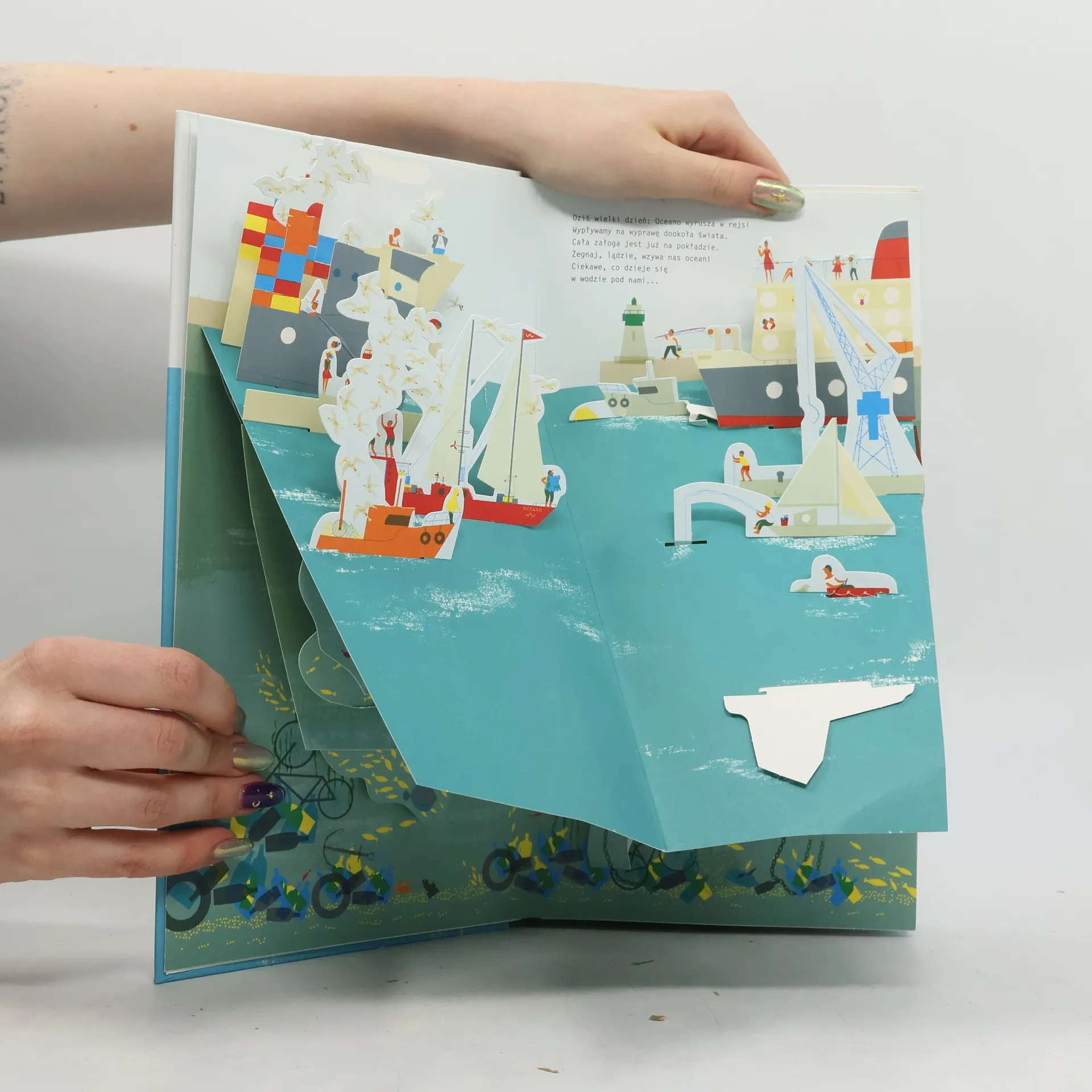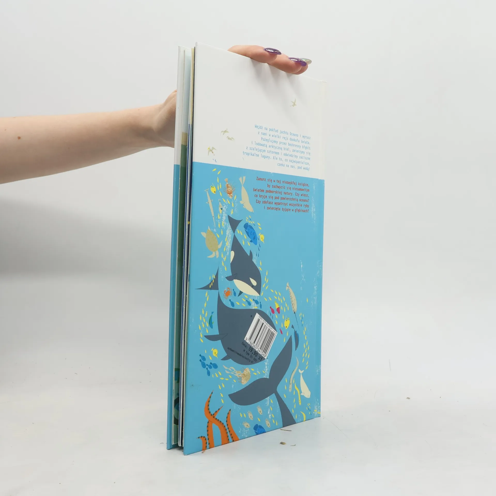 Pop-up o pięknie podmorskiej przyrody. Wejdź na pokład jachtu Oceano i wyrusz z nami w wielki rejs dookoła świata. Pożeglujemy przez bezkresny błękit i lodowatą arktyczną biel, zmierzymy się z szalejącym sztormem i odwiedzimy zaciszne tropikalne laguny. Ale to, co najwspanialsze, czeka na nas… pod wodą! Zanurz się w tej niezwykłej książce, by zachwycić się niesamowitym światem podmorskiej natury. Czy wiesz, co kryje się pod powierzchnią oceanu? Czy zdołasz wypatrzyć wszystkie ryby i zwierzęta żyjące w głębinach?