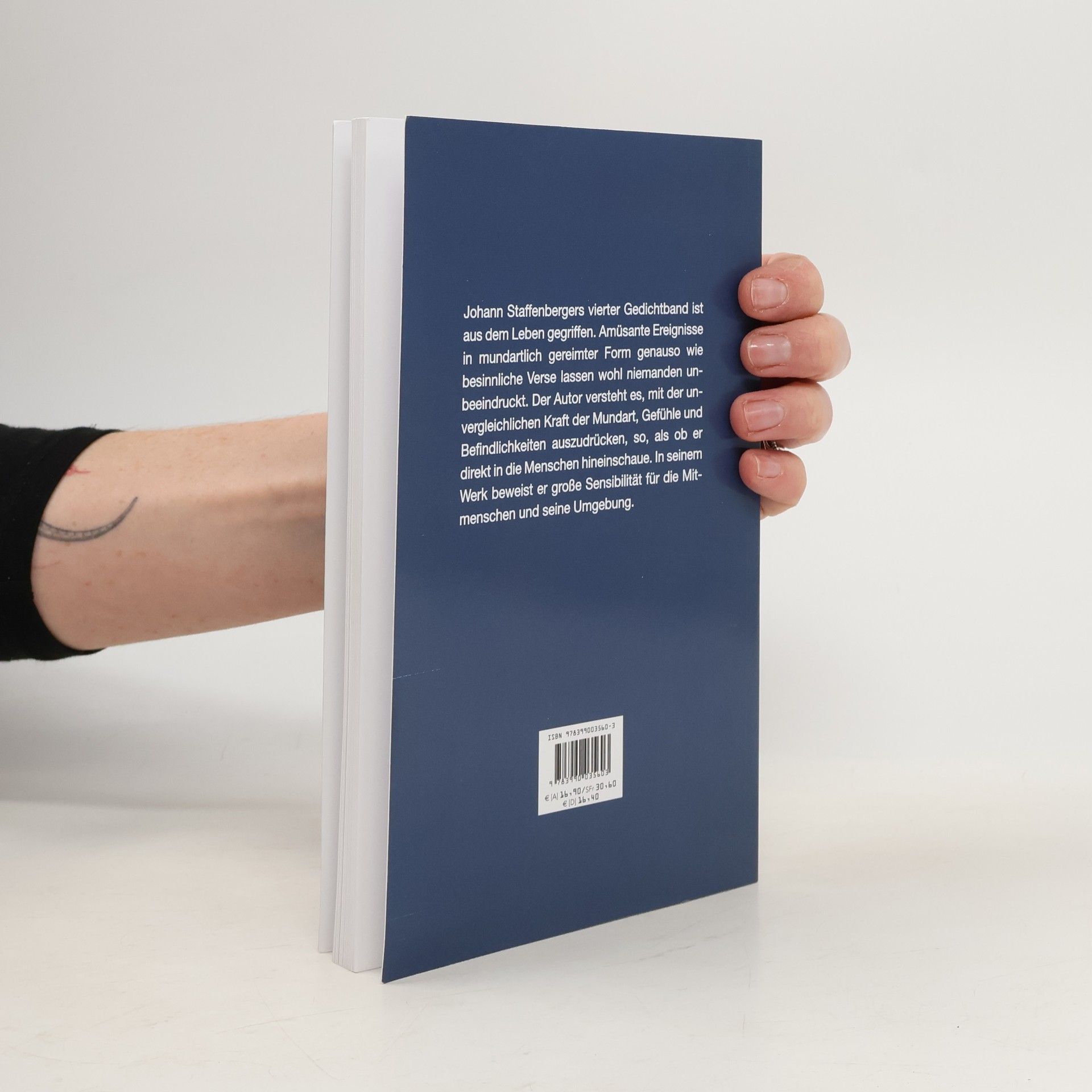 Johann Staffenbergers vierter Gedichtband ist aus dem Leben gegriffen. Amüsante Ereignisse in mundartlich gereimter Form genauso wie besinnliche Verse lassen wohl niemanden unbeeindruckt. Der Autor versteht es, mit der unvergleichlichen Kraft der Mundart, Gefühle und Befindlichkeiten auszudrücken, so, als ob er direkt in die Menschen hineinschaue
