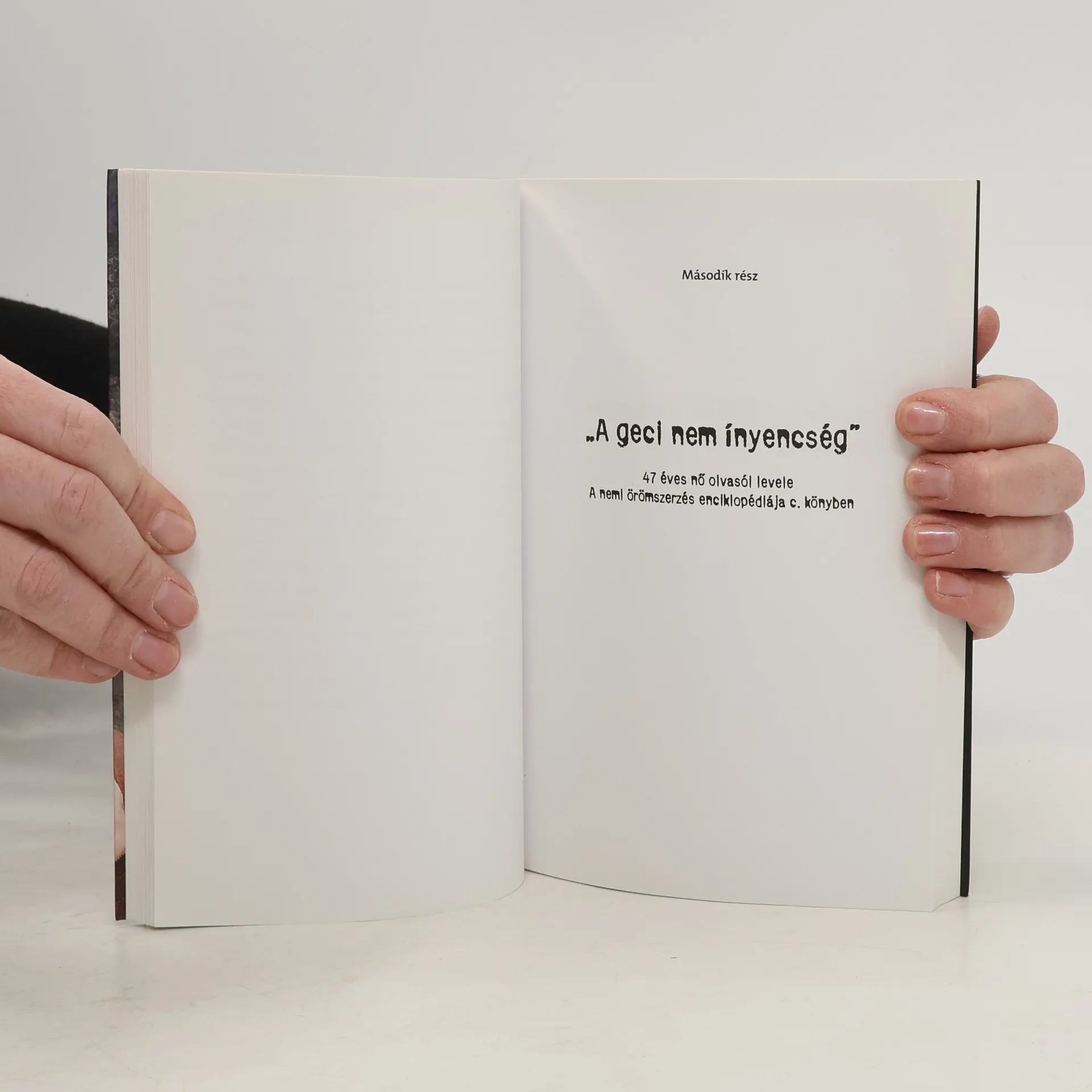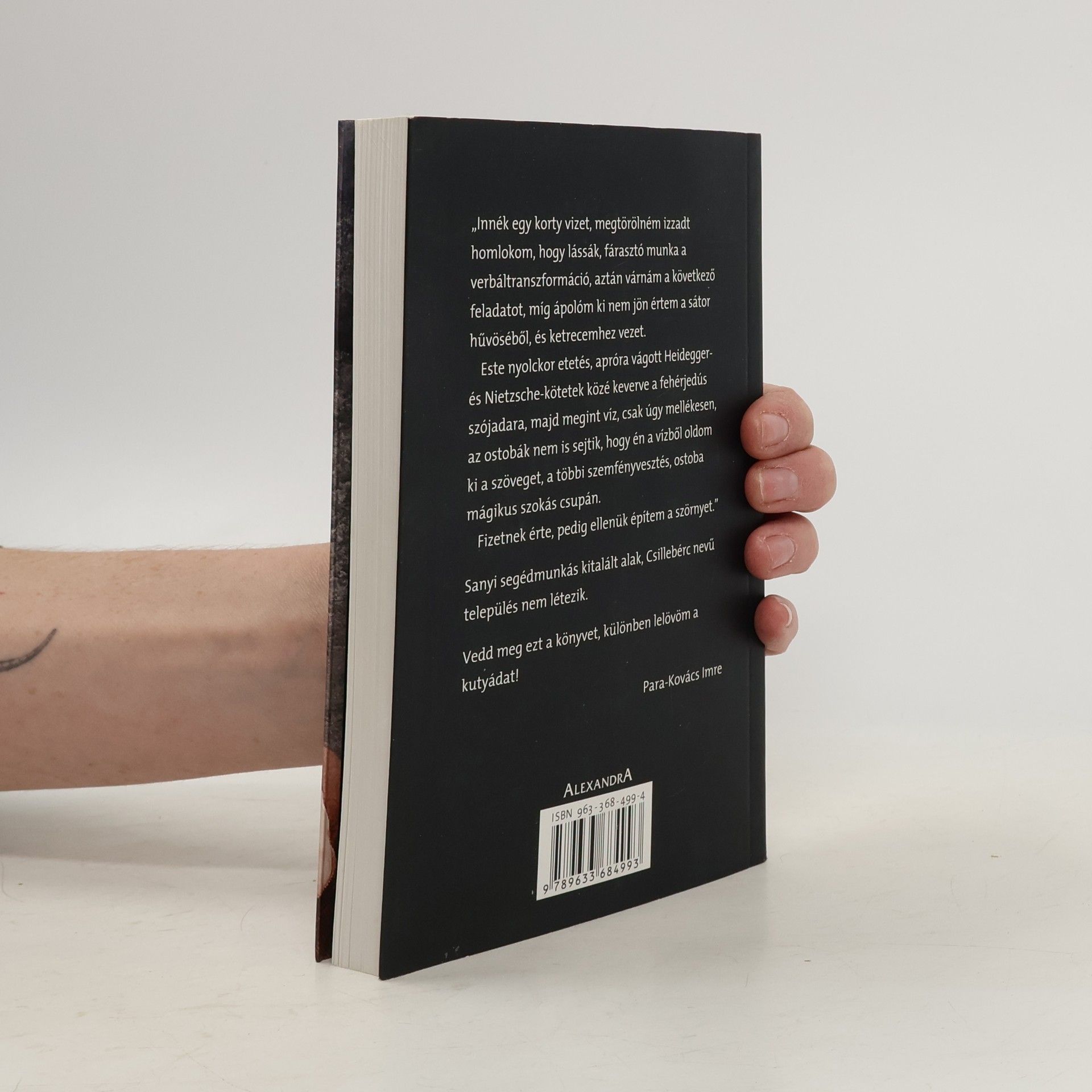 "Innék egy korty vizet, megtörölném izzadt homlokom, hogy lássák, fárasztó munka a verbáltranszformáció, aztán várnám a következő feladatot, míg ápolóm ki nem jön értem a sátor hűvöséből, és ketrecemhez vezet.Este nyolckor etetés, apróra vágott Heidegger- és Nietzsche-kötetek közé keverve a fehérjedús szójadara, majd megint víz, csak úgy mellékesen, az ostobák nem is sejtik, hogy én a vízből oldom ki a szöveget, a többi szemfényvesztés, ostoba mágikus szokás csupán.Fizetnek érte, pedig ellenük építem a szörnyet."Sanyi segédmunkás kitalált alak, Csillebérc nevű település nem létezik.Vedd meg ezt a könyvet, különben lelövöm a kutyádat! (Para-Kovács Imre)