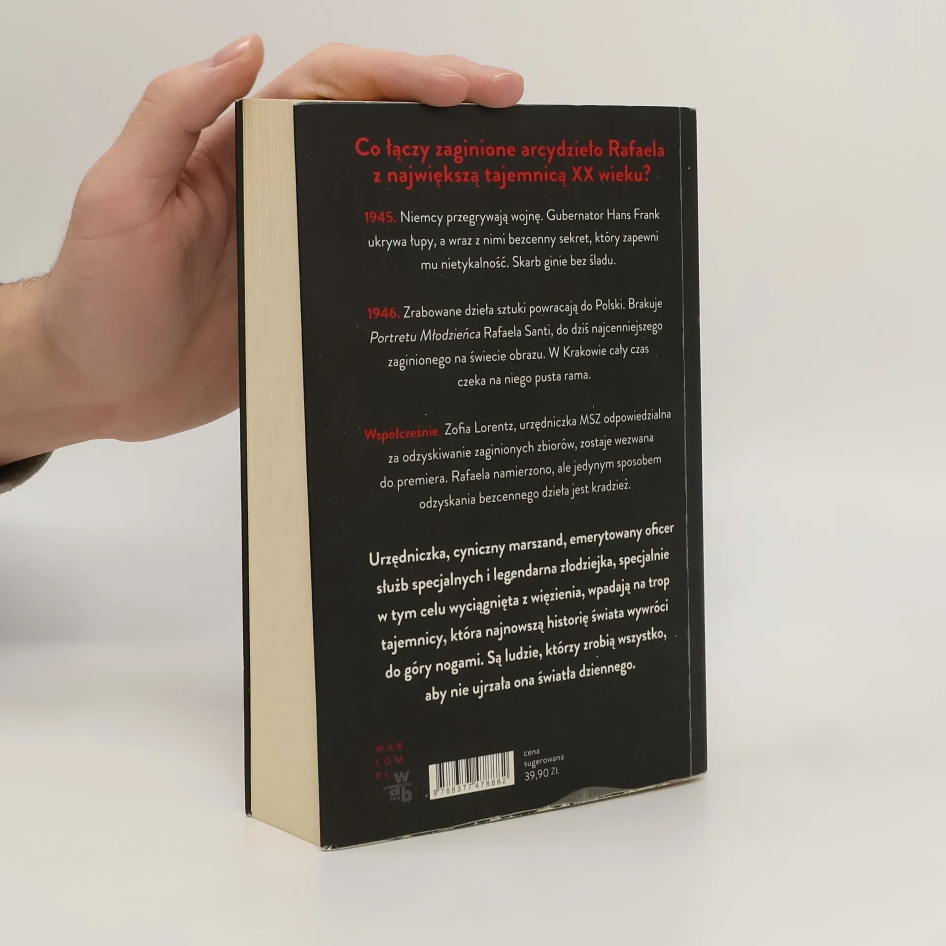 1945. Niemcy przegrywają wojnę, każdy myśli tylko o sobie. Generalny Gubernator Hans Frank ukrywa najcenniejsze łupy, a wraz z nimi bezcenny sekret, który ma zapewnić mu nietykalność po wojnie. Skarb ginie bez śladu w tajemniczych okolicznościach. 1946. Do Polski powracają zrabowane dzieła sztuki z Damą z Gronostajem Leonarda da Vinci na czele. Brakuje Portretu Młodzieńca Rafaela Santi, który od tej pory pozostaje najcenniejszym zaginionym na świecie dziełem sztuki i symbolem grabieży dokonanych w czasie II Wojny Światowej. W Muzeum Czartoryskich w Krakowie od ponad sześćdziesięciu lat na Rafaela czeka pusta rama. Współcześnie. Doktor Zofia Lorentz, historyk sztuki i urzędniczka Ministerstwa Spraw Zagranicznych, próbująca sprawić, aby do Polski wróciło choć kilka z ponad 60 000 zaginionych dzieł, zostaje wezwana do kancelarii premiera. Sprawa jest pilna i ściśle tajna. Arcydzieło Rafaela zostało w końcu namierzone, a ona musi odzyskać je dla Polski. Legalna droga nie wchodzi w grę. Jedynym możliwym sposobem jest kradzież. Zofia podejmuje się zadania. Do jej zespołu dołączają cyniczny młody marszand, świeżo emerytowany oficer służb specjalnych i legendarna szwedzka złodziejka, specjalnie w tym celu wyciągnięta z więzienia.