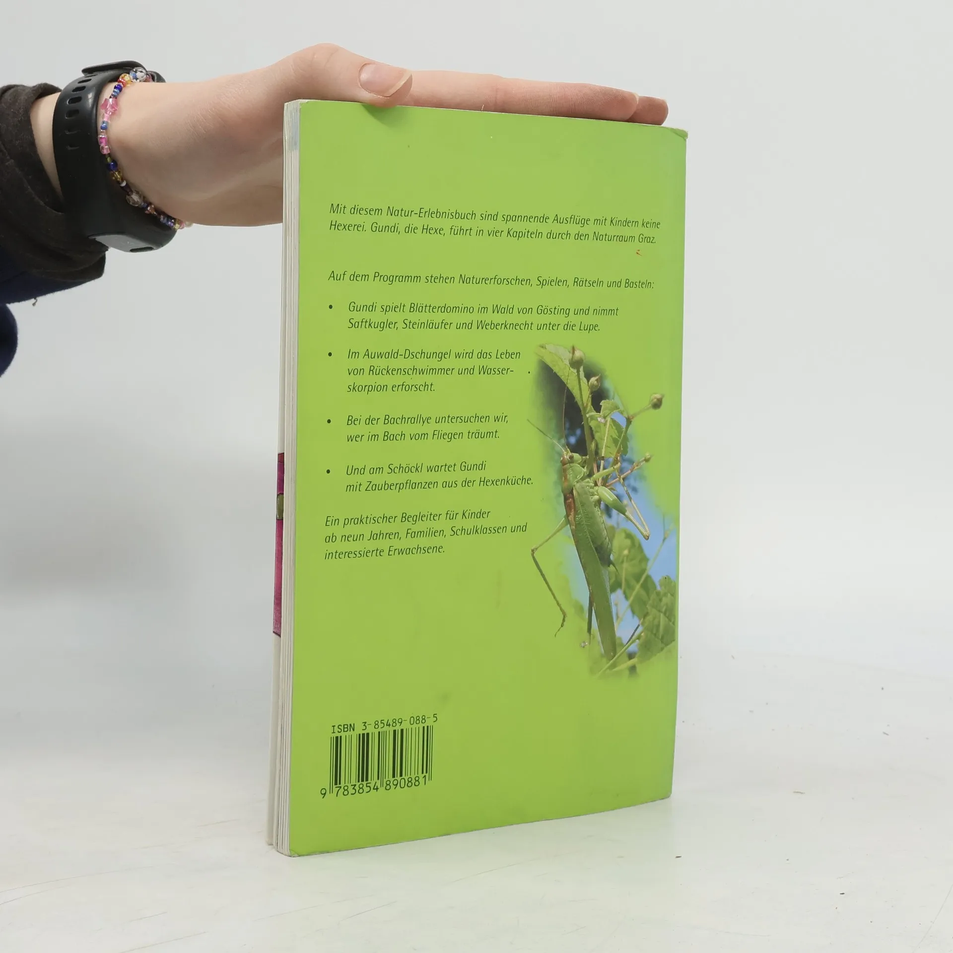 Mit dem neuen Natur-Erlebnisbuch sind spannende Ausflüge mit Kindern keine Hexerei. Gundi, die Hexe, führt in vier Kapiteln durch den Naturraum Graz. Beim Spielen, Rätseln und Basteln wird Naturforschen kinderleicht. Zu jedem Ausflugsprogramm gibt es die genaue Wegbeschreibung mit Karte, Informationen und Bestimmungshilfen für häufige Tier- und Pflanzenarten. Ein praktischer Begleiter für Kinder ab neun Jahren, Familien, Schulklassen und interessierte Erwachsene. Ausgerüstet mit Dosenlupe, Kescher und einigen einfachen Haushaltsmaterialien erkunden wir die Tier- und Pflanzenwelt. Im Wald von Gösting spielt Gundi Blätterdomino und nimmt Saftkugler, Steinläufer und Weberknecht unter die Lupe. Bei der Bachralley untersuchen wir, warum die Rettenbachklamm eigentlich keine Klamm ist und wer im Bach vom Fliegen träumt. Die „Tour de Mur“ führt in den Auwald-Dschungel. Statt Radlrekorde zu brechen, wird das Leben von Rückenschwimmer und Wasserskorpion erforscht. Und am Schöckl wartet Gundi mit Zauberpflanzen aus der Hexenküche. Sogar Kuhfladen bieten hier Interessantes für kleine Forscher: Tritt daneben, schau hinein!