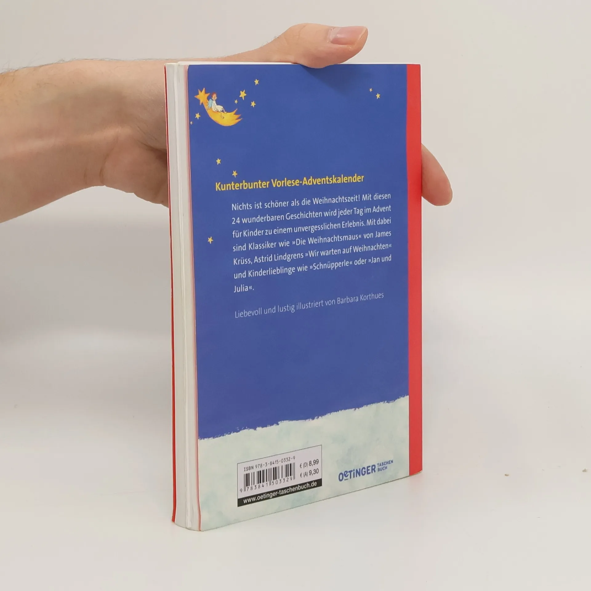 24 herrlich weihnachtliche Geschichten zum Vorlesen verkürzen den Kindern die Wartezeit aufs Fest. Mit dabei sind Klassiker wie 'Die Weihnachtsmaus' von James Krüss, Astrid Lindgrens 'Bald ist Weihnachten' und Kinderlieblinge wie 'Schnüpperle' oder 'Jan und Julia'. Erhard Dietl erzählt von 'Bärenstarken Weihnachten', Elisabeth Zöller von 'Konrad Meckerbär' und Isabel Abedi von der wundersamen Reise des Raben Rasputin zu Mirabella Hexenkind.