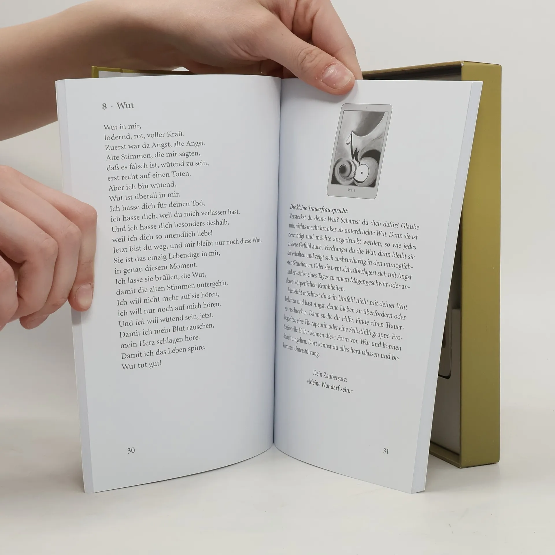 Trauer leben – frei werden für einen neuen Anfang Aus eigener, leidvoller Erfahrung wissen die beiden Autorinnen, wie sehr nicht gelebte Trauer uns hindert, den Verlust des geliebten Menschen in unser Leben zu integrieren und uns damit frei zu machen. Mit diesem Kartendeck geben sie den Trauernden ein Hilfsmittel an die Hand, die Trauer in all ihren Facetten – mit ihrer Wut, ihren Tränen und ihrer Verzweiflung – zu durchleben, bis das Unabänderliche endlich angenommen werden kann. Das Werk umfaßt ein Set aus 24 Karten mit Begleitbuch. Die Karten präsentieren die verschiedensten Gefühle, die man durchlebt, wenn man einen geliebten Menschen verloren hat.