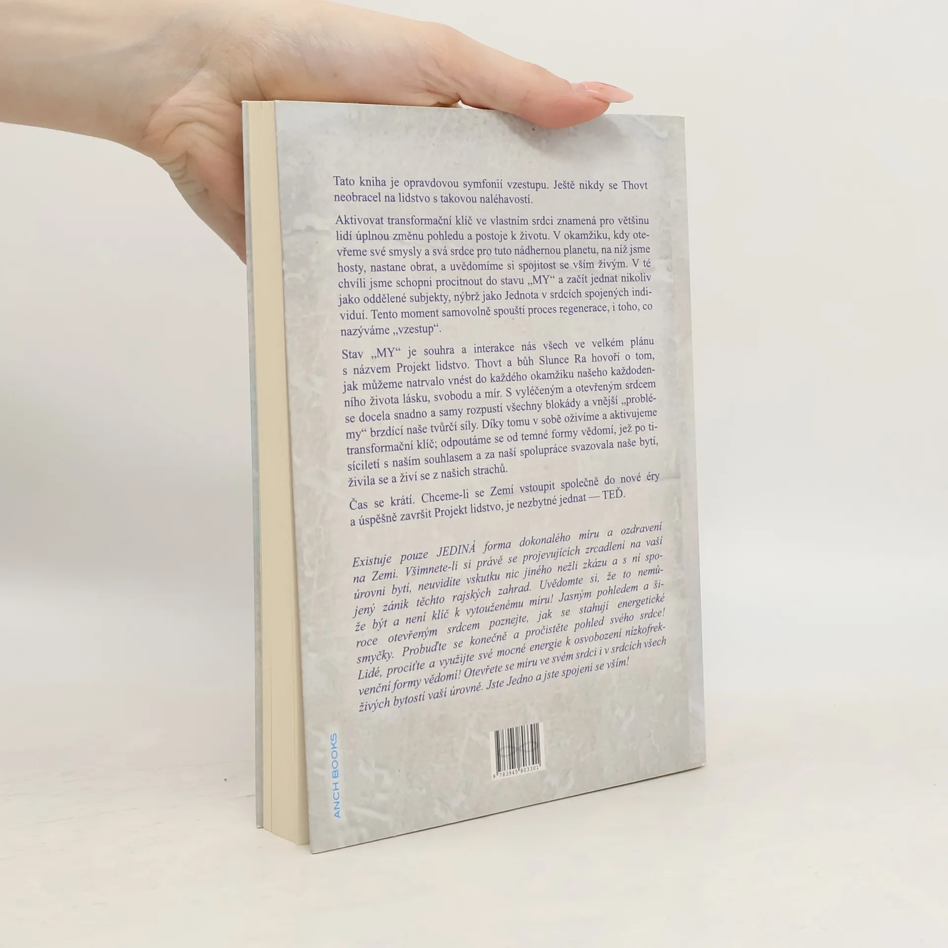 Tato kniha je opravdovou symfonií vzestupu. Ještě nikdy se Thovt neobracel na lidstvo s takovou nalé havostí. Aktivovat transformační klíč ve vlastním srdci znamená pro většinu lidí úplnou změnu pohledu a postoje k životu. V okamžiku, kdy otevřeme své smysly a svá srdce pro tuto nádhernou planetu, na níž jsme hos¬ty, nastane obrat, a uvědomíme si spojitost se vším živým. V té chvíli jsme schopni procitnout do stavu „MY“ a začít jednat nikoliv jako oddělené subjekty, nýbrž jako Jednota v srdcích spojených individuí. Tento moment samovolně spouští proces regenerace, i toho, co nazýváme „vzestup“. Stav „MY“ je souhra a interakce nás všech ve velkém plánu s názvem Projekt lidstvo. Thovt a bůh Slunce Ra hovoří o tom, jak můžeme natrvalo vnést do každého okamžiku našeho každodenního života lásku, svobodu a mír. S vyléčeným a otevřeným srdcem se docela snadno a samy rozpustí všechny blokády a vnější „problémy“ brzdící naše tvůrčí síly. Díky tomu v sobě oživíme a aktivujeme transformační klíč; odpoutáme se od temné formy vědomí, jež po tisíciletí s naším souhlasem a za naší spolupráce svazovala naše bytí, živila se a živí se z našich strachů. Čas se krátí. Chceme-li se Zemí vstoupit společně do nové éry a úspěšně završit Projekt lidstvo, je ne¬zbytné jednat — TEĎ.