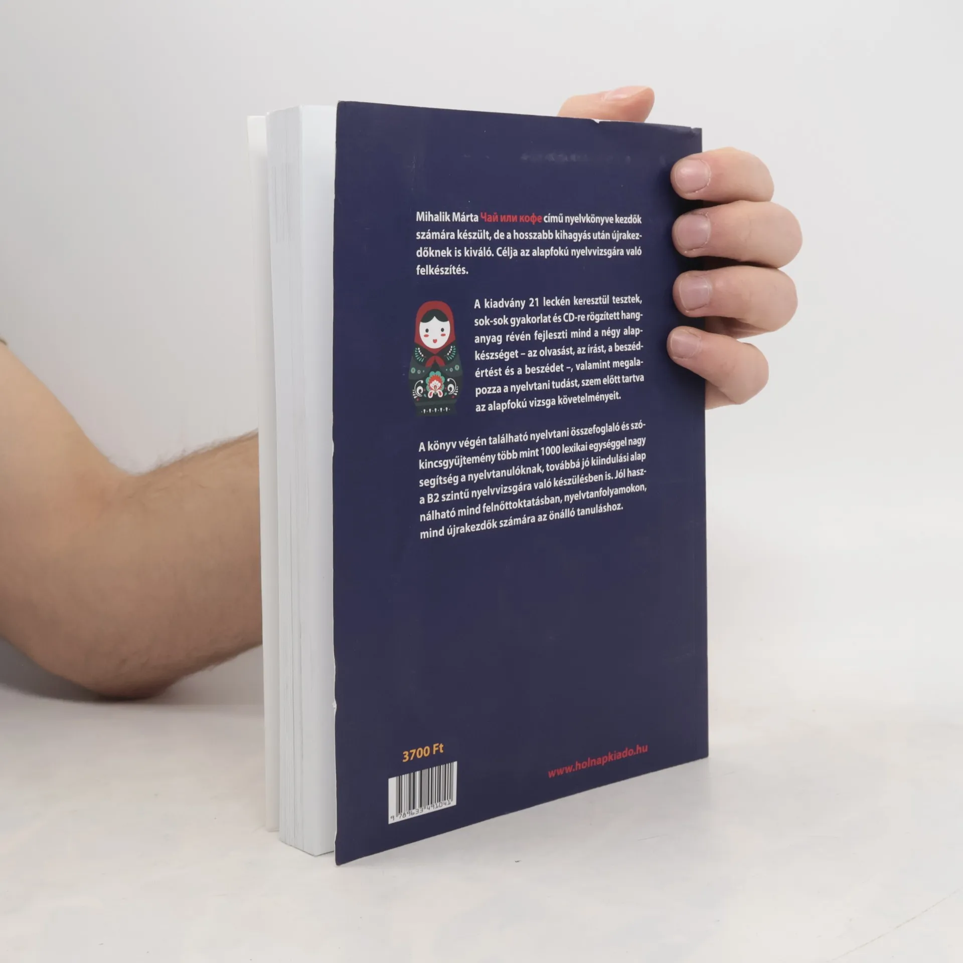 Mihalik Márta Чай или кофе? című nyelvkönyve kezdők számára készült, de a hosszabb kihagyás után újrakezdőknek is kiváló. Célja az alapfokú nyelvvizsgára való felkészítés.A kiadvány 21 leckén keresztül tesztek, sok-sok gyakorlat és CD-re rögzített hanganyag révén fejleszti mind a négy alapkészséget – az olvasást, az írást, a beszédet és a beszédértést –, valamint megalapozza a nyelvi tudást, szem előtt tartva az alapfokú vizsga követelményeit.A könyv végén található nyelvtani összefoglaló é s szókincsgyűjtemény több mint 1000 lexikai egységgel nagy segítség a nyelvtanulóknak, továbbá jó kiindulási alap a B2 szintű nyelvvizsgára való készülésben is. A könyv jól használható mind felnőttoktatásban, nyelvtanfolyamokon, mind újrakezdők számára az önálló tanuláshoz.
