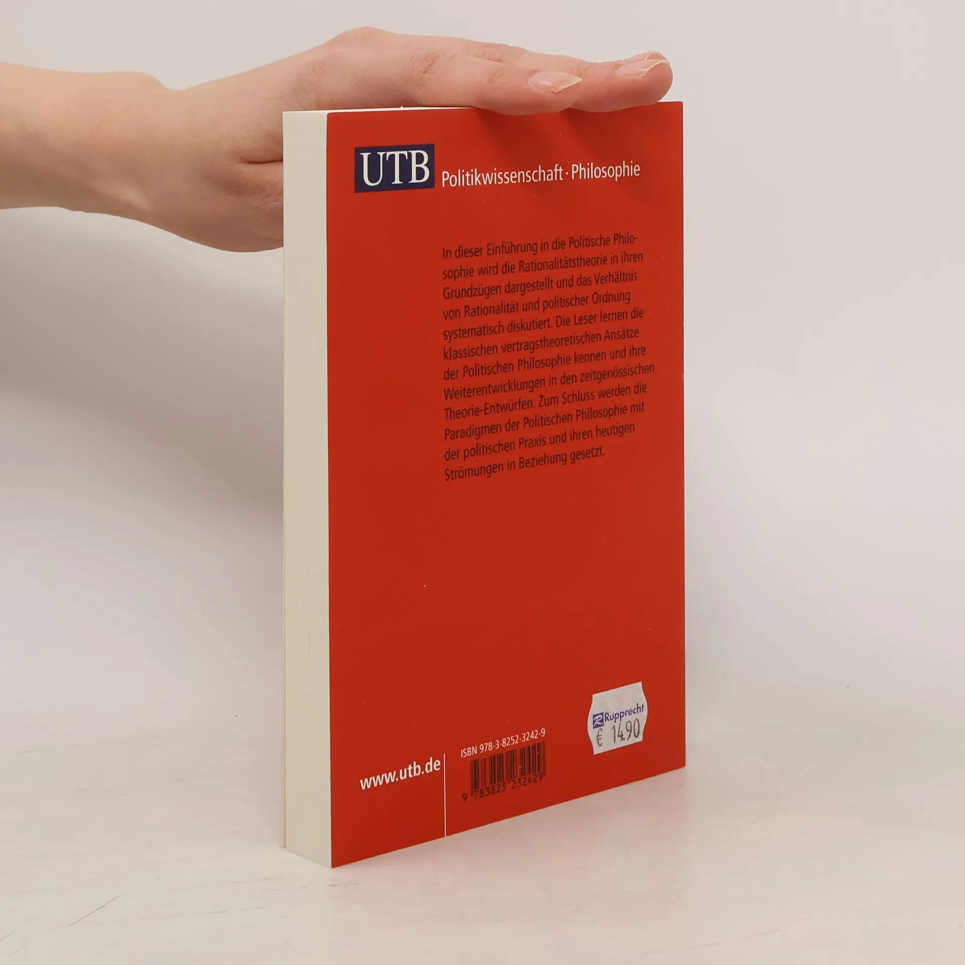 Vorwort§§Teil I: Individuelle Rationalität§§1. Kapitel: Das entscheidungstheoretische Grundmodell§§2. Kapitel: Nutzen und Wahrscheinlichkeit§§3. Kapitel: Das Kooperationsdilemma§§Teil II: Kollektive Rationalität§§4. Kapitel: Das Problem kollektiver politischer Entscheidungsfindung§§5. Kapitel: Der Konflikt von Liberalität und Rationalität§§6. Kapitel: Strukturelle Rationalität§§Teil III: Klassische Paradigmen politischer Ordnung§§7. Kapitel: Kontraktualismus allgemein§§8. Kapitel: Thomas Hobbes - Rationales Eigeninteresse§§9. Kapitel: John Locke - Wahrung der Individualrechte§§10. Kapitel: Jean-Jacques Rousseau - Republik als sittliche Körperschaft§§11. Kapitel: Immanuel Kant - Politische Ordnung als universelle moralische Pflicht§§Teil VI: Zeitgenössische Paradigmen politischer Ordnung§§12. Kapitel: David Gauthier - Eigeninteressierter Liberalismus§§13. Kapitel: Robert Nozick - Eigentumsrechte-basierter Libertarismus§§14. Kapitel: John Rawls - Universalistischer Liberalismus§§Teil V: Philosophie der Demokratie§§15. Kapitel: Demokratie als Kooperation§§16. Kapitel: Demokratie und Wahrheit§§17. Kapitel: Konzeptionen der politischen Philosophie und Positionen politischer Praxis§§Personenregister